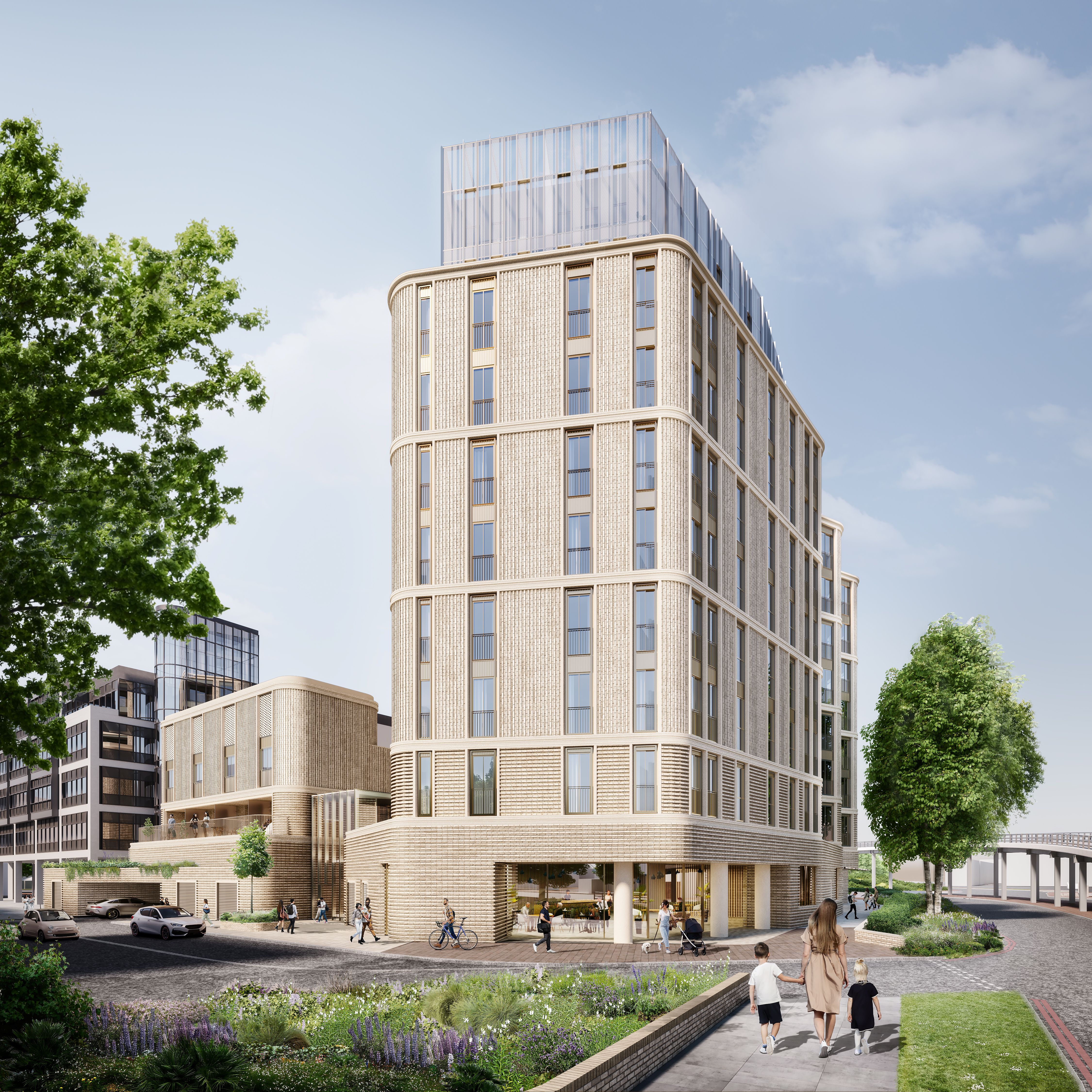 At ground and first floor levels, a clearly articulated horizontal plinth introduces recessed entrances and defines the 314 sqm of commercial space. Together with enhancements to the surrounding public realm, this active frontage establishes a welcoming threshold and contributes to a vibrant streetscape.
