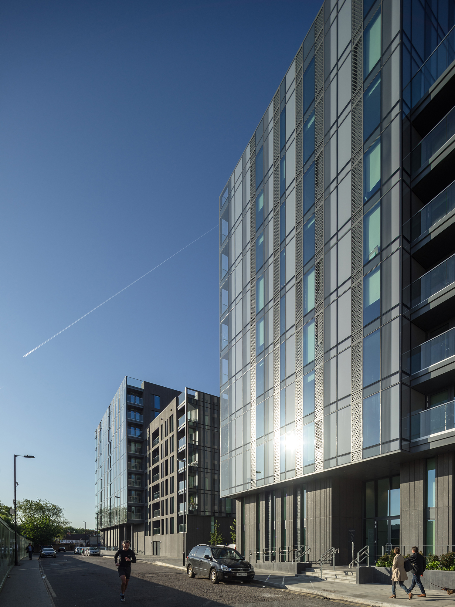 The façades offer an air of elegance. Dark concrete panels, acid-etched to expose the aggregate giving a hint of sparkle, have a refined vertical grain formed from a relief pattern of striations imitating panel joints, and the expressed mullion of the curtain walling screens. The buildings animate the street with a series of duplex townhouses fronted by landscaped ‘privacy’ buffers. The community centre acts as a gateway to the neighbouring school with which the space is shared, located at the end of the terrace of town houses on Llewellyn Street.