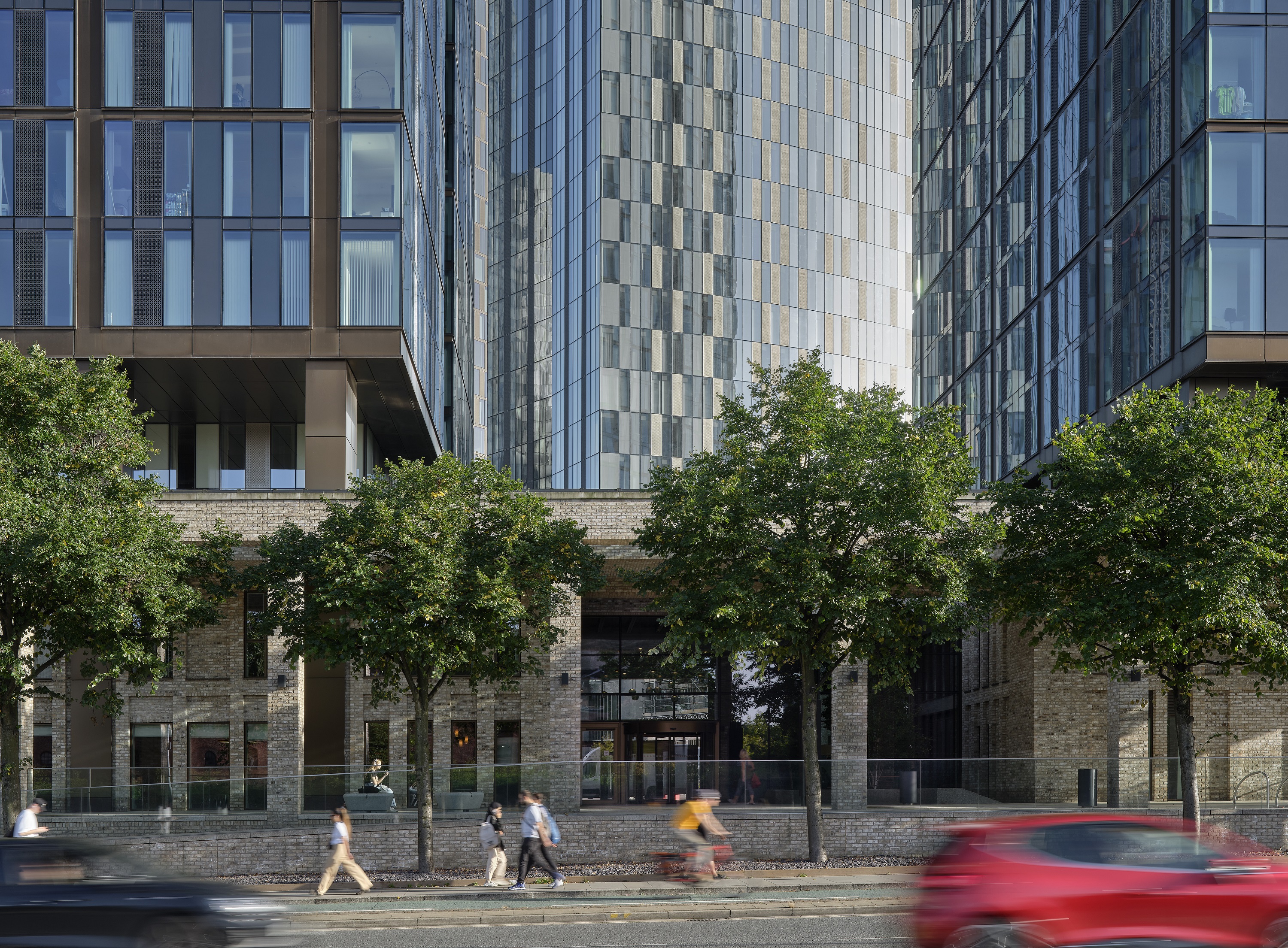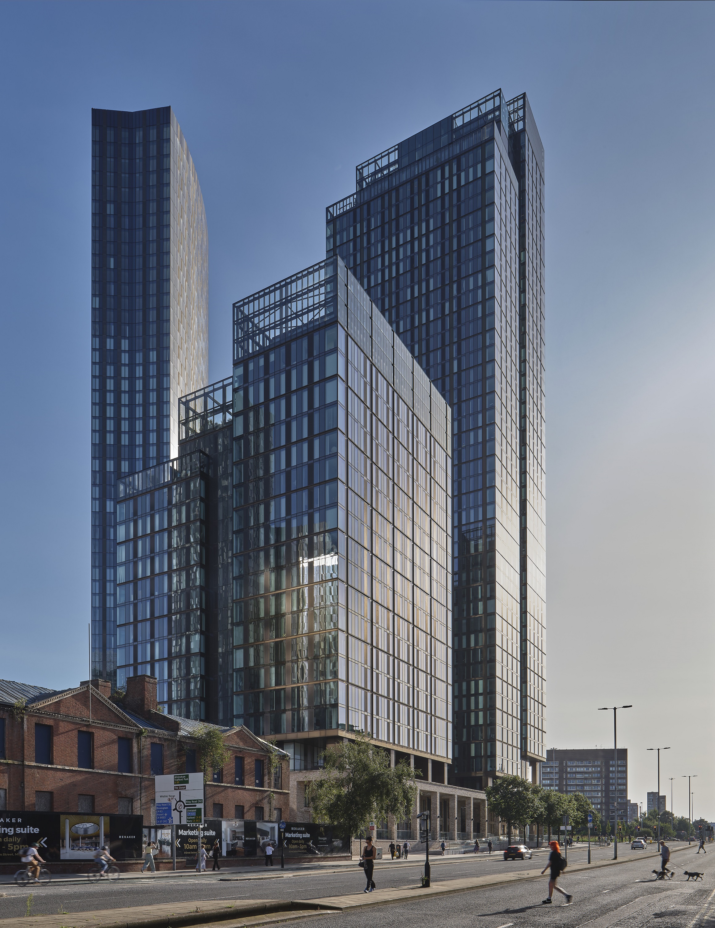 The elevations of the lower podium building each respond to orientation and the former Bridgewater Canal Offices in both scale and materiality. Brick provides a robust elevational treatment and appearance. The weathered, textured beige/buff brick constraints and complements the surrounding historic warehouse buildings and former Canal offices. The northwest elevation fronting Chester Road is much more open, providing active frontage along the well trafficked route. The northeast elevation has a tighter grain as it deals with the necessary servicing requirements of the development.