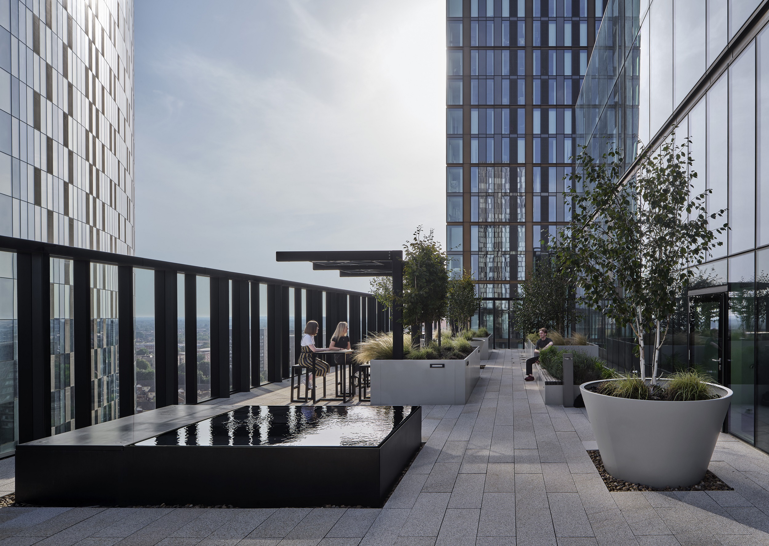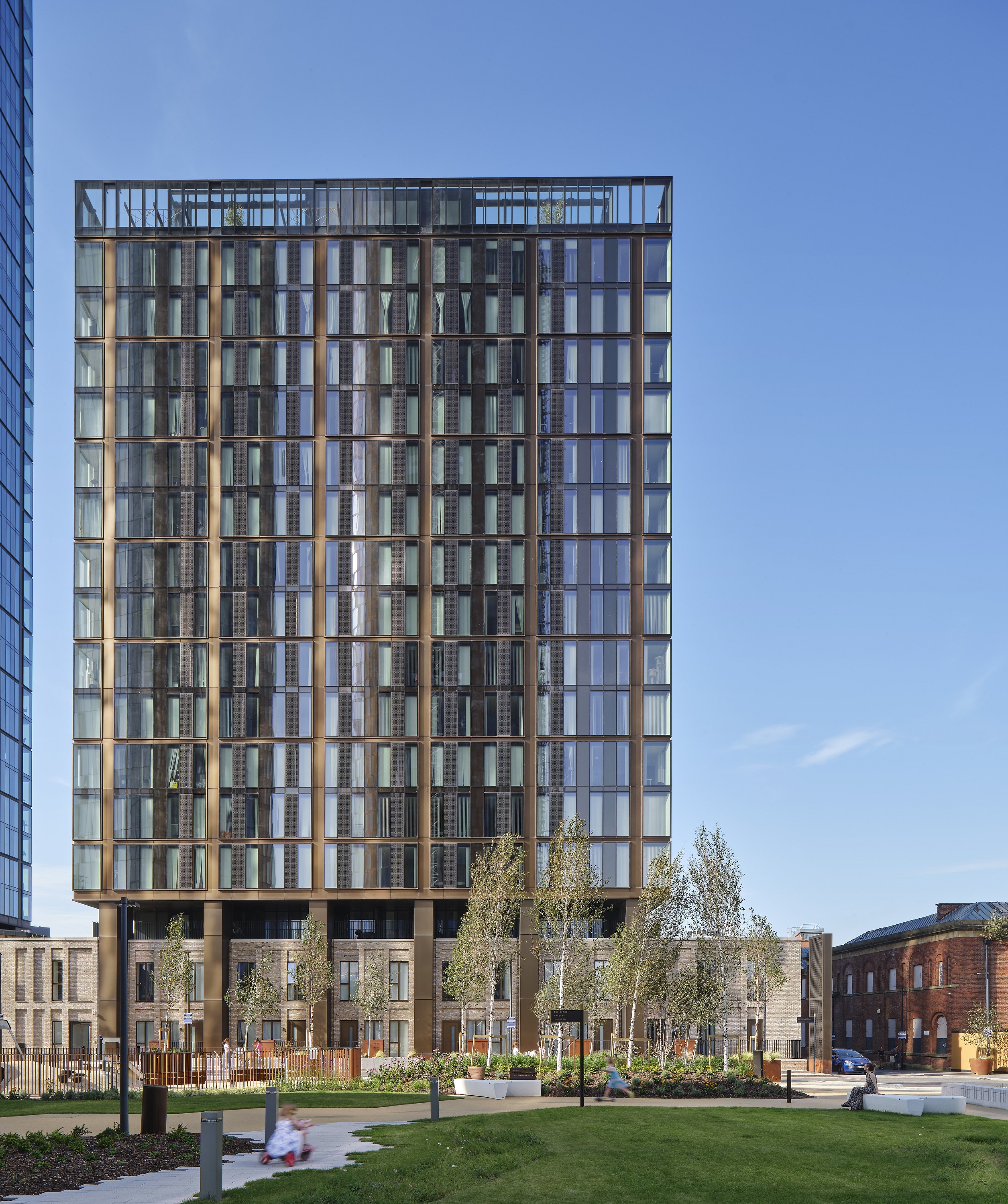 Each tower elevation acknowledges key approaches into the city. The more formal gridded elevation on Elizabeth Tower to the south west acknowledges the southern city gateway, while the primary elevation of the lower building, Victoria Residence, addresses Chester Road. A tartan grid on the primary elevations offers a subtle layering and arrangement of materiality types and finishes. Glazed, back painted and purge vent panels create a repeating pattern.