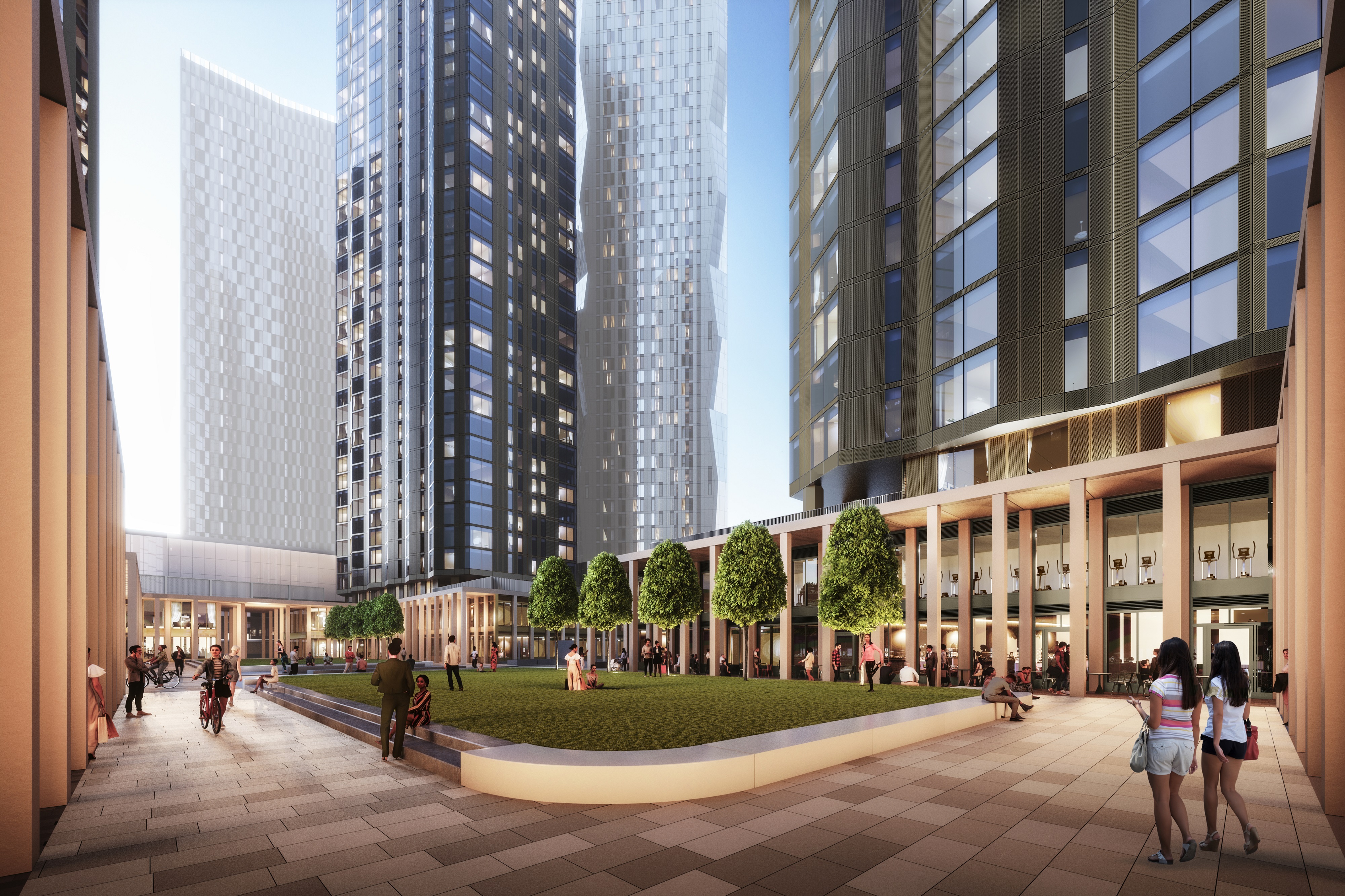 At street level, a two-storey colonnaded podium defines a new public square, an inviting and vibrant space at the centre of the scheme, anchored at each corner by the residential towers.