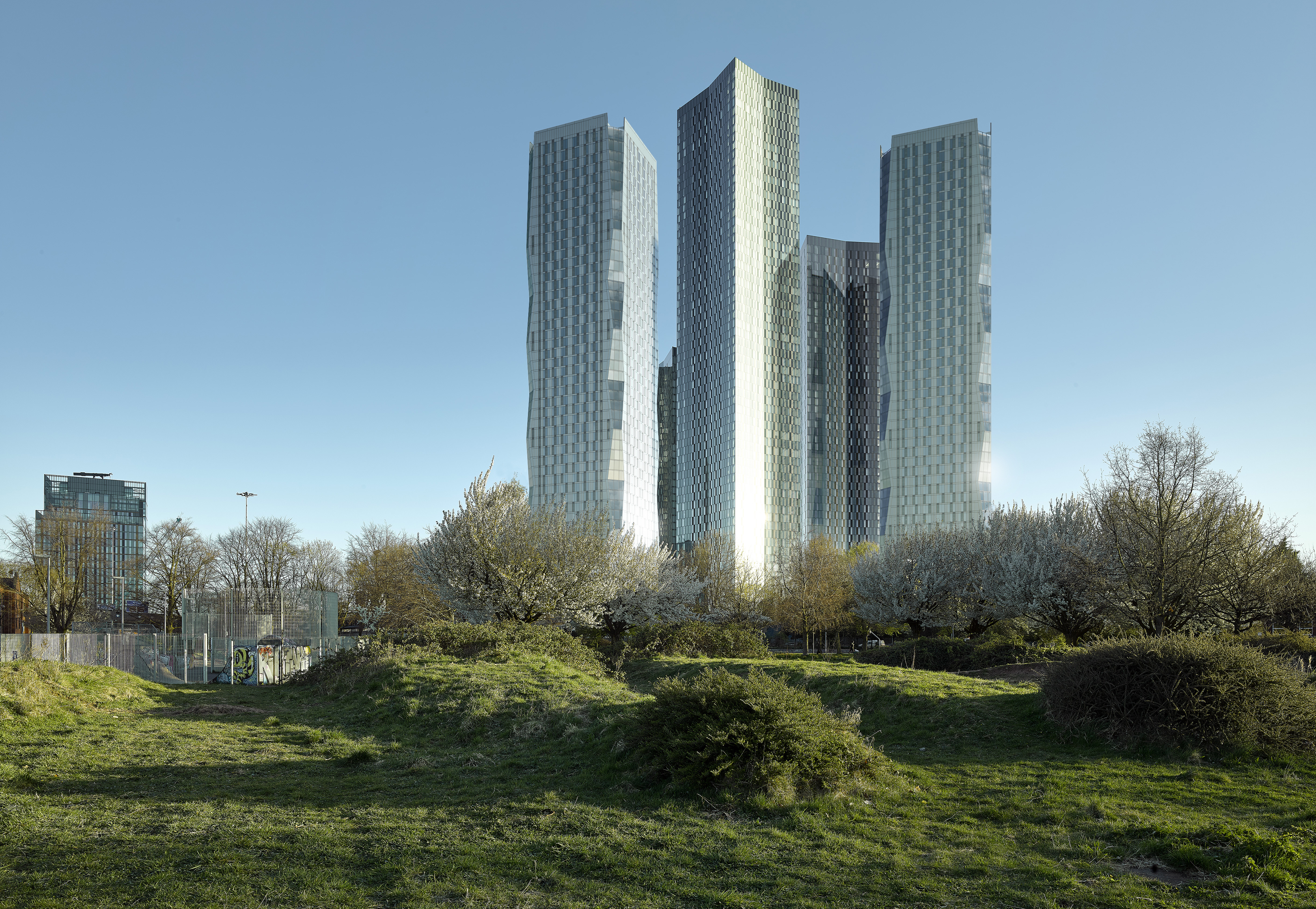 A subtle variation in façade colour gives each tower its own distinctive identity. The anodised aluminium for F1 and F2 are light blue and light green respectively, and both colour choices provide a contrast to the darker and more reflective glazing on the tower corners. The light green of F2 also provides legibility to the form when read against the backdrop of Deansgate Square.