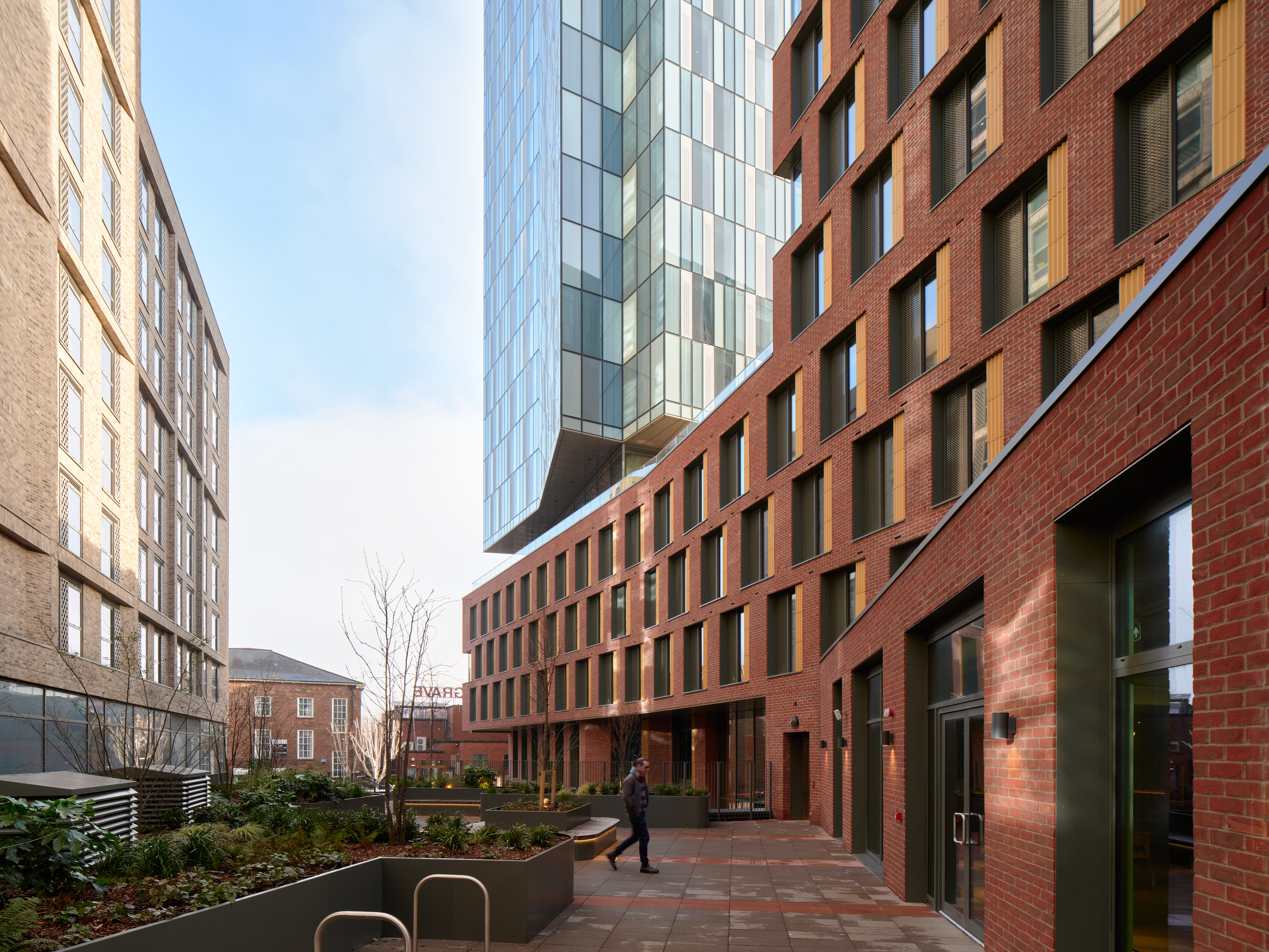 The elevational treatments of the podium and tower are intentionally contrasting, with a red brick cladding to the street building and a glass-faced façade to the tower. The podium materiality takes reference from the material and tonal palette of the historic buildings along New Briggate nearby and features glazed ceramic detailing which is inspired by local Burmantofts pottery. The tower comprises insulated opaque glass panels and clear glazing for a ‘lightweight’ and reflective appearance, which reflects the changing light of the day and seasons in the form’s crystalline facets.