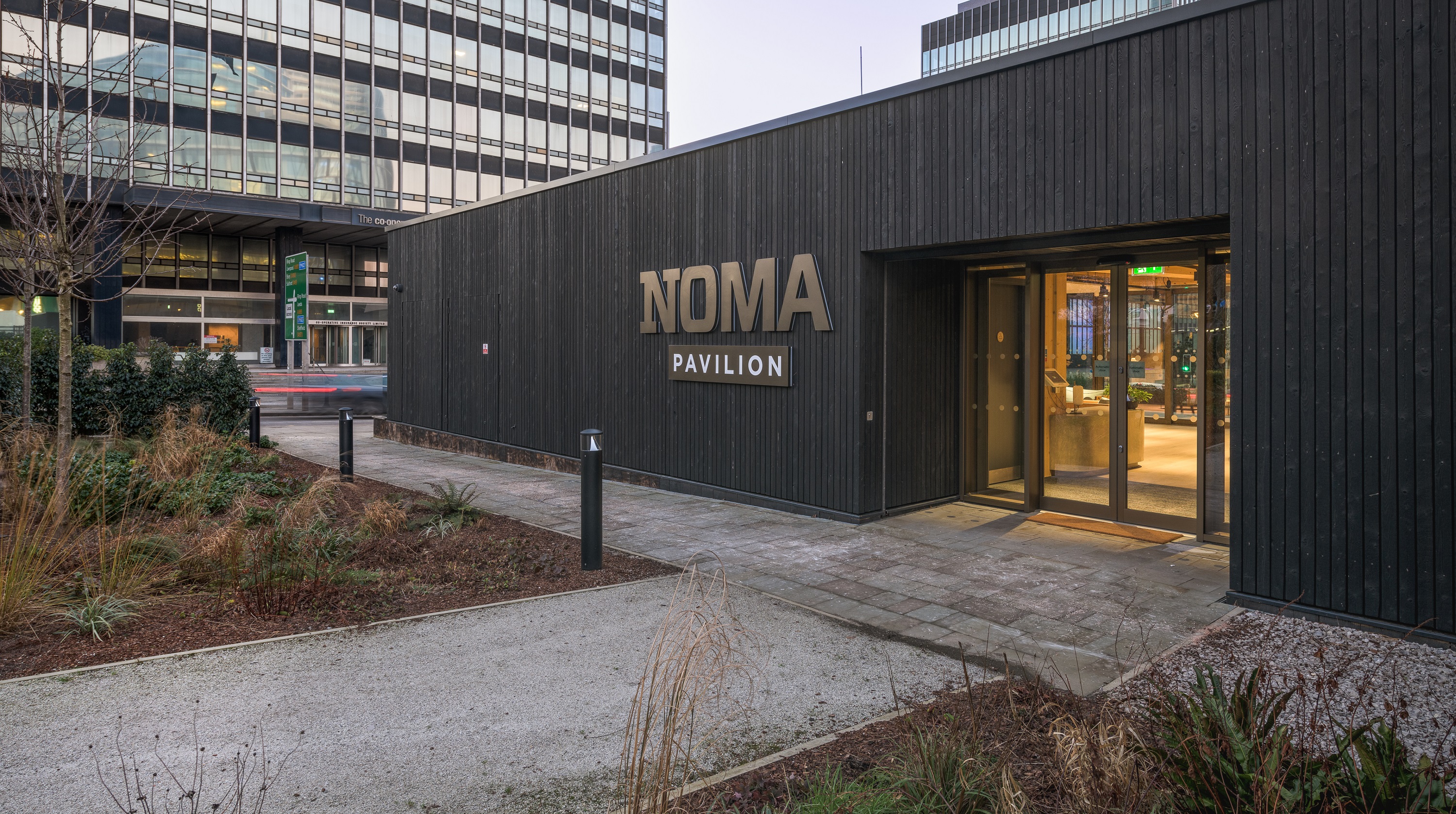 The primary objective of the NOMA Pavilion is for the building to act as a statement of commitment to the future vision of NOMA. The building is a single storey fully demountable Cross Laminated Timber (CLT) framed marketing suite for the NOMA Estate, which will be disassembled and relocated within the estate as the various development plots come forward in the future.