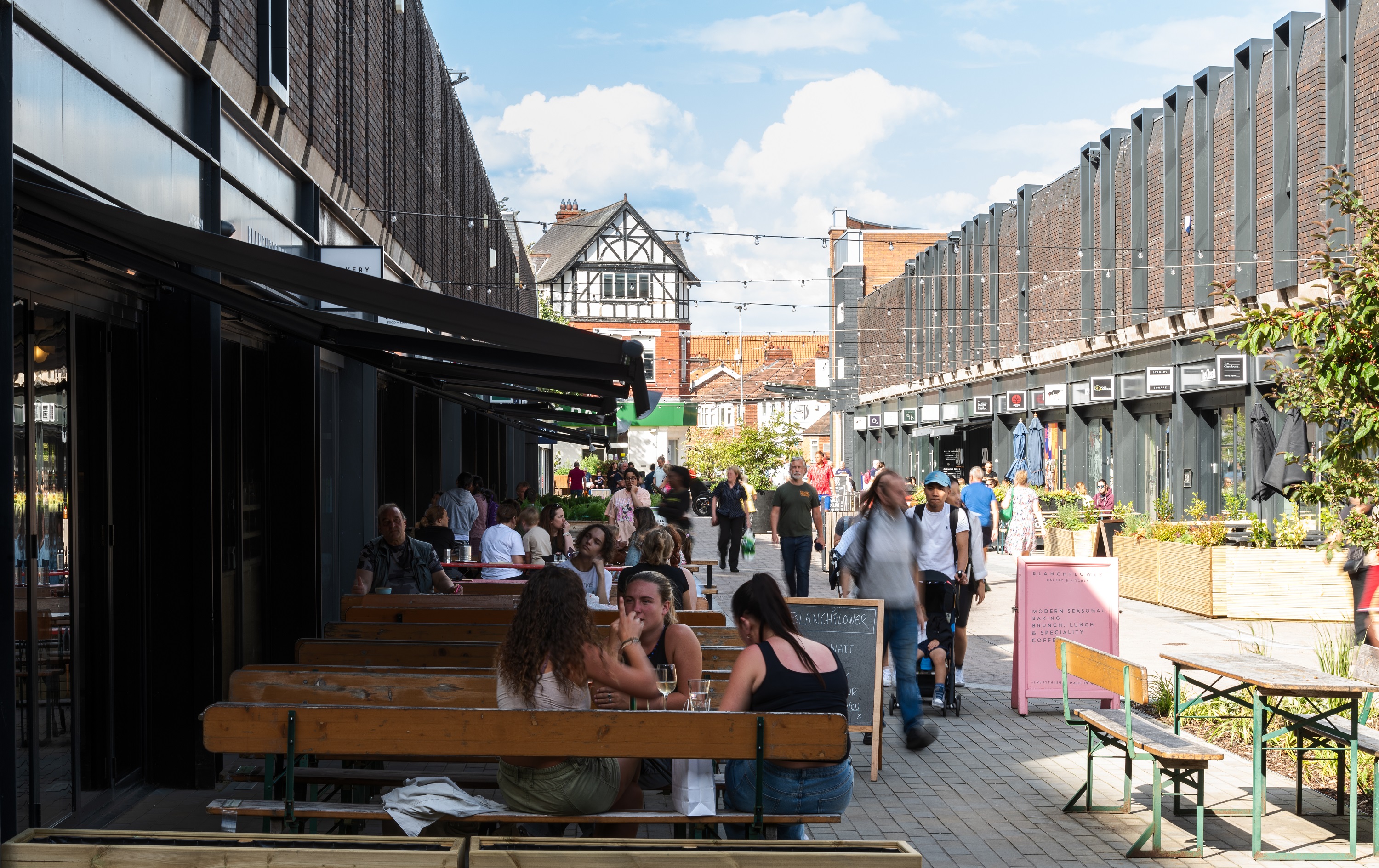 Significant improvements were also made to the appearance and quality of the public realm. The introduction of tree planting and planting beds was used to soften the visual aesthetic of the space, and a reconfigured flexible Town Square space encourages increased dwell time. Cafes and restaurants now spill out into the public realm and the central square provides space for a variety of pop-up activities and events.