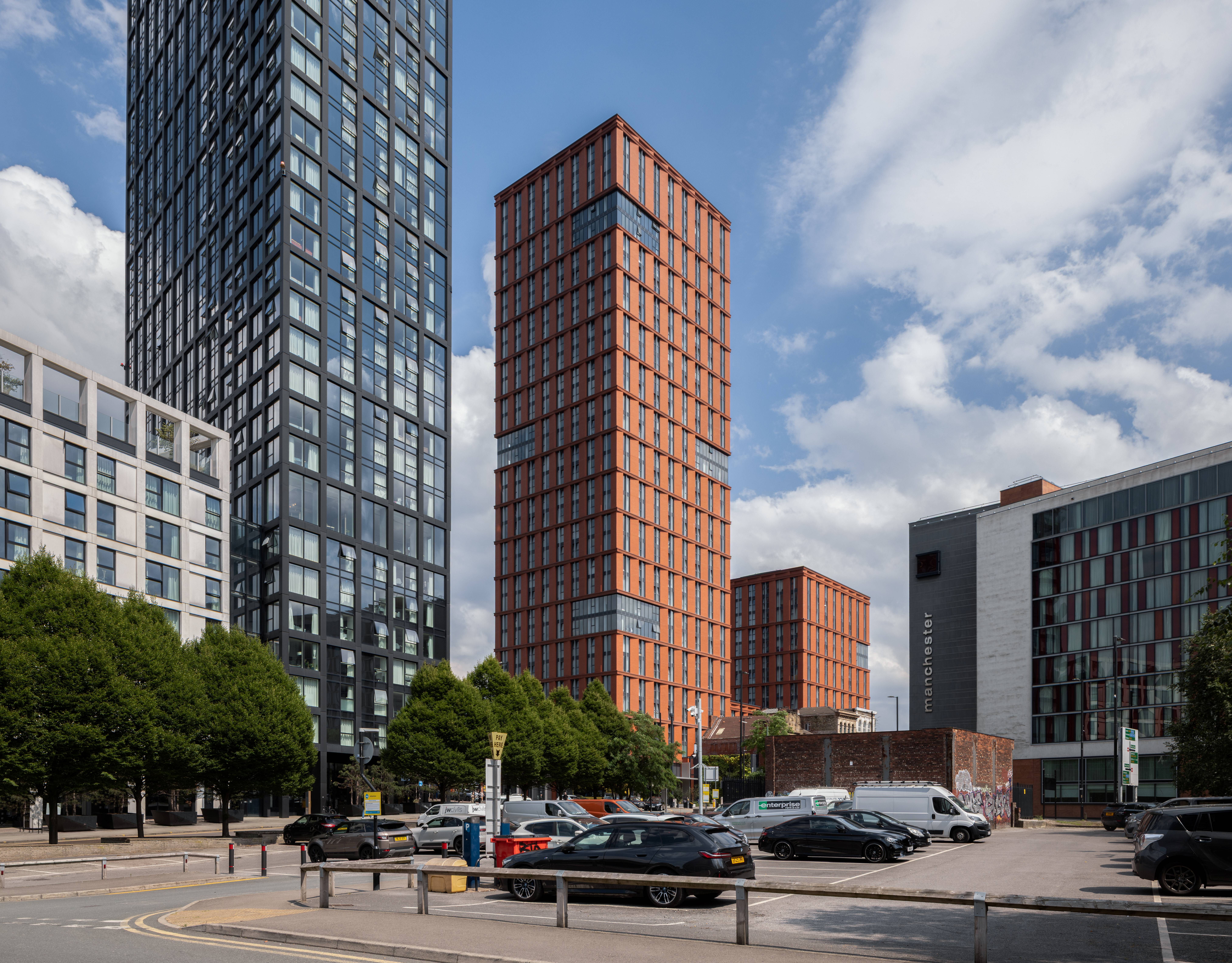This high quality residential development forms part of the New Cross Neighbourhood Development Framework (NDF), which we helped develop. It serves the Private Rented Sector (PRS) market and supports the ongoing regeneration of Manchester city centre by providing 373 apartments made up of 1, 2 and 3 bed homes, including affordable housing, and 12 serviced apartments over the top of two retail units at ground level, and a new public realm at the junction of Swan Street and Rochdale Road.