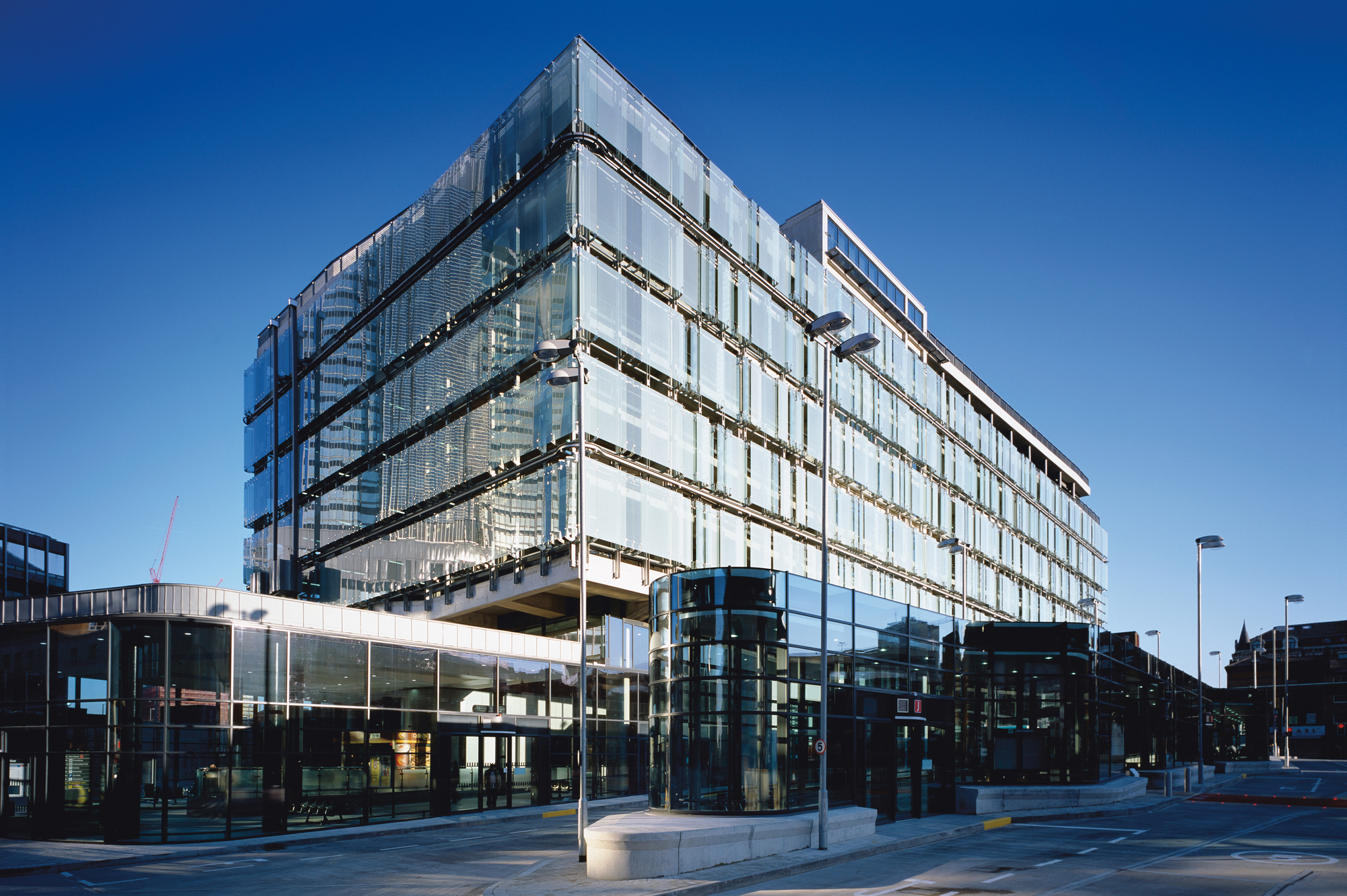 The car-park envelope consists of fritted glass panels in a variety of modules that are held in alternating planes, with the result that the horizontal ordering of the façade is overlaid with a contrasting geometry of movement and vitality. This visual interest is enhanced by the shadows of movement behind the glass. Pedestrian areas are welcoming public spaces enclosed with lightweight glass and steel structures.