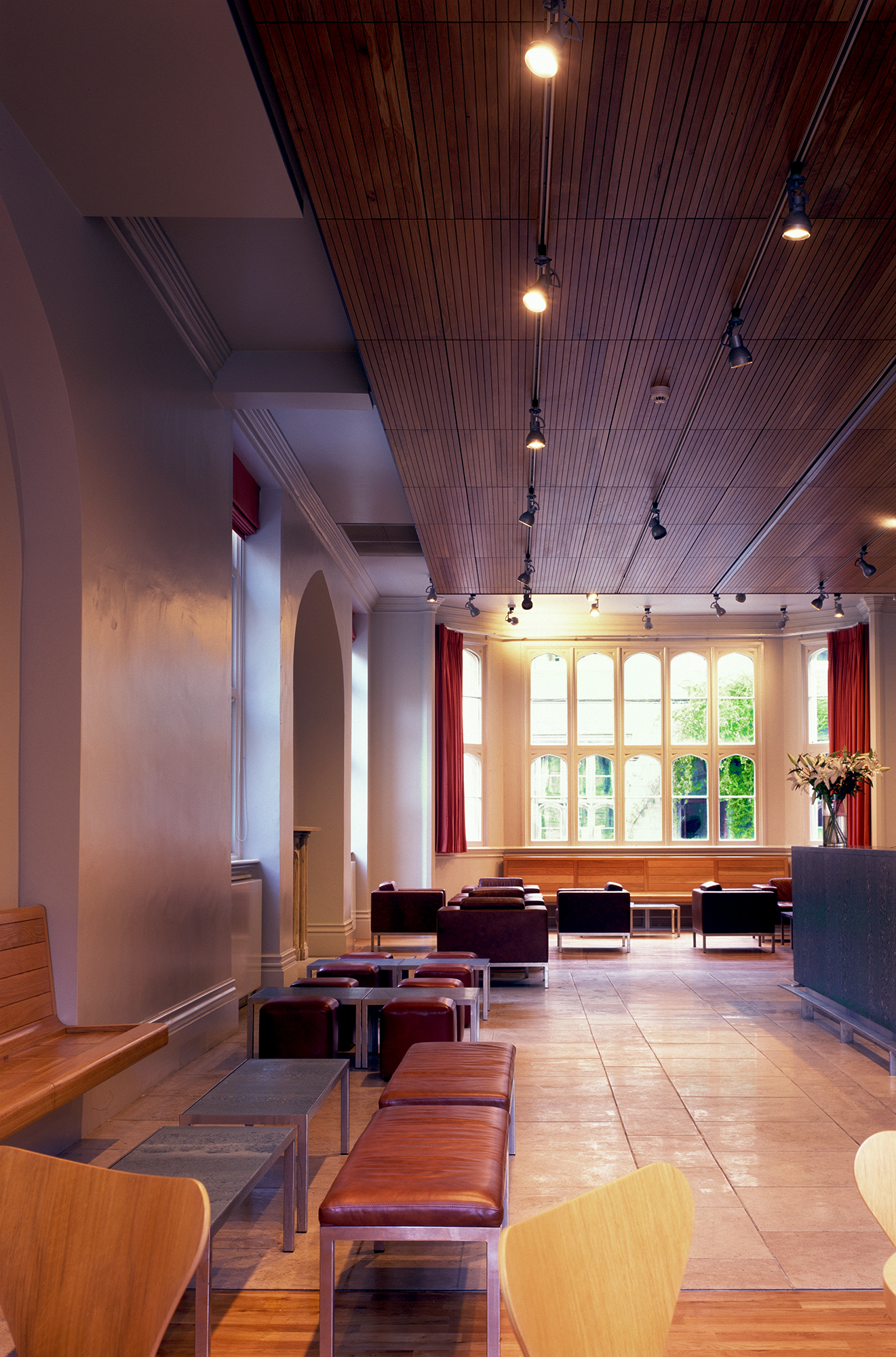 The result of a successful competition entry, the design of the student facilities comprises the conversion of an 1830s Grade II listed lecture theatre that overtime had been insensitively altered. Identified as an ideal opportunity to consolidate the students’ facilities in an upgraded, self-contained and stylish new environment, the work demanded an imaginative response to conservation and restoration.