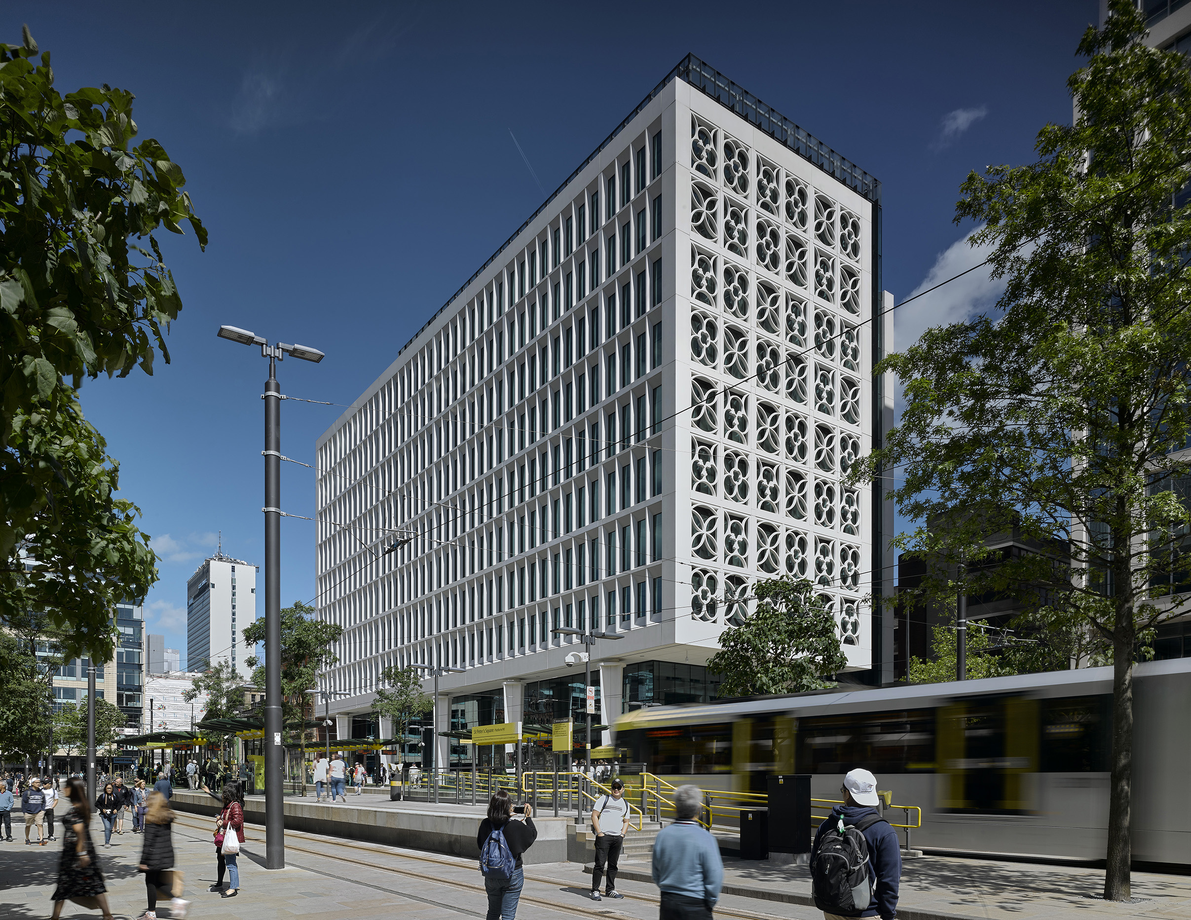 Following an international design competition, the square has been transformed into an open and welcoming public space, creating new connections across the square and with the surrounding city. The redevelopment of its south-eastern side, and Two St Peter’s Square in particular, has introduced renewed commercial activity and contemporary architecture of a quality and scale to complement the grandeur and character of the historic buildings, strengthening the entity of the square and its presence within the city.