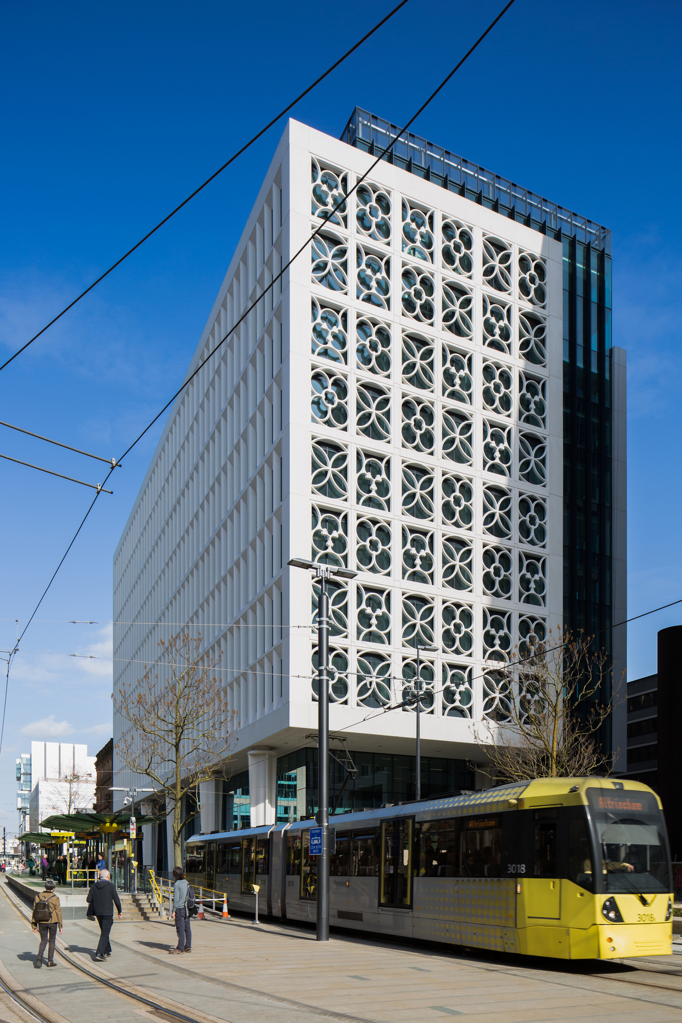 The south west façade frames the newly defined St Peter’s Square when viewed alongside its counterpart of stone filigree found on the opposing Town Hall Extension stair. Three individual patterns are used to articulate this elevation and are derived from symbols of Manchester’s heritage, interpreted from air bricks carved into the Town Hall itself. Depicting local icons such as the cotton bud and the Lancashire Rose, the tracery forms a natural shading device to the full height glazing located behind. On Princess Street the design draws on the contextual references of the textile warehouses it overlooks, using a single abstract interpretation of the cotton plant with sepal, bud and stem. This motif is repeated and rotated over the surface of the elevation, offering a rich articulated backdrop to the adjacent listed buildings.