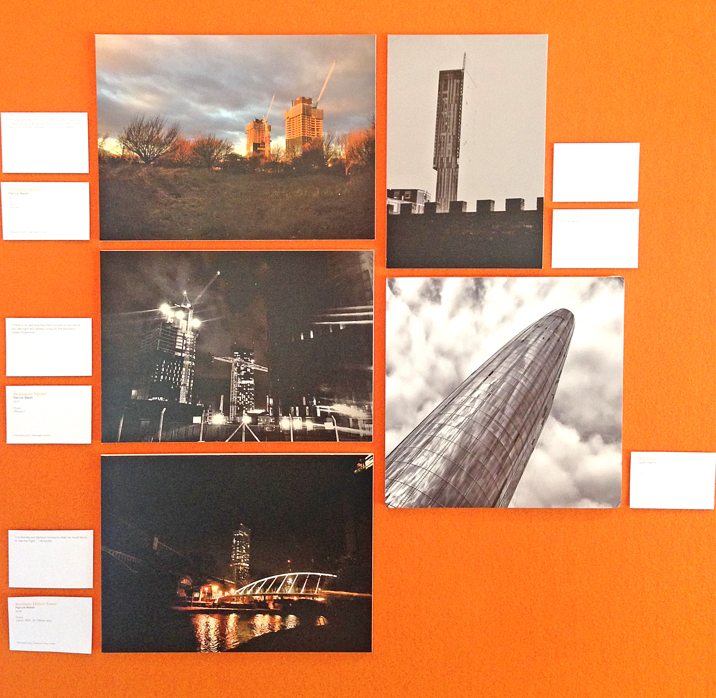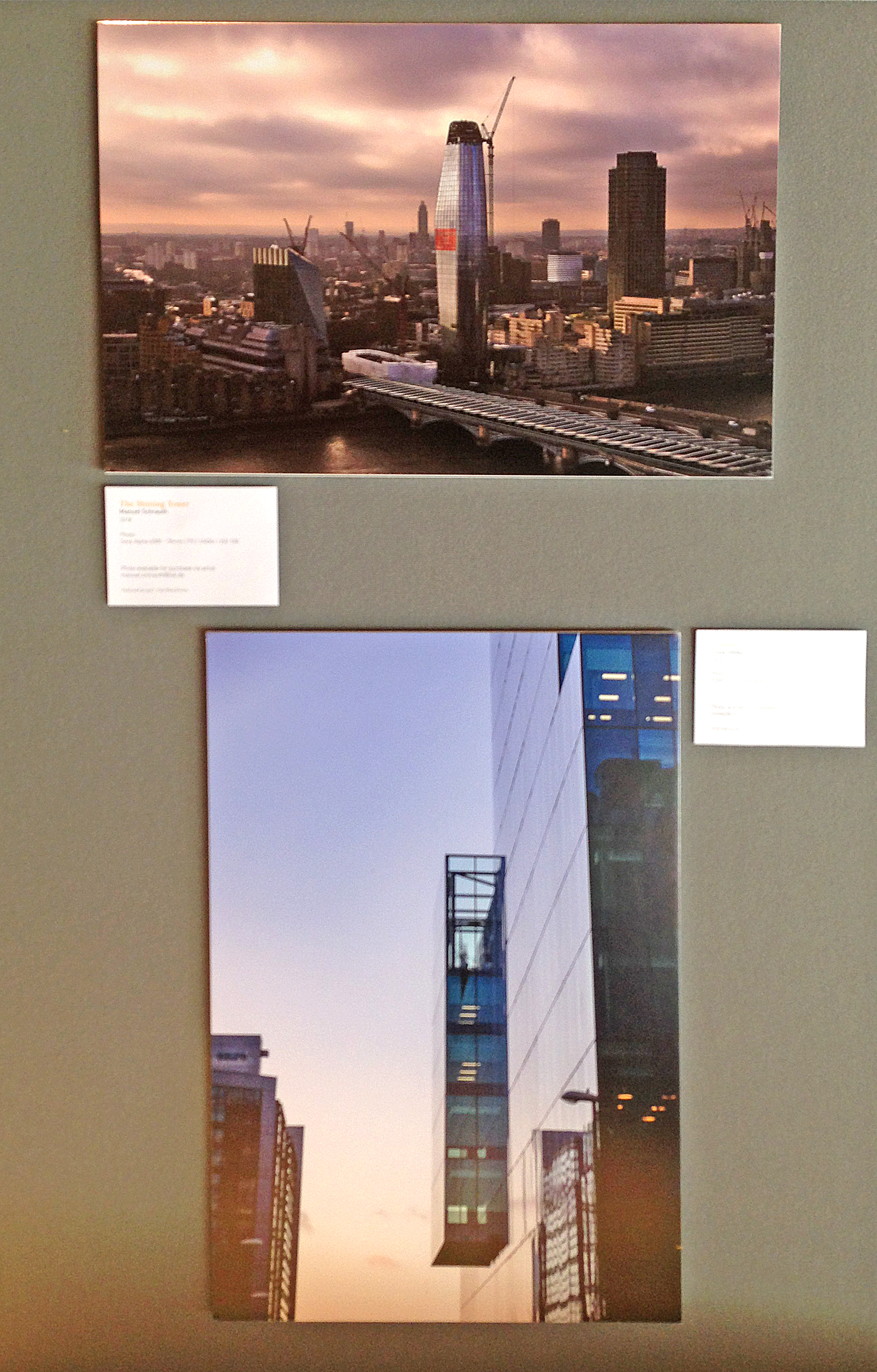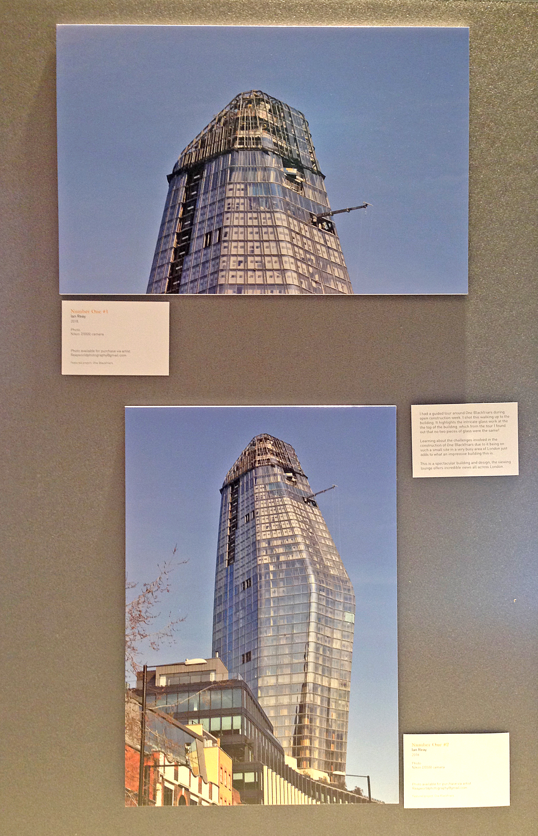 The exhibition also included a competitive element. Our team of judges – SimpsonHaugh’s David MacDonald and Matthew Ayres, and Caro Communication’s Diane Hutchinson – spent an afternoon debating the merits of each piece in order to pick which they thought provided the most surprising, fresh, unconventional and unique view of our building/s. The judges' chosen winner is Katie Anderson’s “RAF Chinook”, a thoughtfully composed photo of One Blackfriars, which they found visually arresting, especially the opposition of the Chinook and the Shard, and the lighting and reflections.