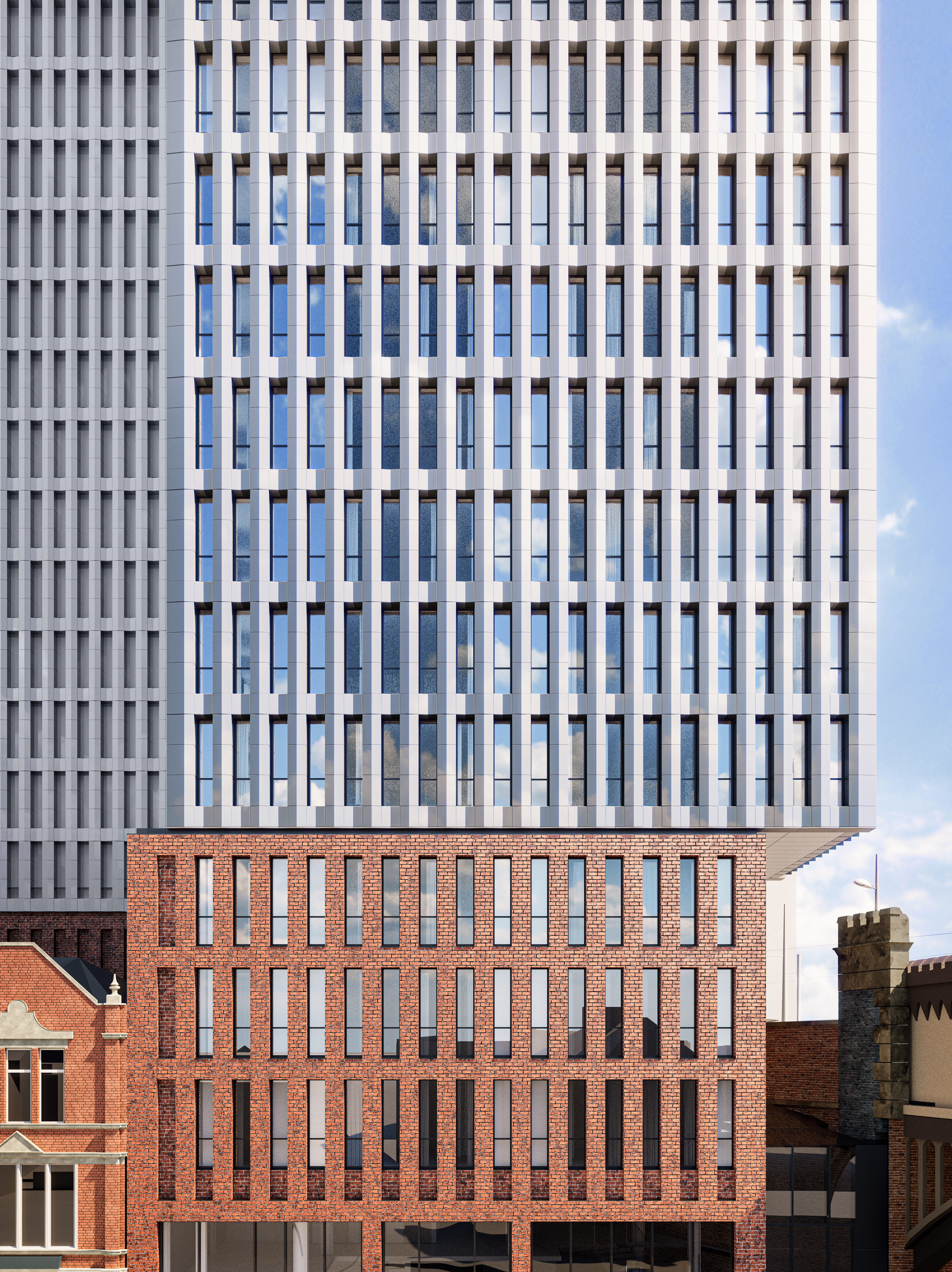 The East and West facing elevations showcase a robust grid geometry formed by terracotta panels, which depict two contrasting contextual tones. The upper panelling is made up of light off white terracotta tiles, whereas the lower podium utilises red brick cladding, ensuring a strong relationship between the building and the existing streetscape and colour tones found along Deansgate and the Great Northern Terrace.