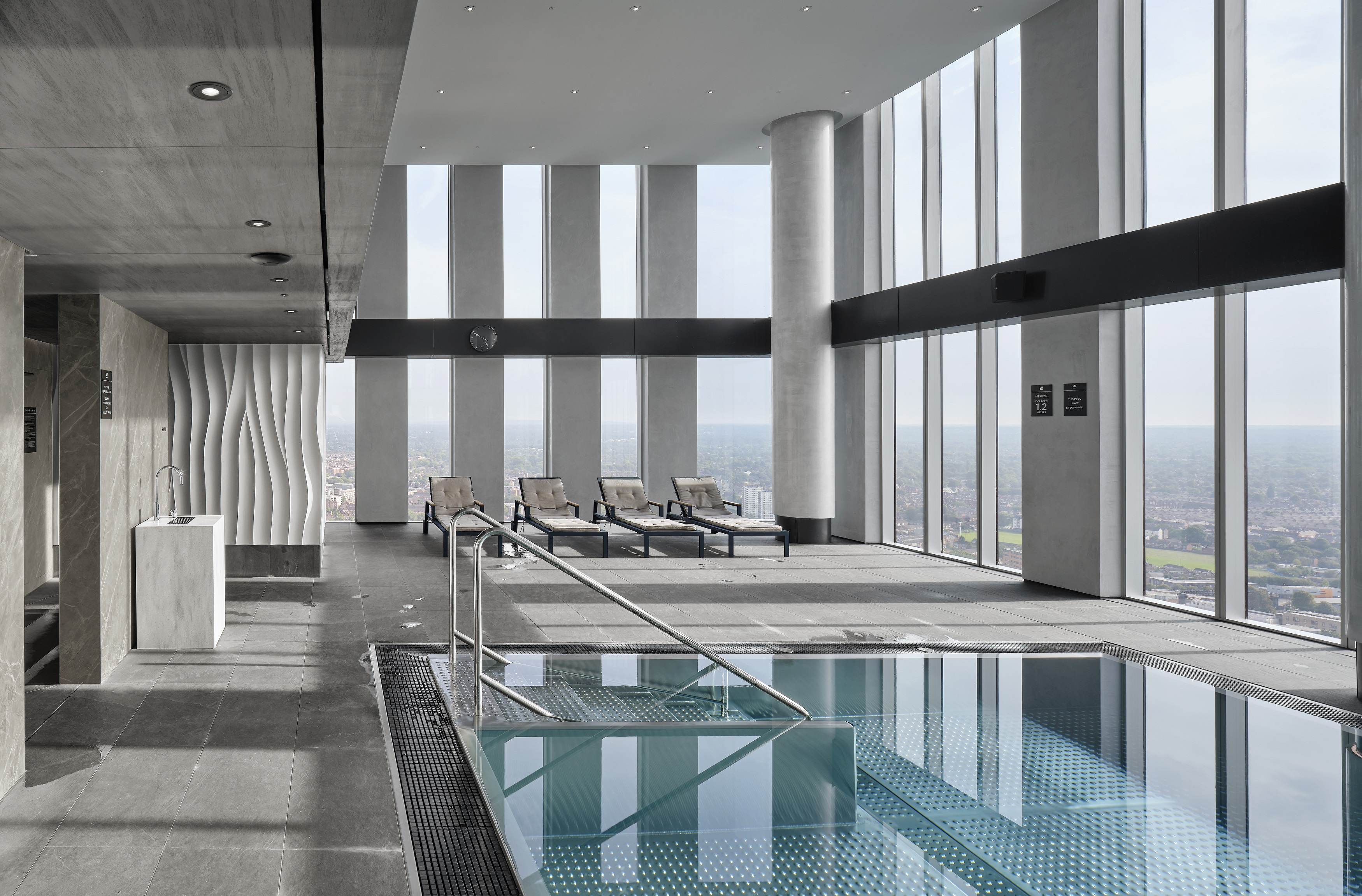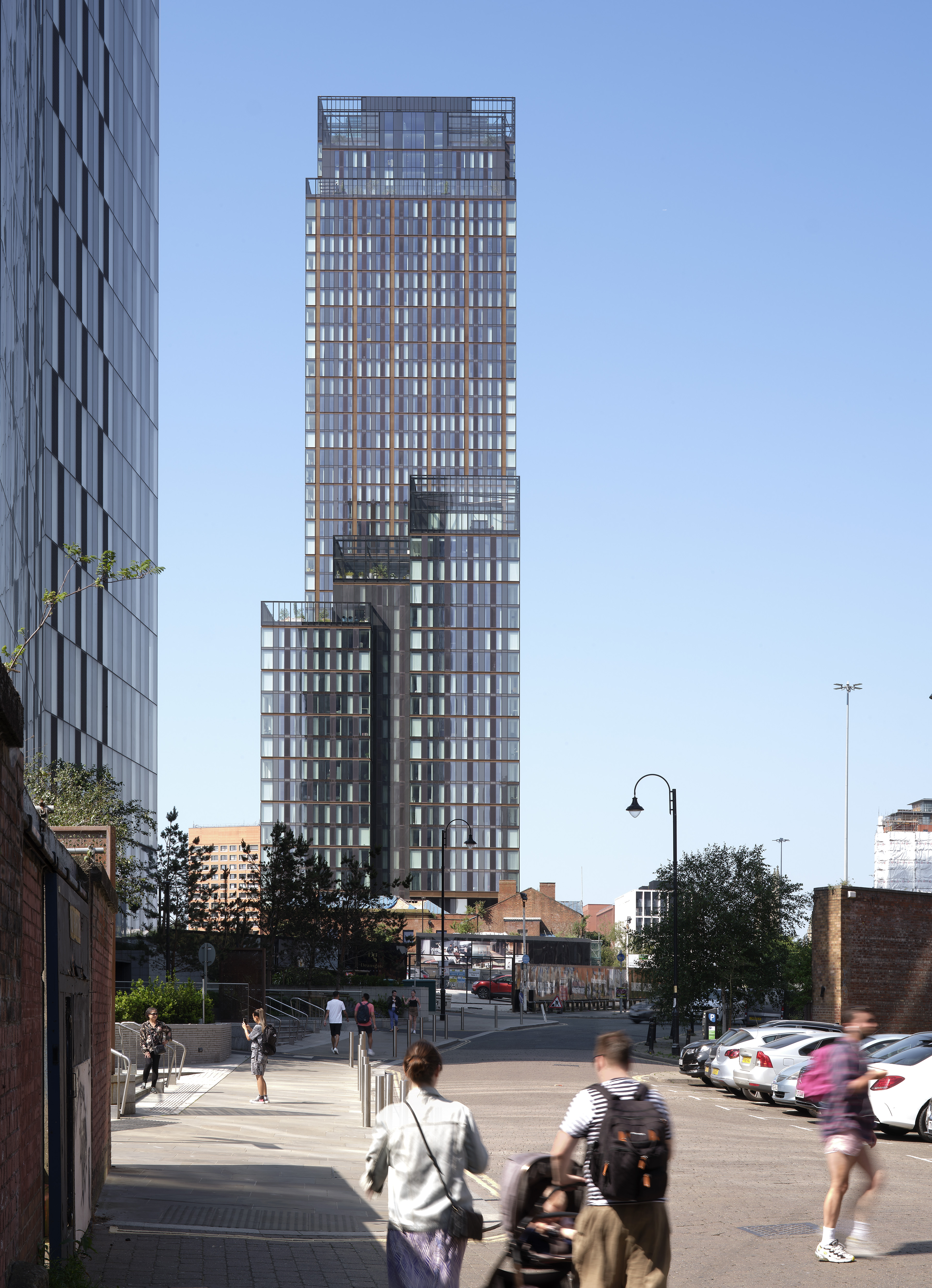 Each tower elevation acknowledges key approaches into the city. The more formal gridded elevation on Elizabeth Tower to the south west acknowledges the southern city gateway, while the primary elevation of the lower building, Victoria Residence, addresses Chester Road. A tartan grid on the primary elevations offers a subtle layering and arrangement of materiality types and finishes. Glazed, back painted and purge vent panels create a repeating pattern.