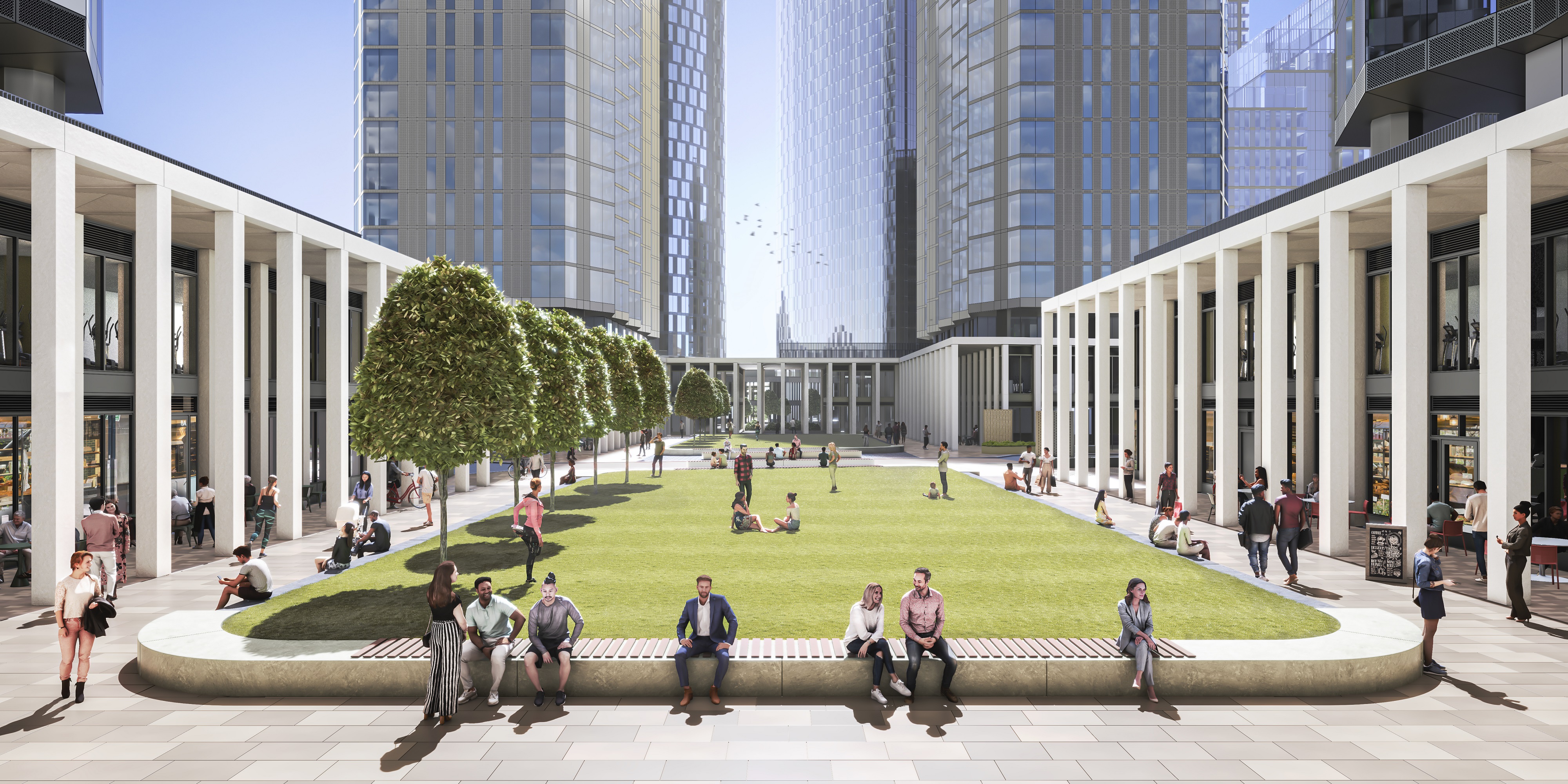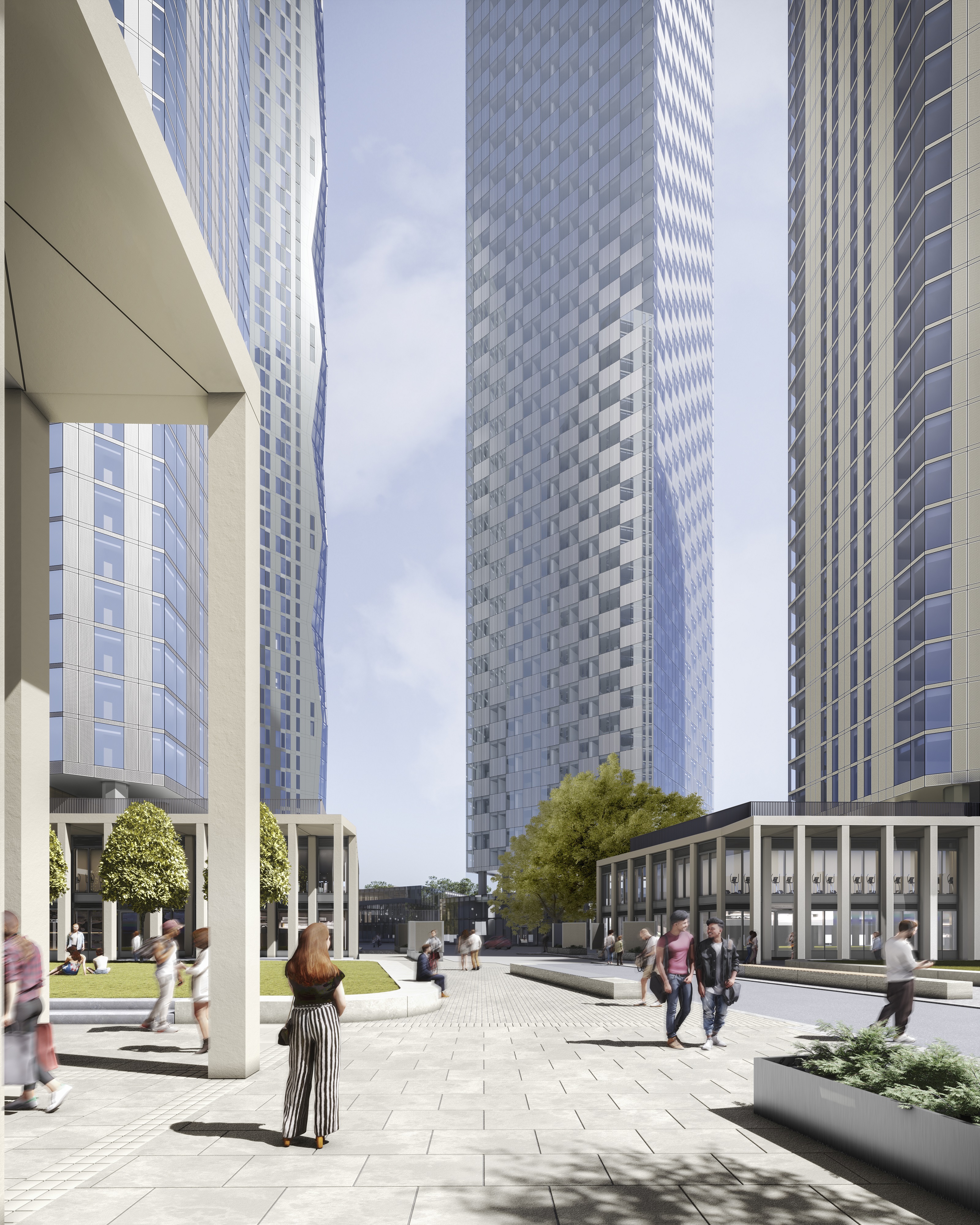 At street level, a two-storey colonnaded podium defines a new public square, an inviting and vibrant space at the centre of the scheme, anchored at each corner by the residential towers.