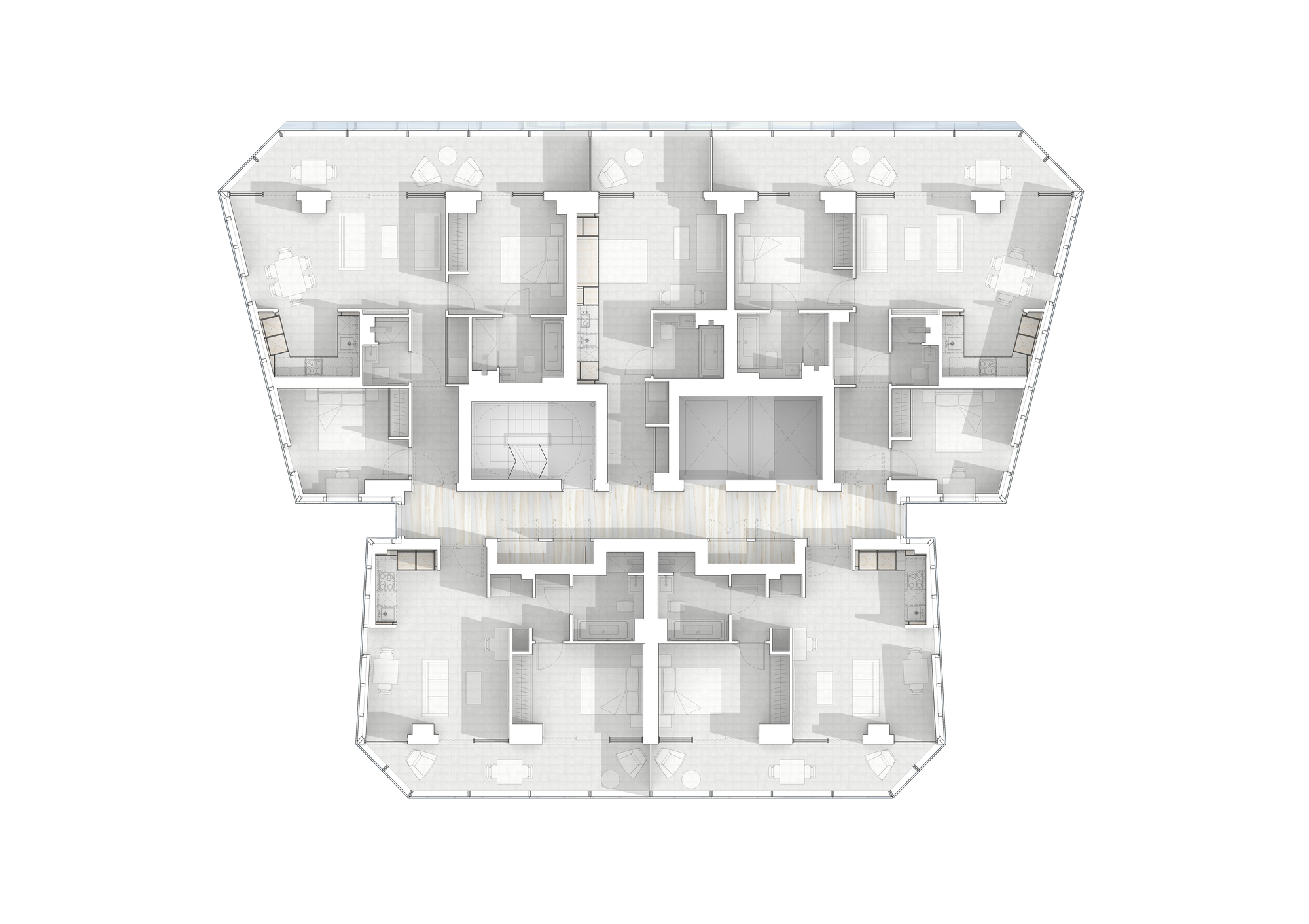 Designed from the inside out, the floorplate orientates homes to the east and to the west, so that most benefit from double if not triple aspects. Generous winter gardens provide every home with a truly useful semi-outdoor space and floor-to-ceiling windows bring daylight in and act as a thermal buffer zone.