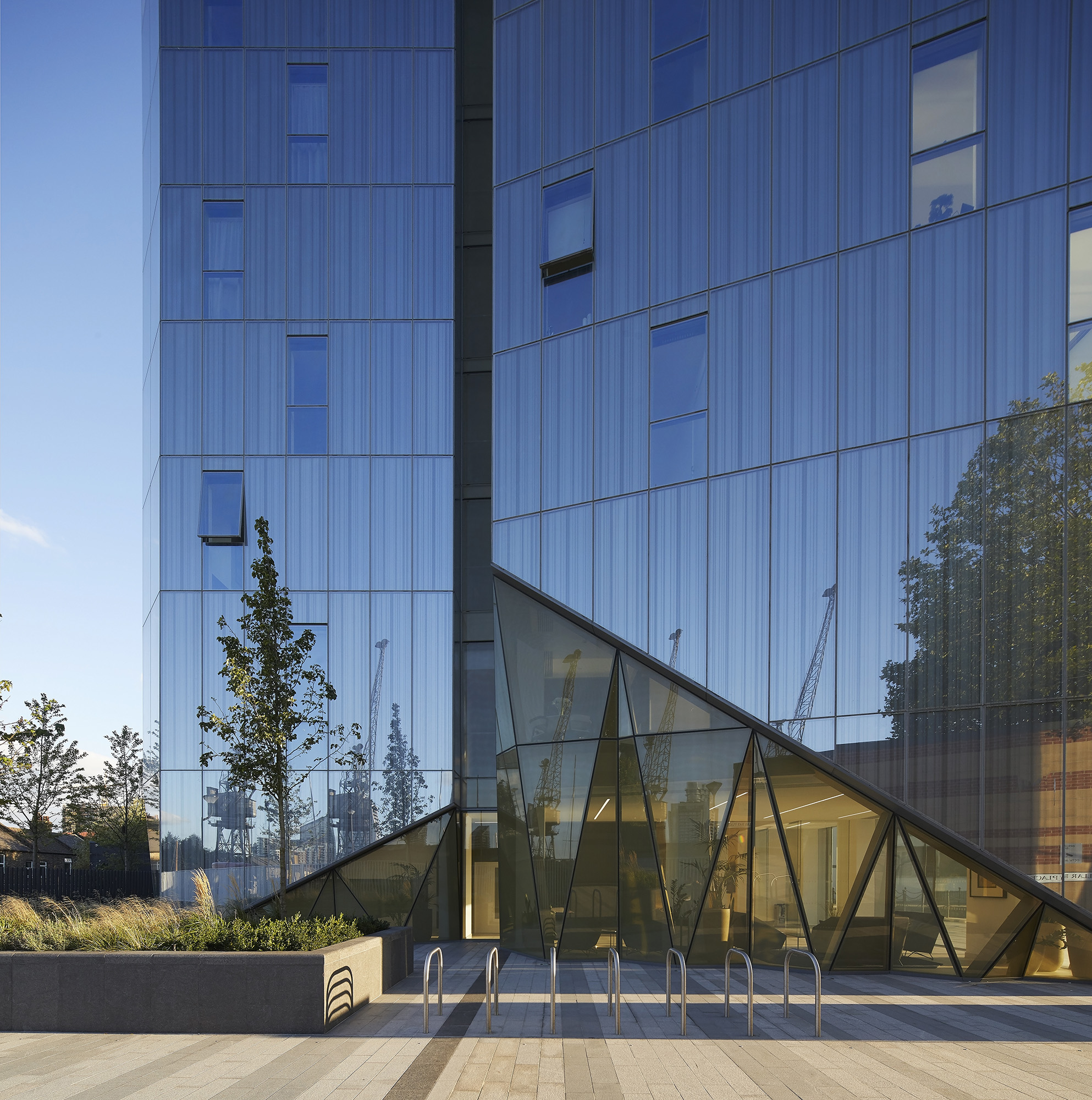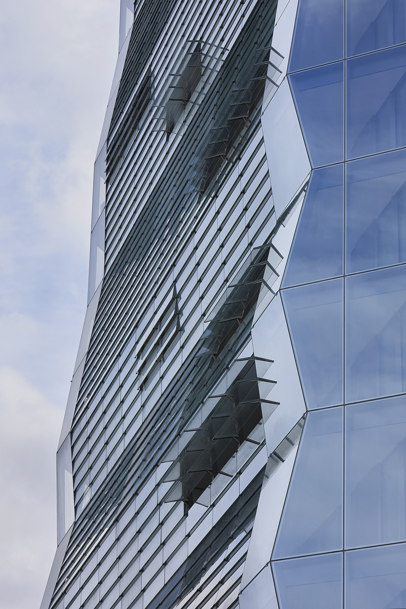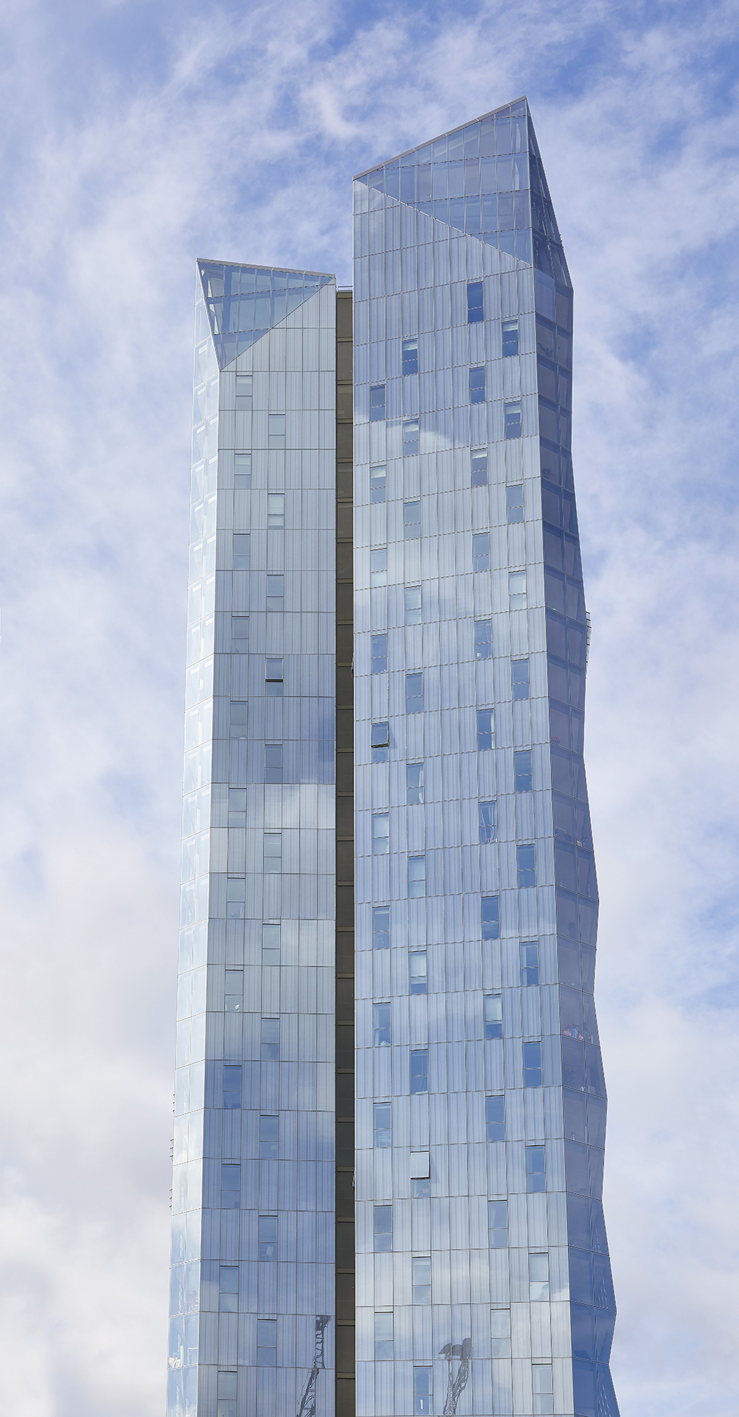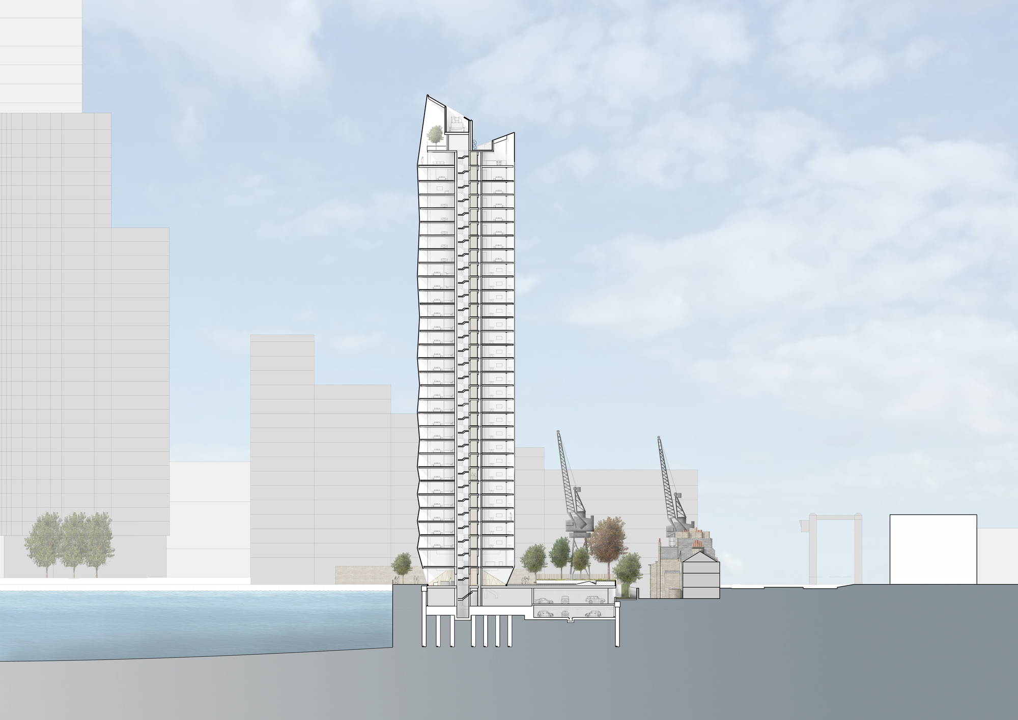 A simple rigour infuses every line of the tower's taut geometry. The building rises as two elegant crystalline forms fused together by the joint of the circulation core. The west façade facing the waterfront appears to ripple, its meticulously detailed folds and creases evoking a waterfall gathering pace as water descends. By resting lightly on the ground, additional space for the landscaped waterside public realm is created.