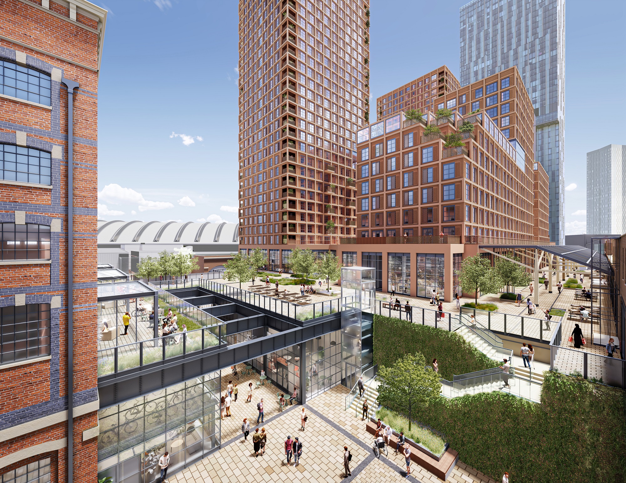 The site’s underused public realm, which includes the Great Northern Square, will be completely transformed, creating a green, biodiverse oasis within the city, and introducing vibrant new pedestrianised streets, improving connectivity and legibility. The listed viaduct structure to the south of the warehouse and the existing upper-level mews space will together become a generous landscaped public space incorporating a rich variety of independent retail, restaurant and leisure uses.