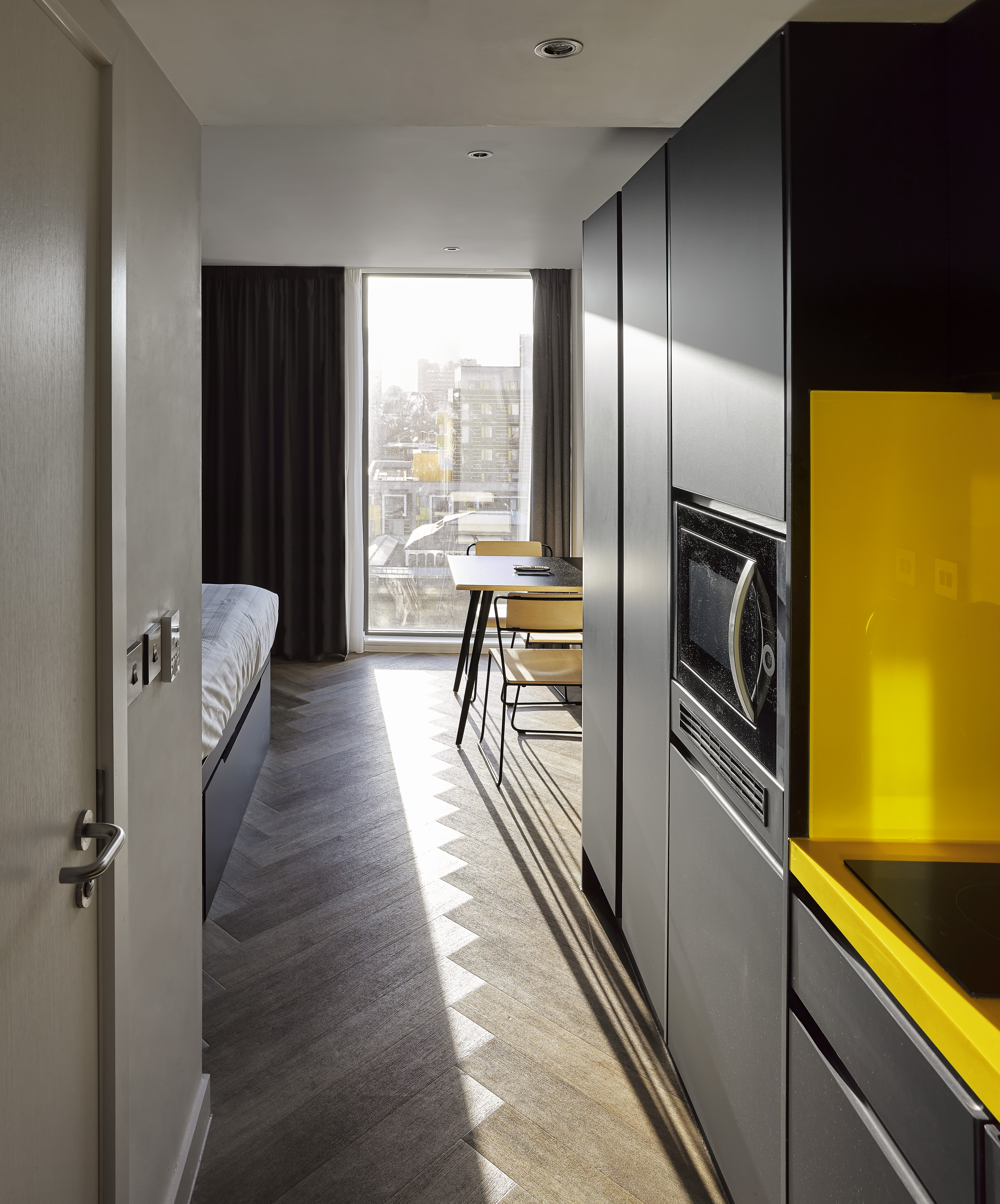 The aparthotel comprises a mixture of one-bed and studio units. The ground floor provides front of house accommodation including reception foyer, café, exercise room and guest laundry in addition to the back of house support and staff areas. The ground floor also includes a small number of aparthotel units facing into a secure courtyard.