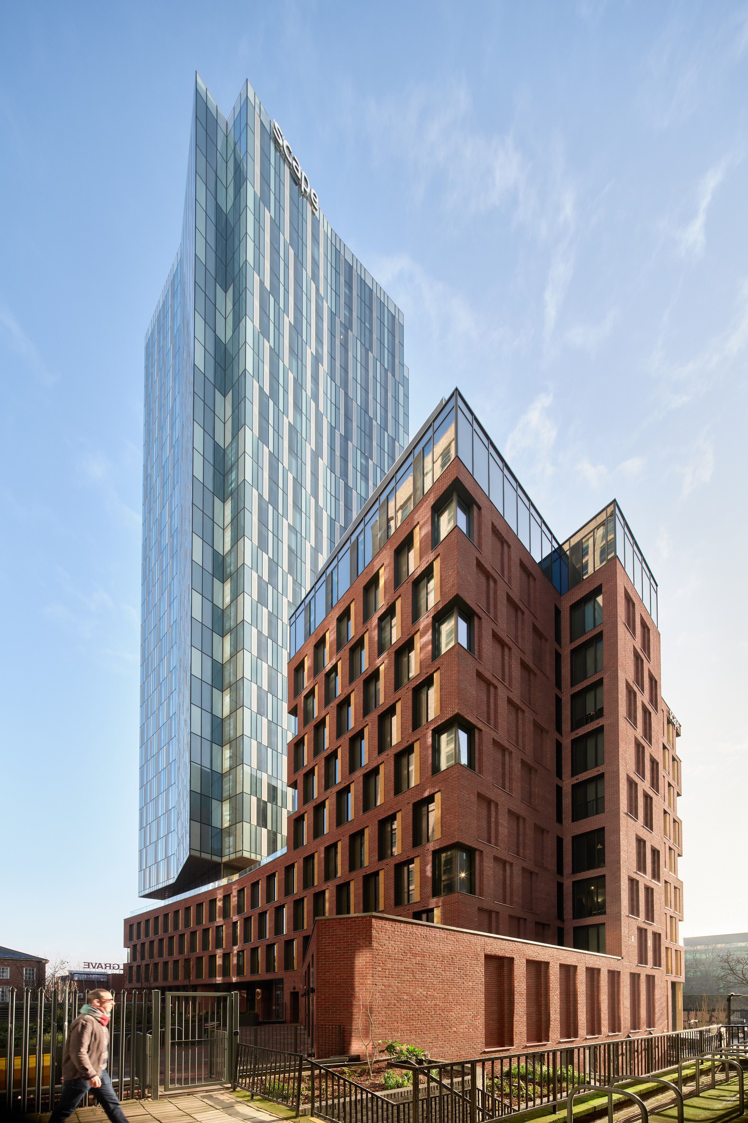 Sited within the northern Arena Quarter of Leeds city centre and near to the city’s universities, this student residential-led scheme forms part of the growing cluster of tall buildings found in the area. Offering world-class student accommodation, a total of 660 bed spaces are provided across a mix of self-contained studios and 5-bed cluster apartments with generous communal living spaces. Students will have access to extensive on-site amenities including a fitness studio, games room, multimedia and cinema rooms, laundry facilities and numerous lounges and study spaces, some of which open out onto private rooftop gardens.