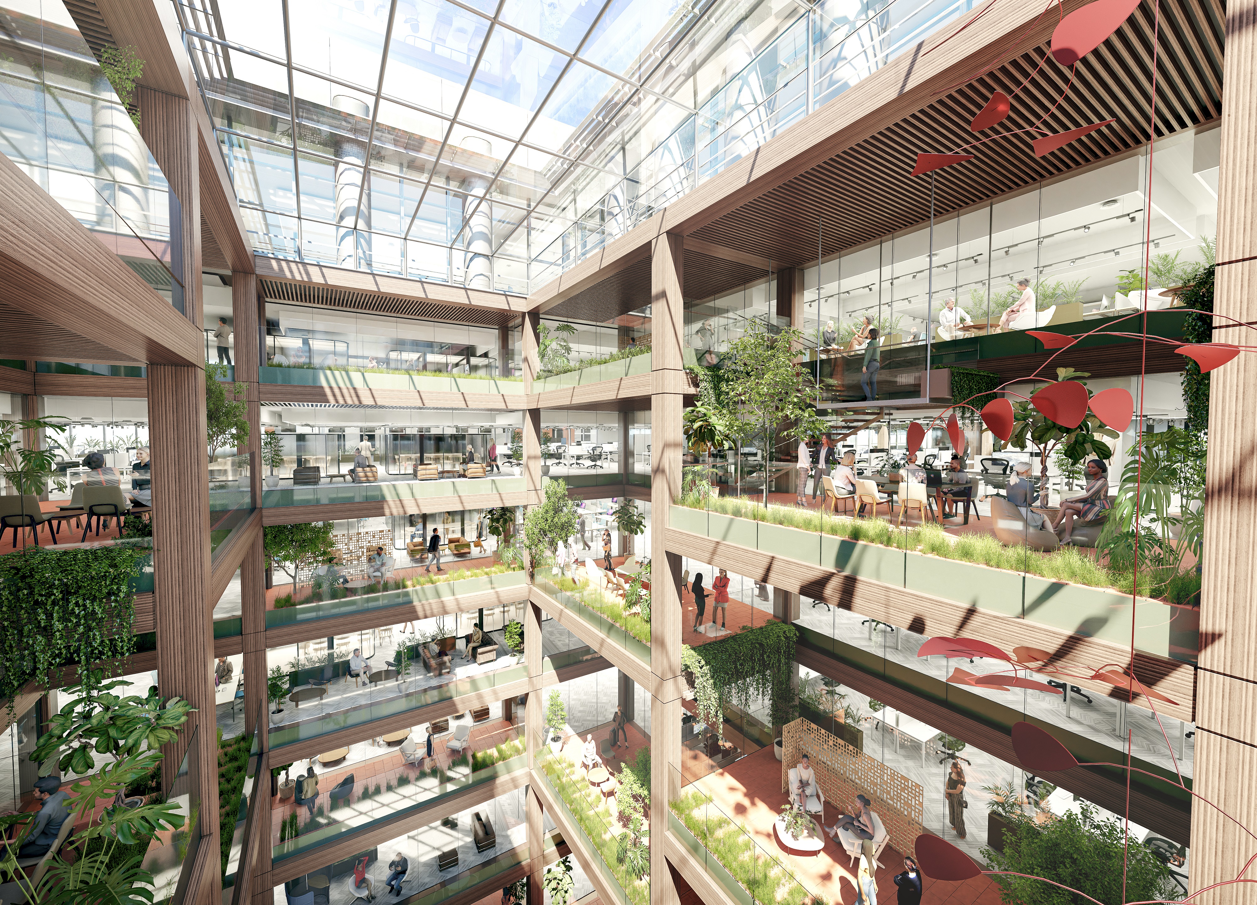 The existing atrium is to be transformed by ‘cutting’ out pockets to bring more light into the deep floorplates whilst creating amenity and garden spaces forming a ‘Village Square’ at the heart of the building. The ground and first floors will provide spaces for informal engagement and promoting healthy working environments that will foster a culture of collaboration and innovation.