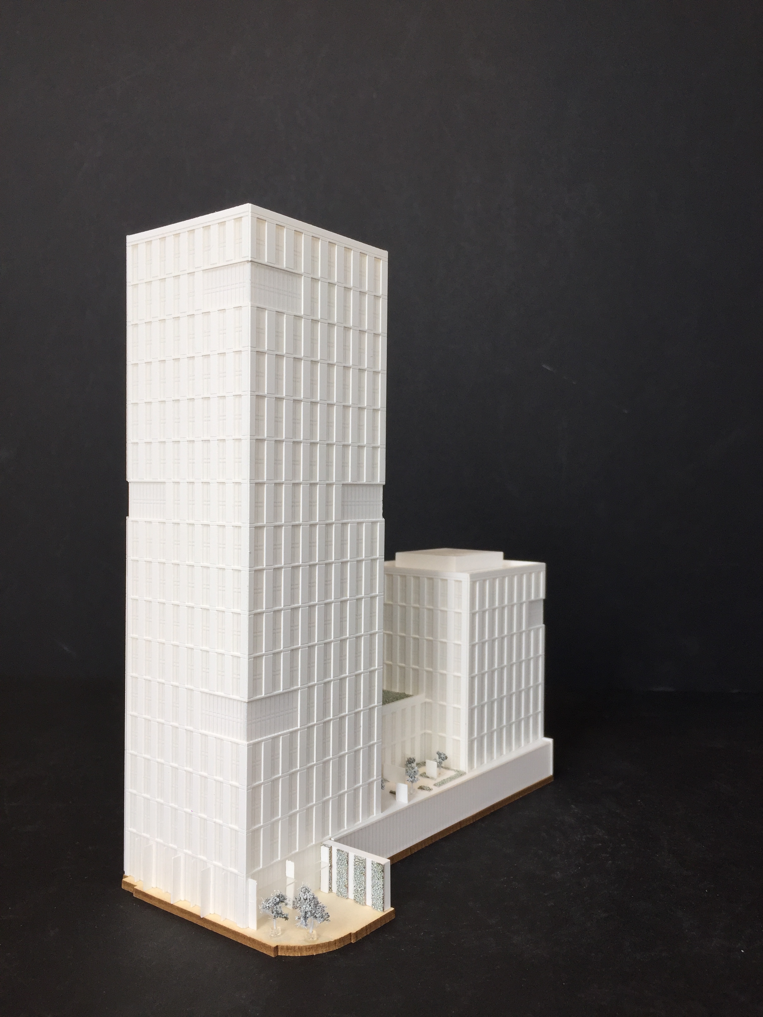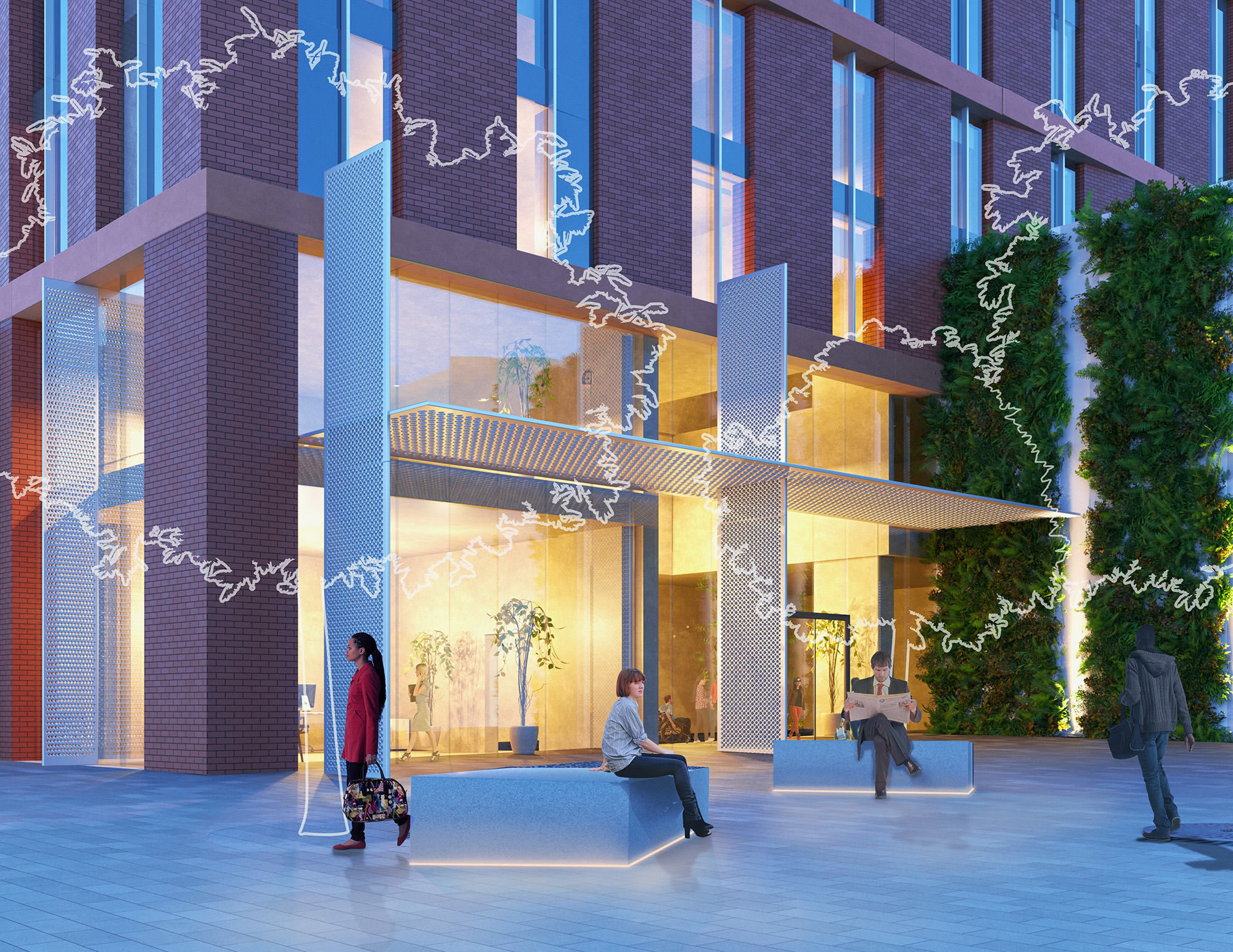 The development is set across a single building containing two towers – 32 and 14 storeys - connected by a 6 storey plinth. The glazed and red brick façade is organised in a grid following the vertical height of two storeys. The materiality was selected for its deliverability, buildability and future maintenance while also keeping in line with the emerging vernacular at New Cross of solid and robust elevations, often featuring brick, as can be seen with our adjacent AC Hotel and Mason Street Aparthotel projects. The angle of the façade’s vertical brick element provides visual interest as the sun moves around the building and shadows are cast on the façade.