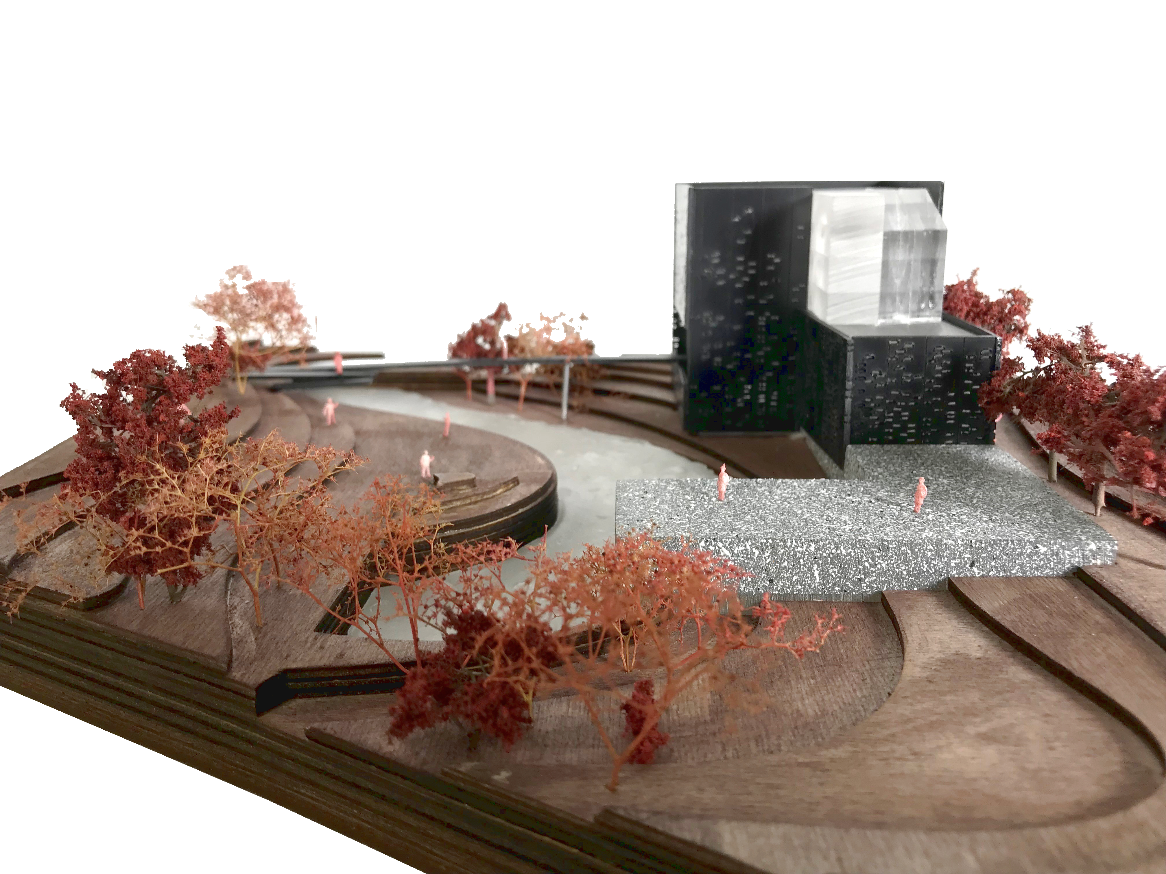 “Developing a façade model helped me to express the scale of the auditorium and how the evening light interacts with the transitional space. A second model highlighted the programme of the building, detailing the mezzanine level.”