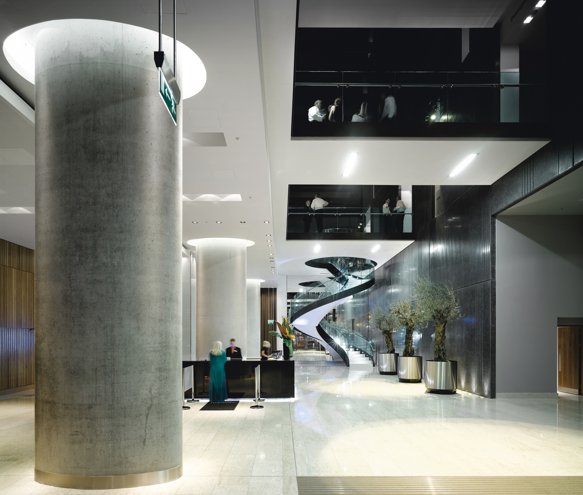 The envelope comprises a glazed skin that hints at the different aspects of the façade without disrupting the simplicity of the building form. The composition of transparent and solid elements emphasises the tower’s verticality and defines a grand scale that transcends that of an individual apartment or guest bedroom. A further level of refinement is provided by contrasting reflections and shadows from vertical opening louvres, perforated metal panels and solar shading fins.