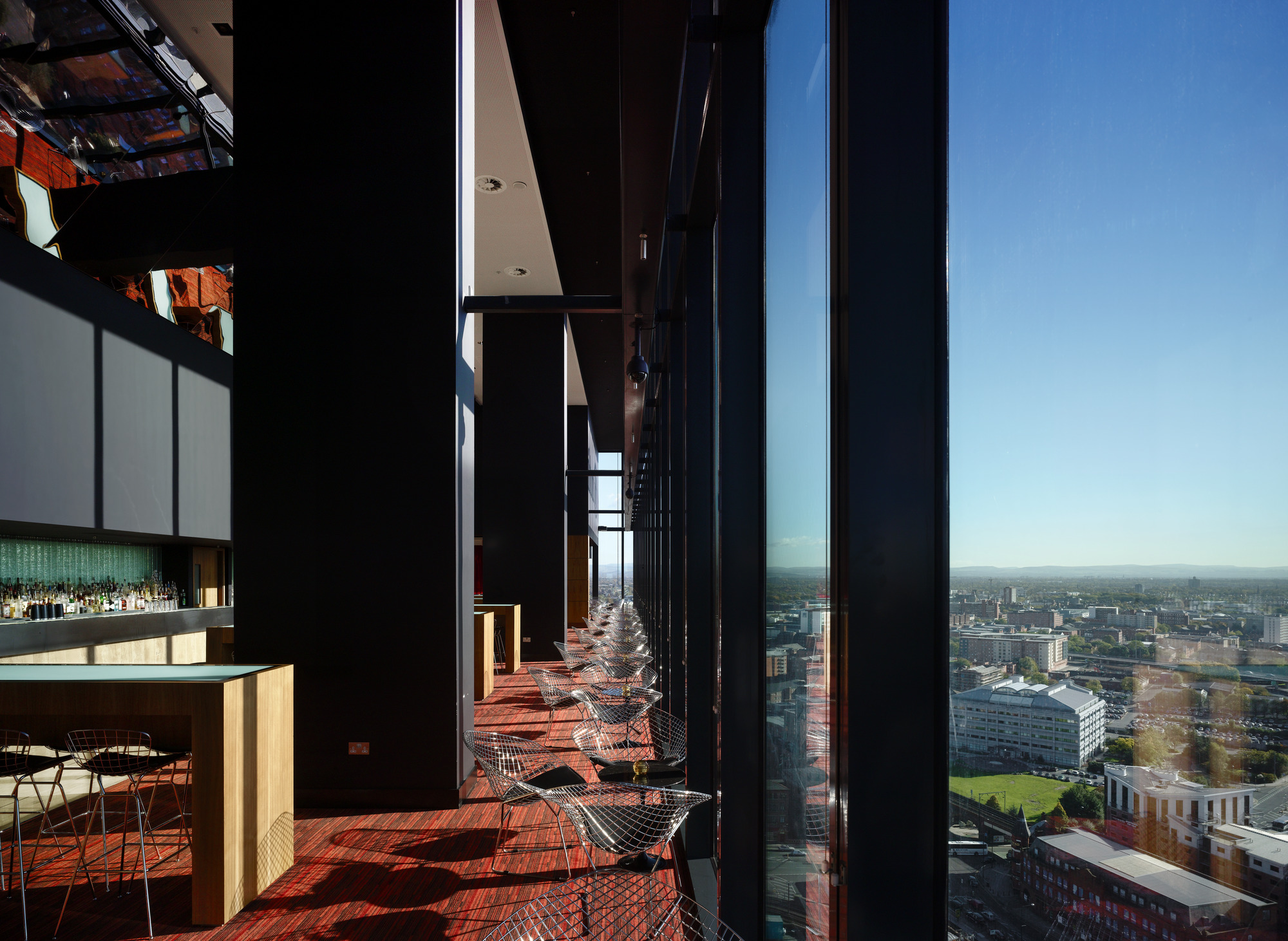 The tower is orientated on the major urban axes of Deansgate and Liverpool Road that link its site visually to the city-centre and beyond the city to the West. The silhouette of the crystalline elegance of the tower is completed by a slender glazed ‘blade’ that stretches skywards.