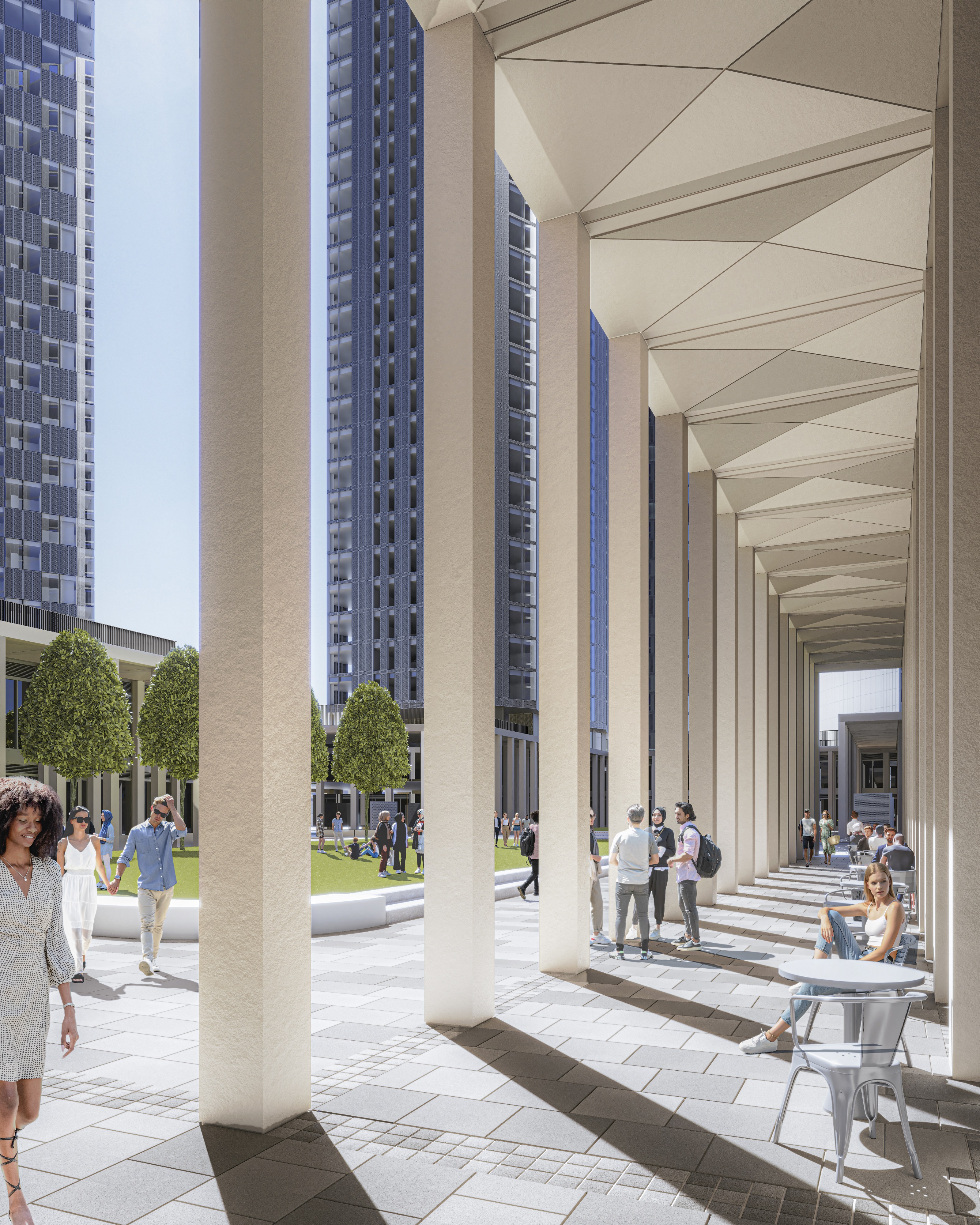 At street level, a two-storey colonnaded podium defines a new public square, an inviting and vibrant space at the centre of the scheme, anchored at each corner by the residential towers.