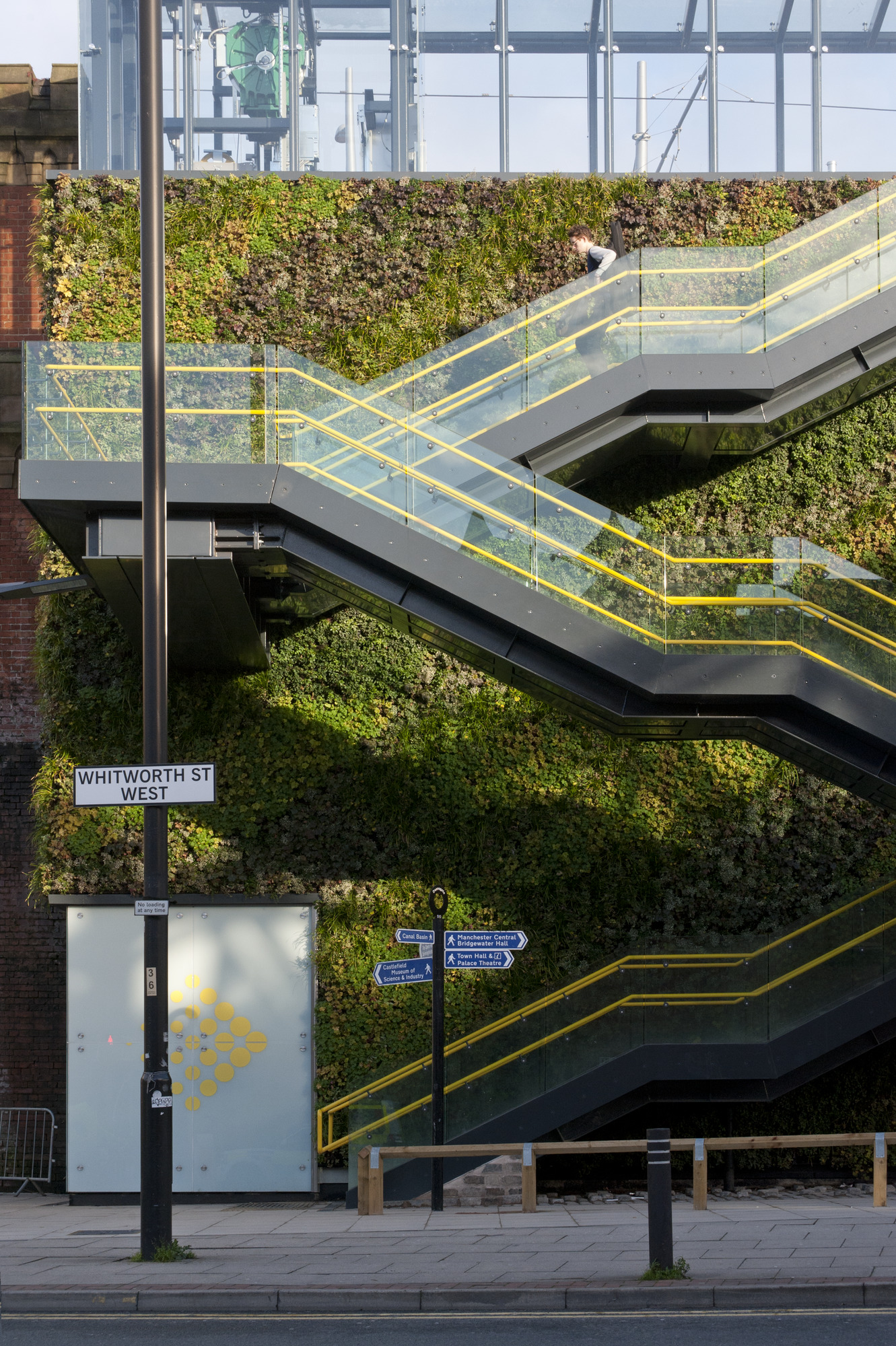 A new living wall incorporating a stair and lift brings the park down to street level and a new stair and footbridge crosses the Rochdale Canal. Removing a 1980s enclosure transforms the rail station footbridge into an open passageway with views and connections to Deansgate-Castlefield and the city.