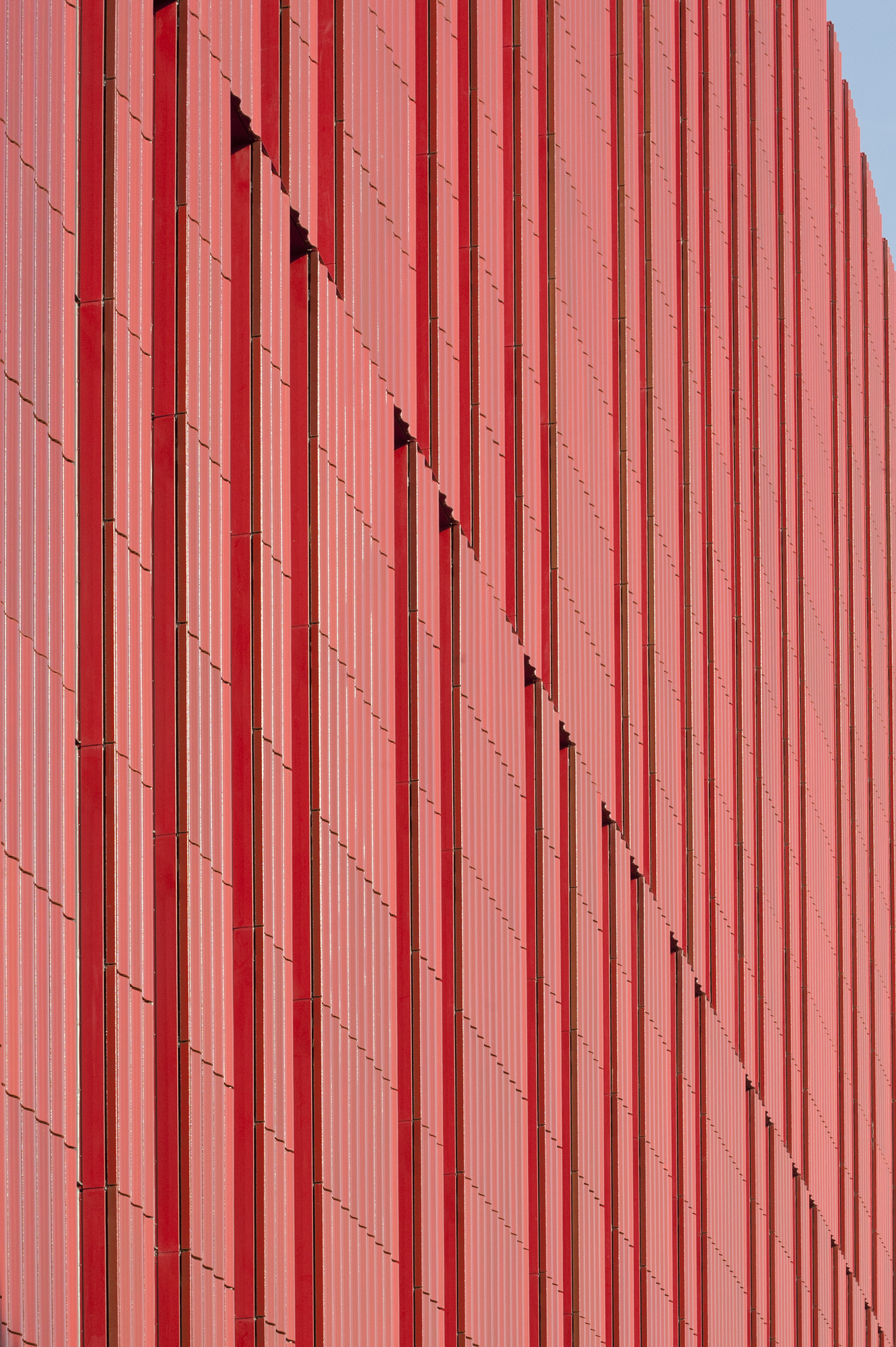 The hotel’s west elevations we designed under the theme of a theatre curtain, in response to the unique context in which the building sits, adjacent to HOME. All elevations are clad in red, glazed terracotta panels with a waved profile designed to represent a curtain on the east façade. The terracotta panels and hotel bedroom windows are vertically aligned, while incorporating a ‘shift’ related to the notched massing in the south elevation.
