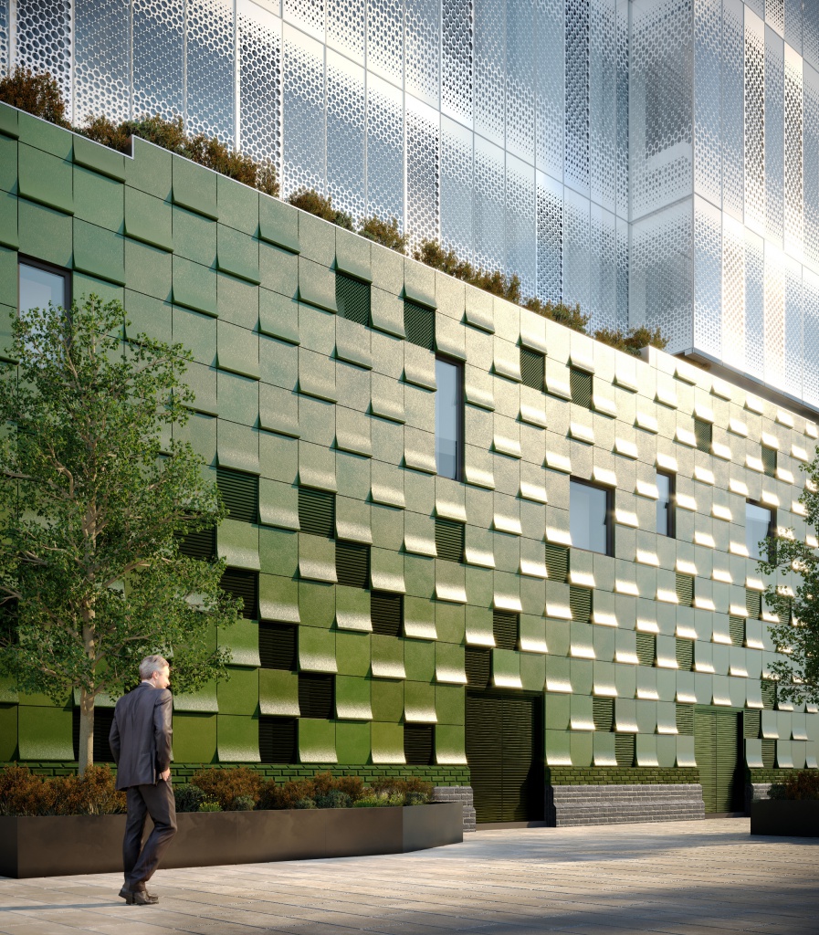 All four buildings are to be constructed from a unitized glazing system with bespoke frit patternation and anodized metal rapid vents. A horizontal frit accentuates the stepping form of Buildings A/B/C which contrasts to the vertical frit pattern of Building D to emphasise the slender nature of the tower.