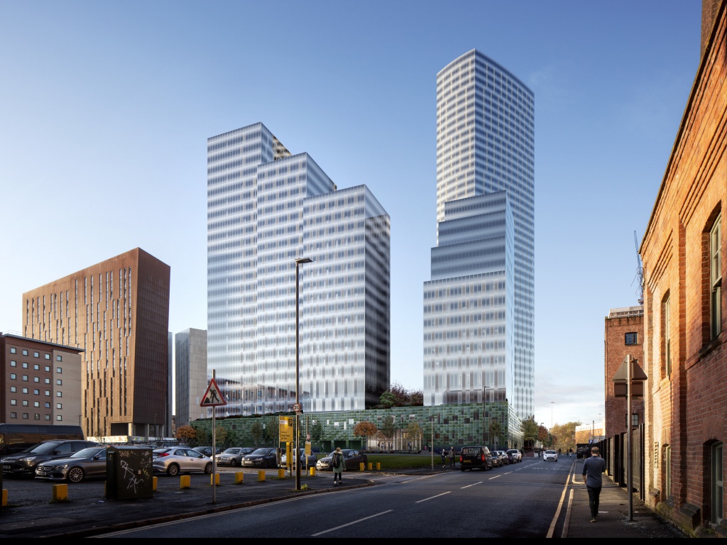 Three of the four buildings are arranged in a linear formation edging the North, East and South sides of the site. The fourth building is free in form and sits as more of an object in the landscape reaching up to 45 storeys. This helps to define and reinforce the street scape and the reinstatement of Newcastle Street provides a direct link from First Street to Hulme and the universities beyond the Mancunian Way.