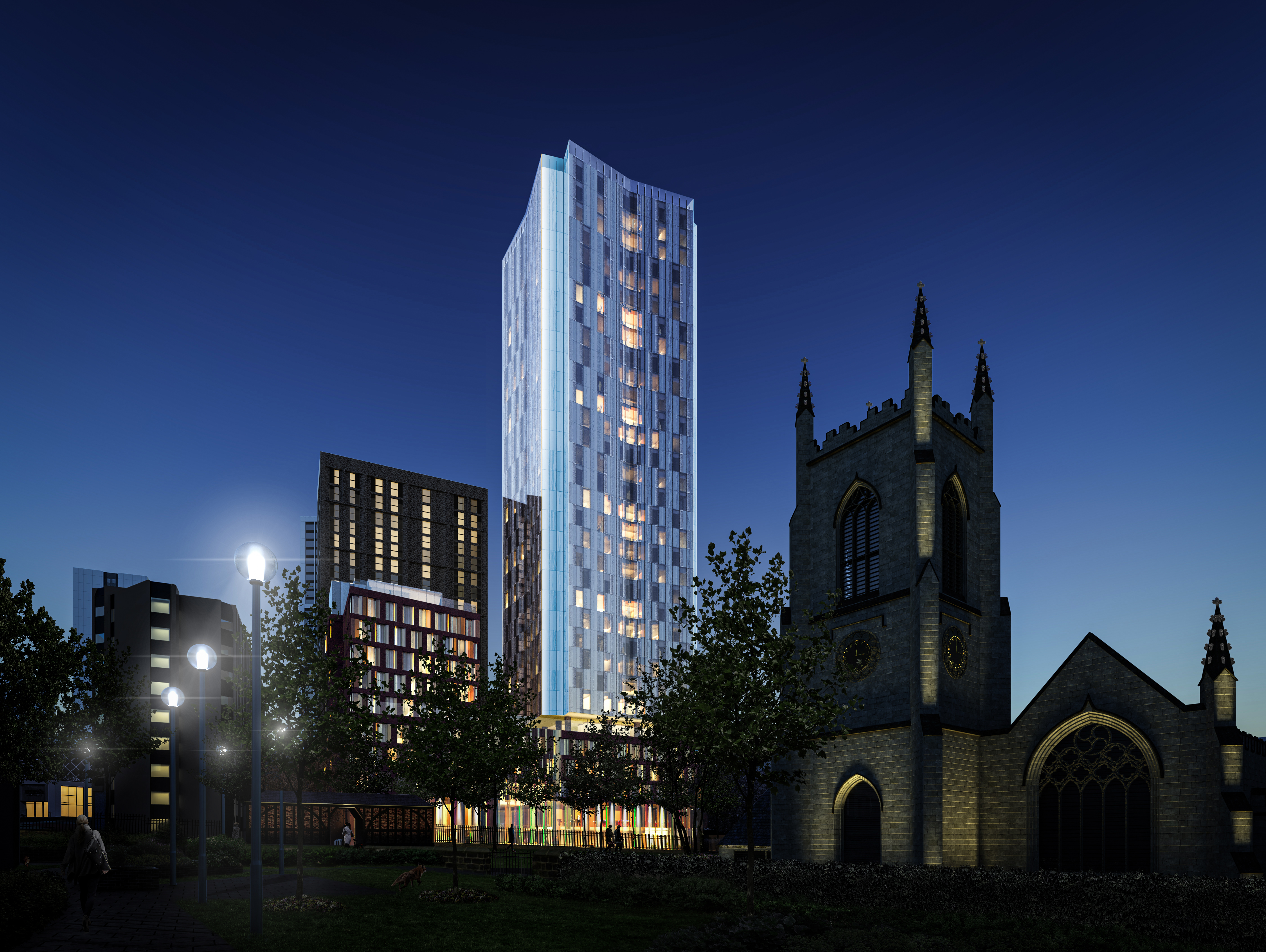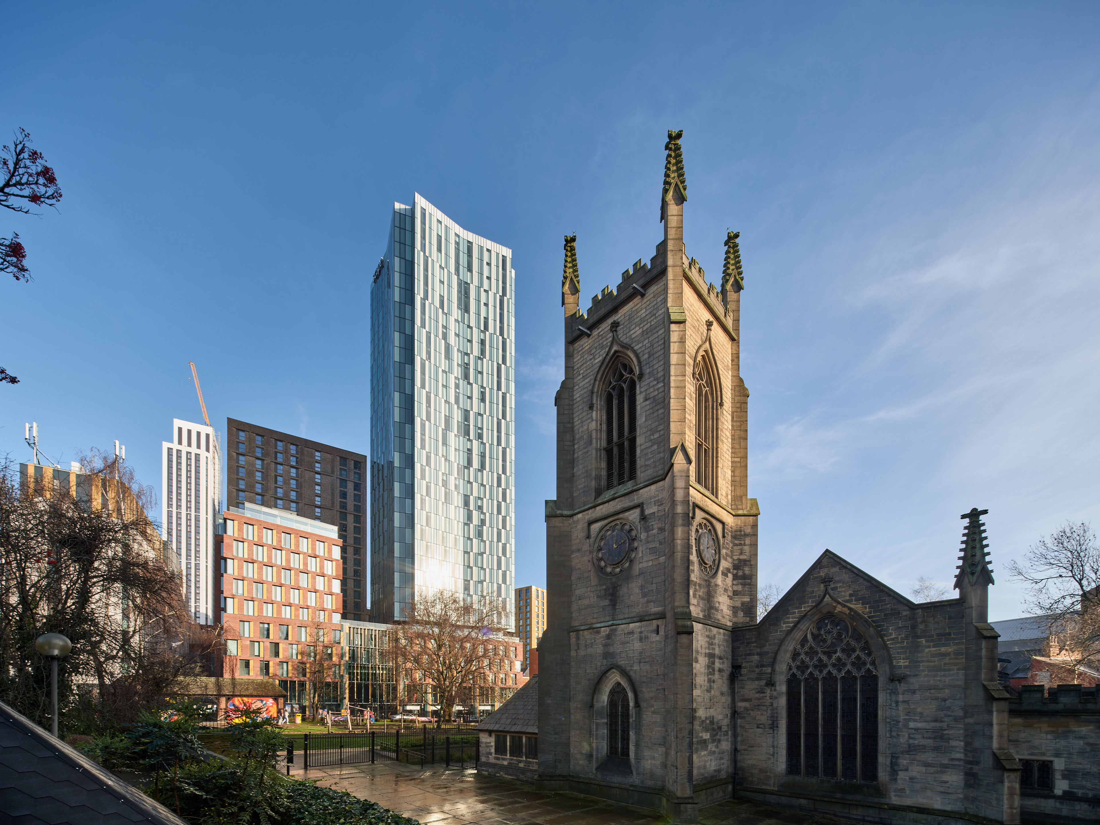 The building is composed of a street scale podium building designed to repair the street edge and step in height to respond to the scale of adjacent buildings. A 32-storey tower sits above, positioned away from neighbouring buildings which has been sculpted to present the same proportions as the spire of St. John’s Church which can be found opposite the site.