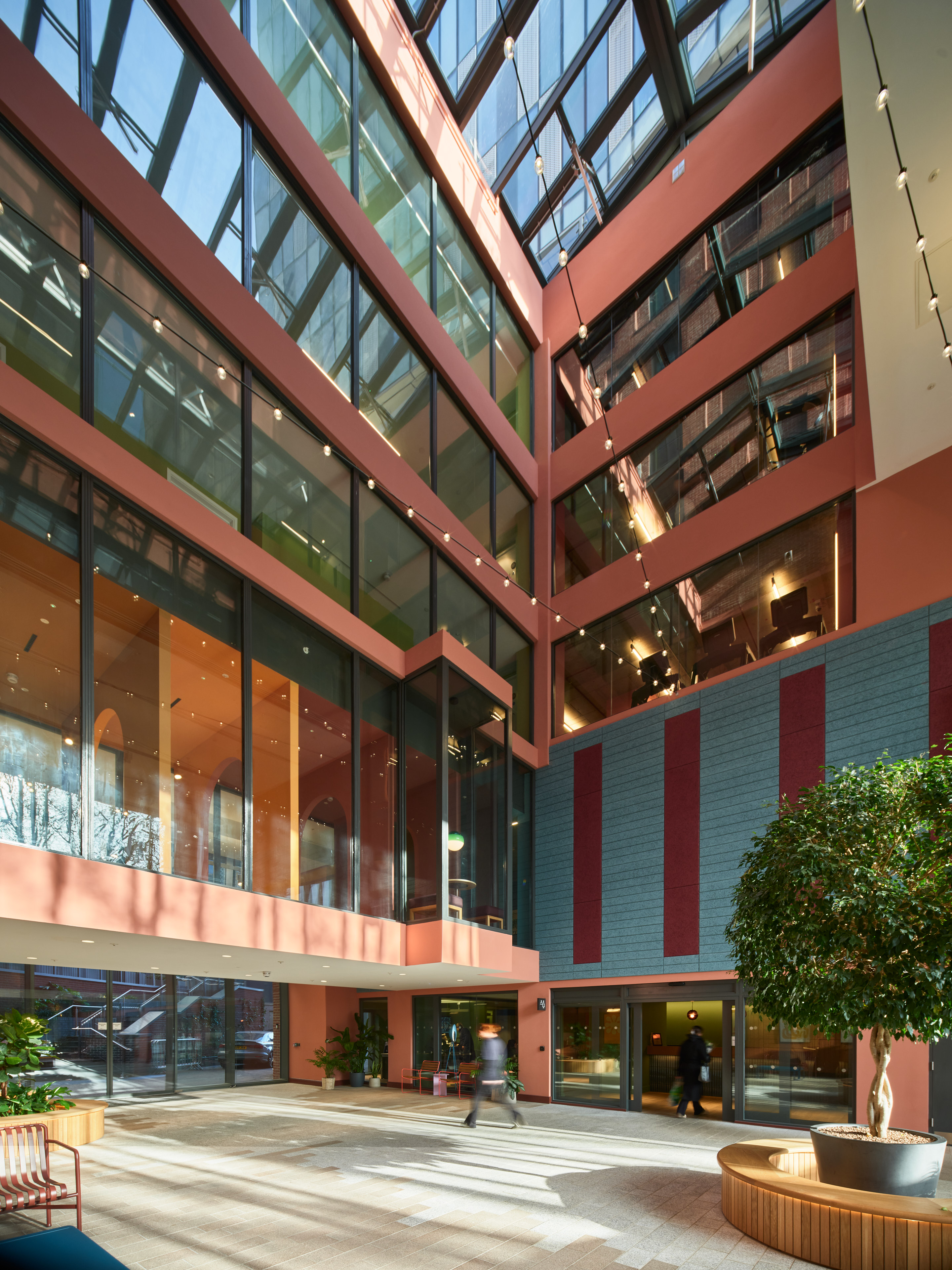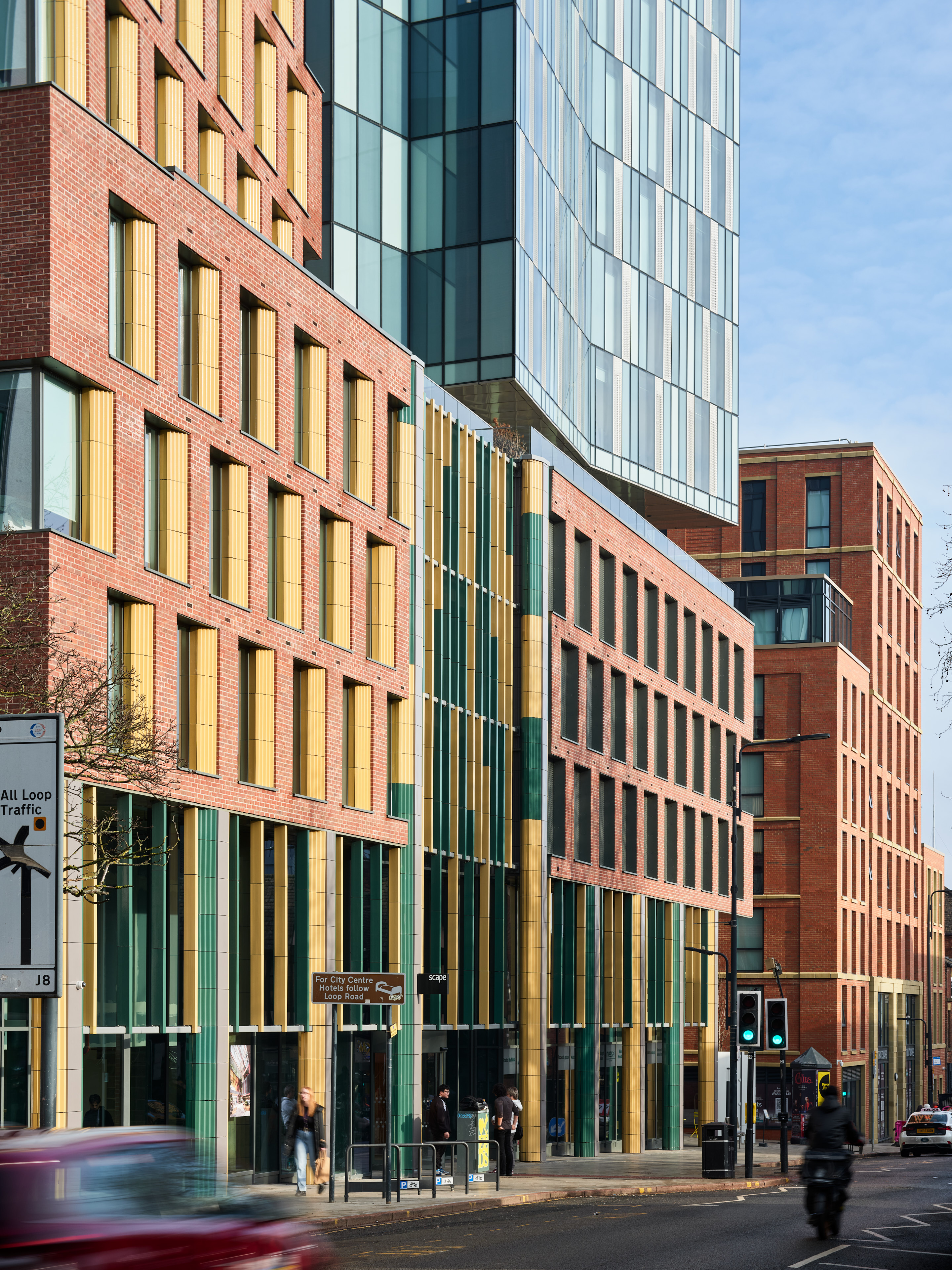 The elevational treatments of the podium and tower are intentionally contrasting, with a red brick cladding to the street building and a glass-faced façade to the tower. The podium materiality takes reference from the material and tonal palette of the historic buildings along New Briggate nearby and features glazed ceramic detailing which is inspired by local Burmantofts pottery. The tower comprises insulated opaque glass panels and clear glazing for a ‘lightweight’ and reflective appearance, which reflects the changing light of the day and seasons in the form’s crystalline facets.