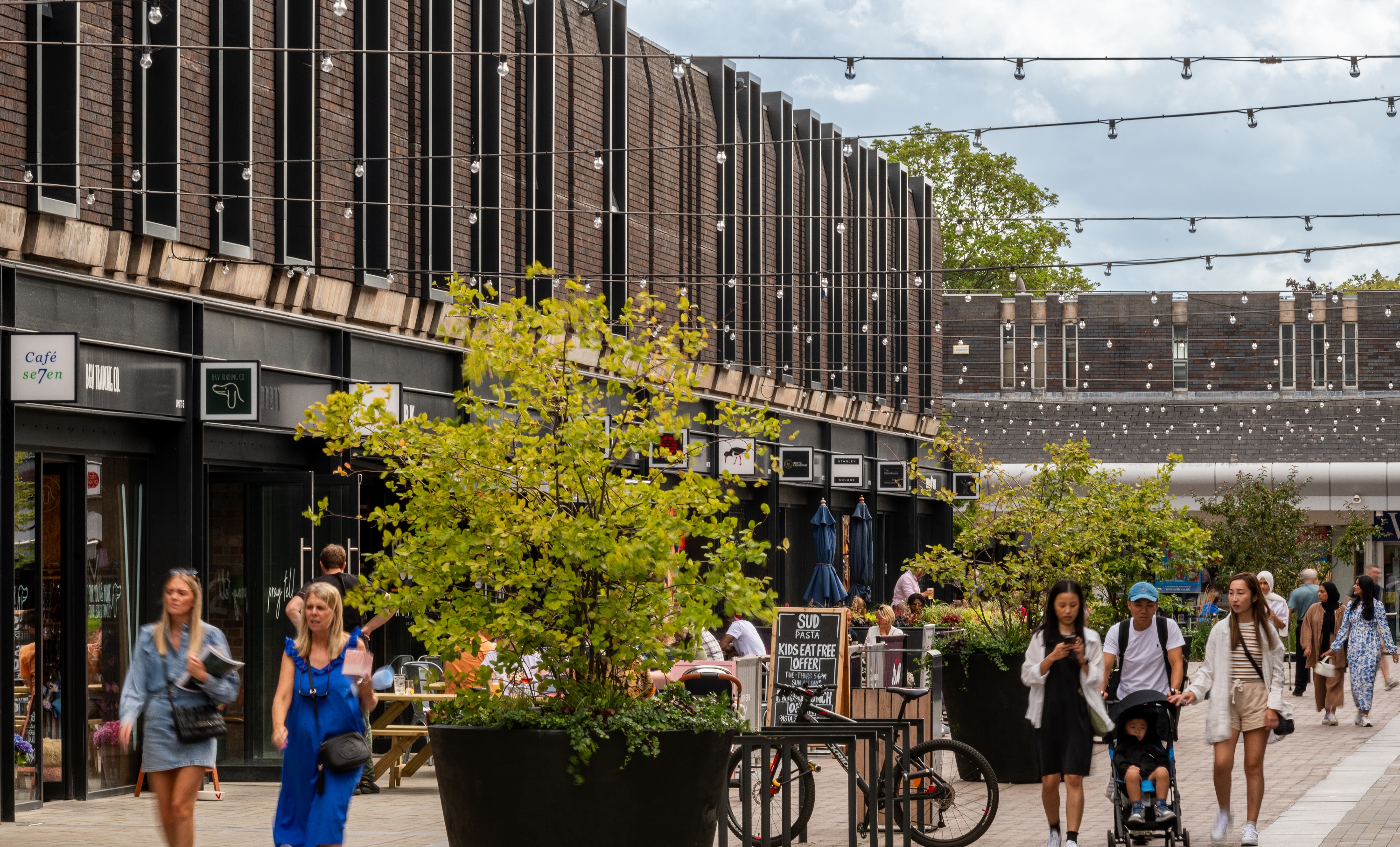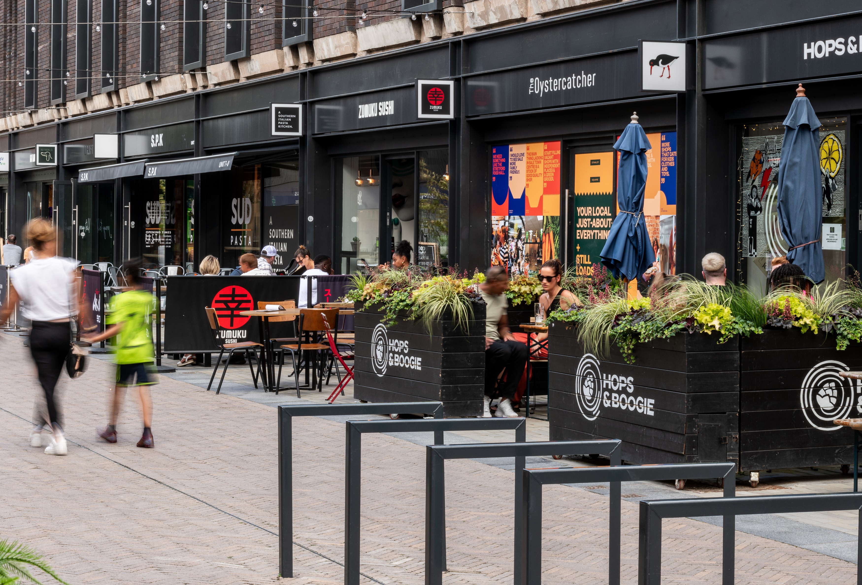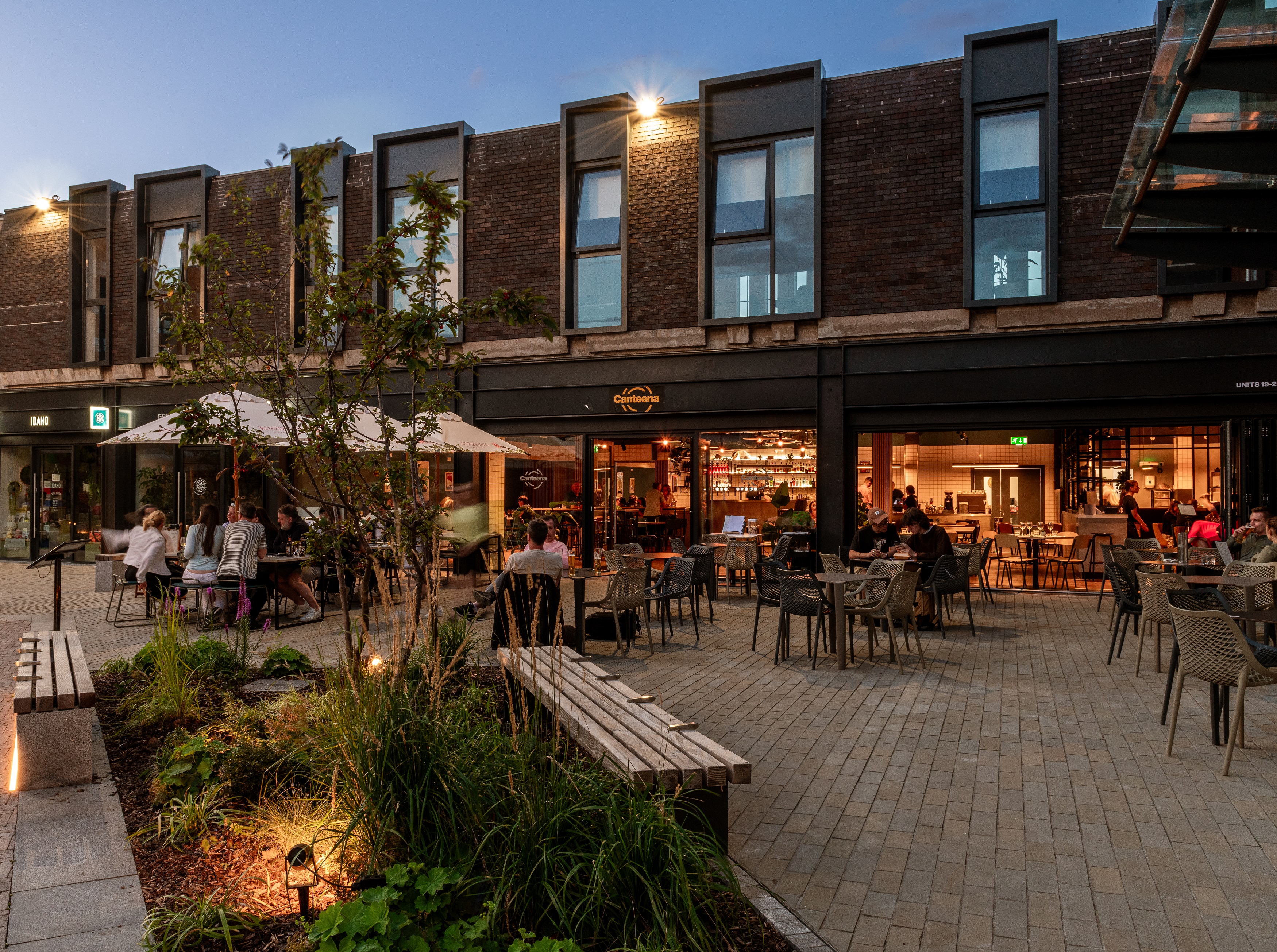 Significant improvements were also made to the appearance and quality of the public realm. The introduction of tree planting and planting beds was used to soften the visual aesthetic of the space, and a reconfigured flexible Town Square space encourages increased dwell time. Cafes and restaurants now spill out into the public realm and the central square provides space for a variety of pop-up activities and events.
