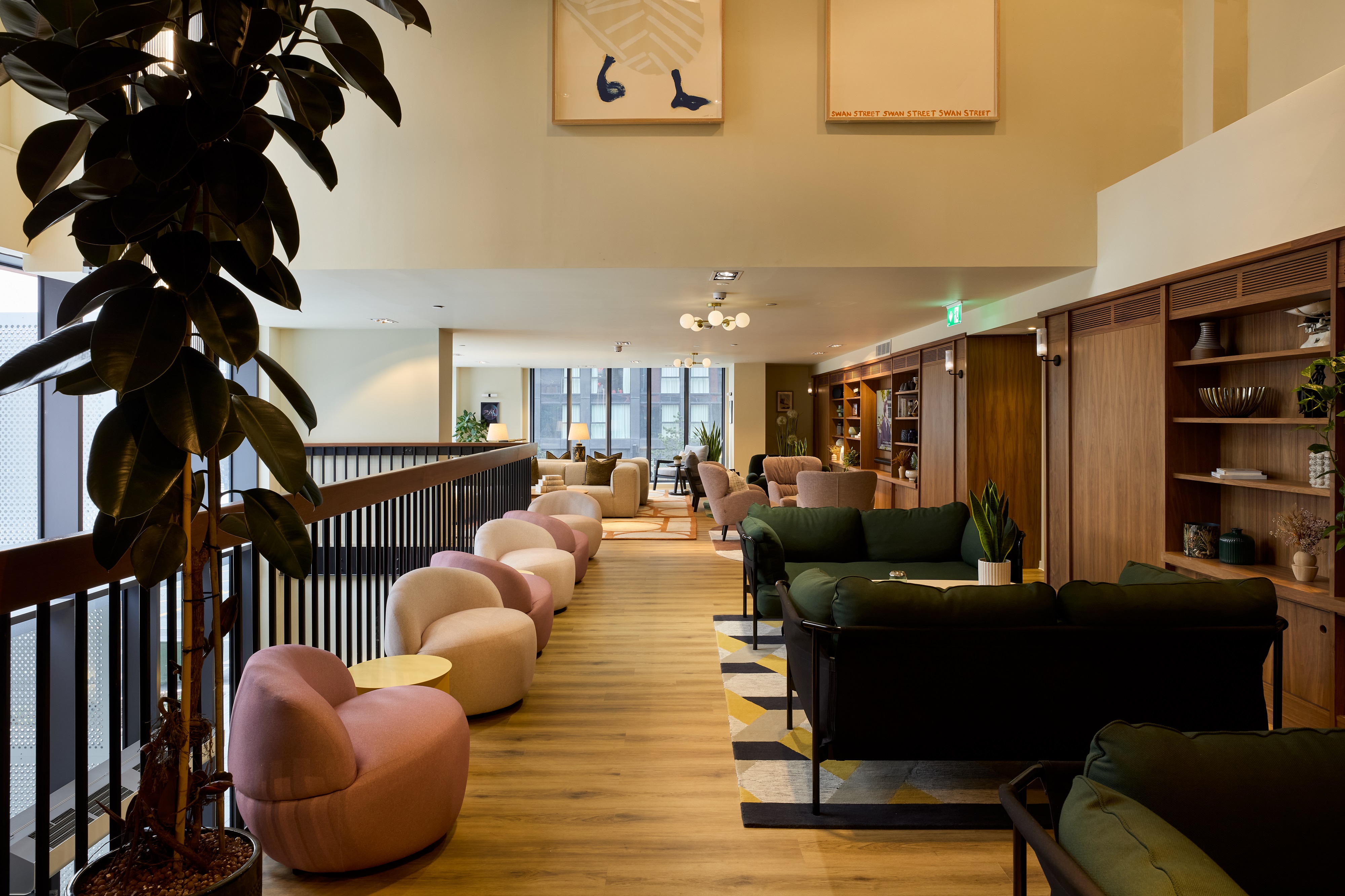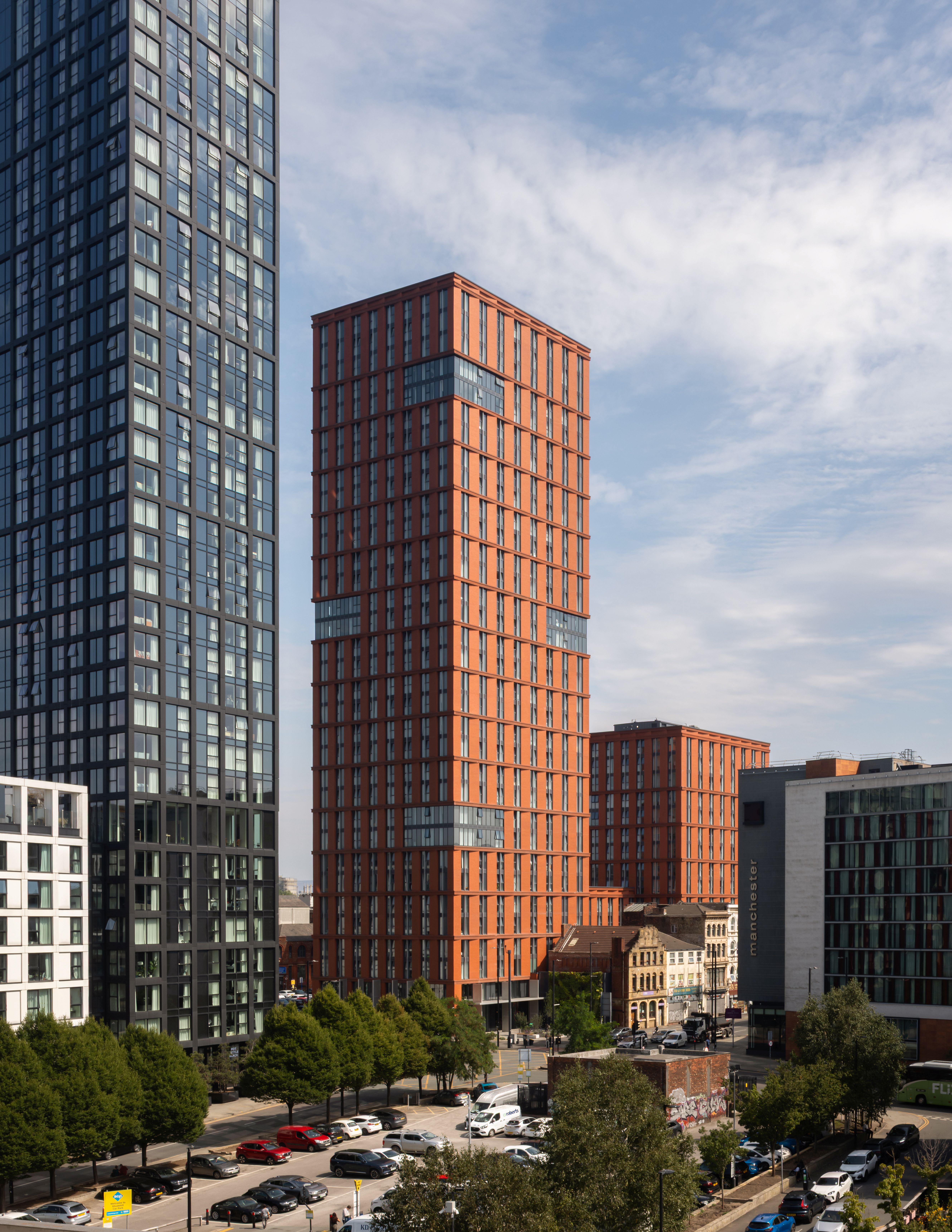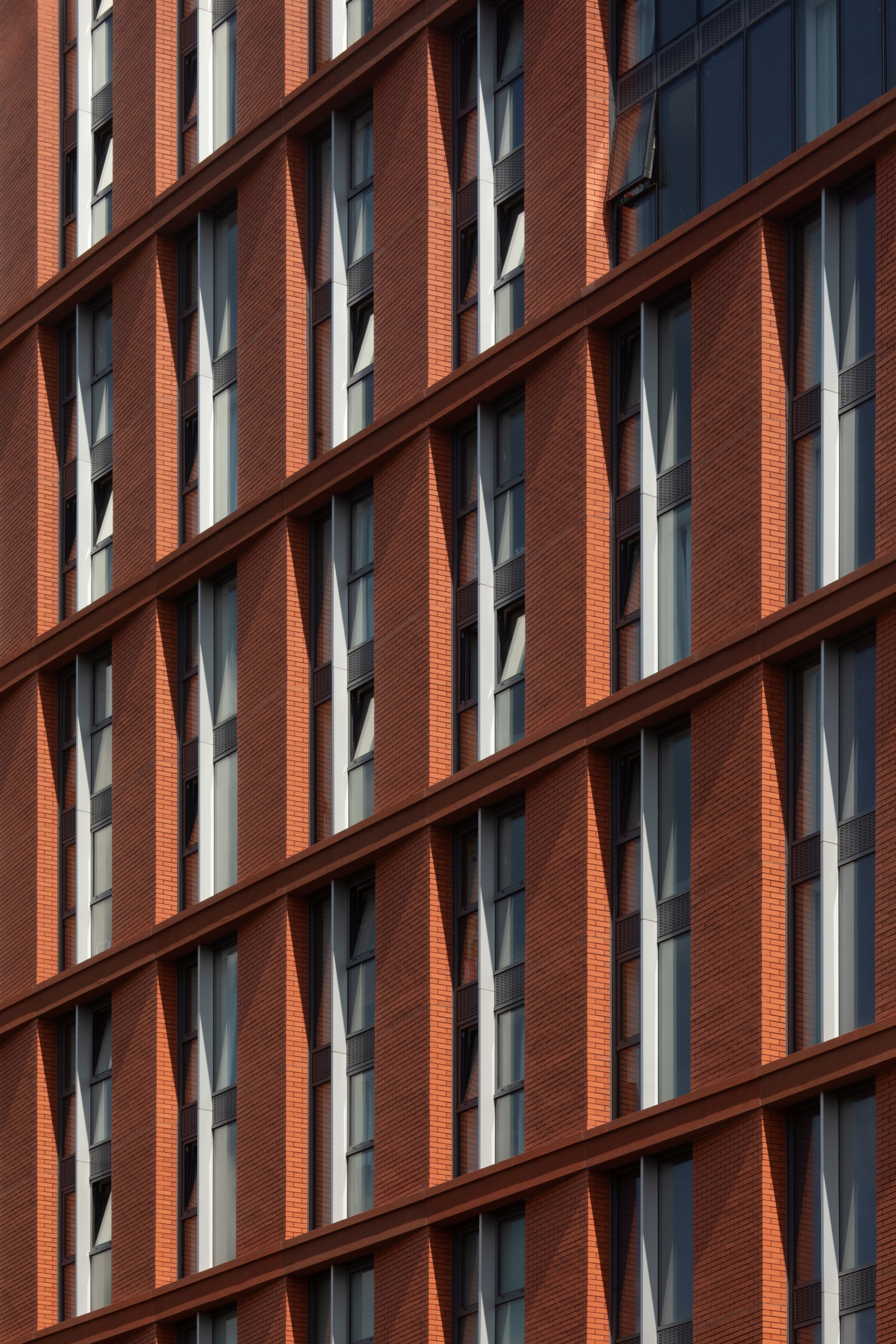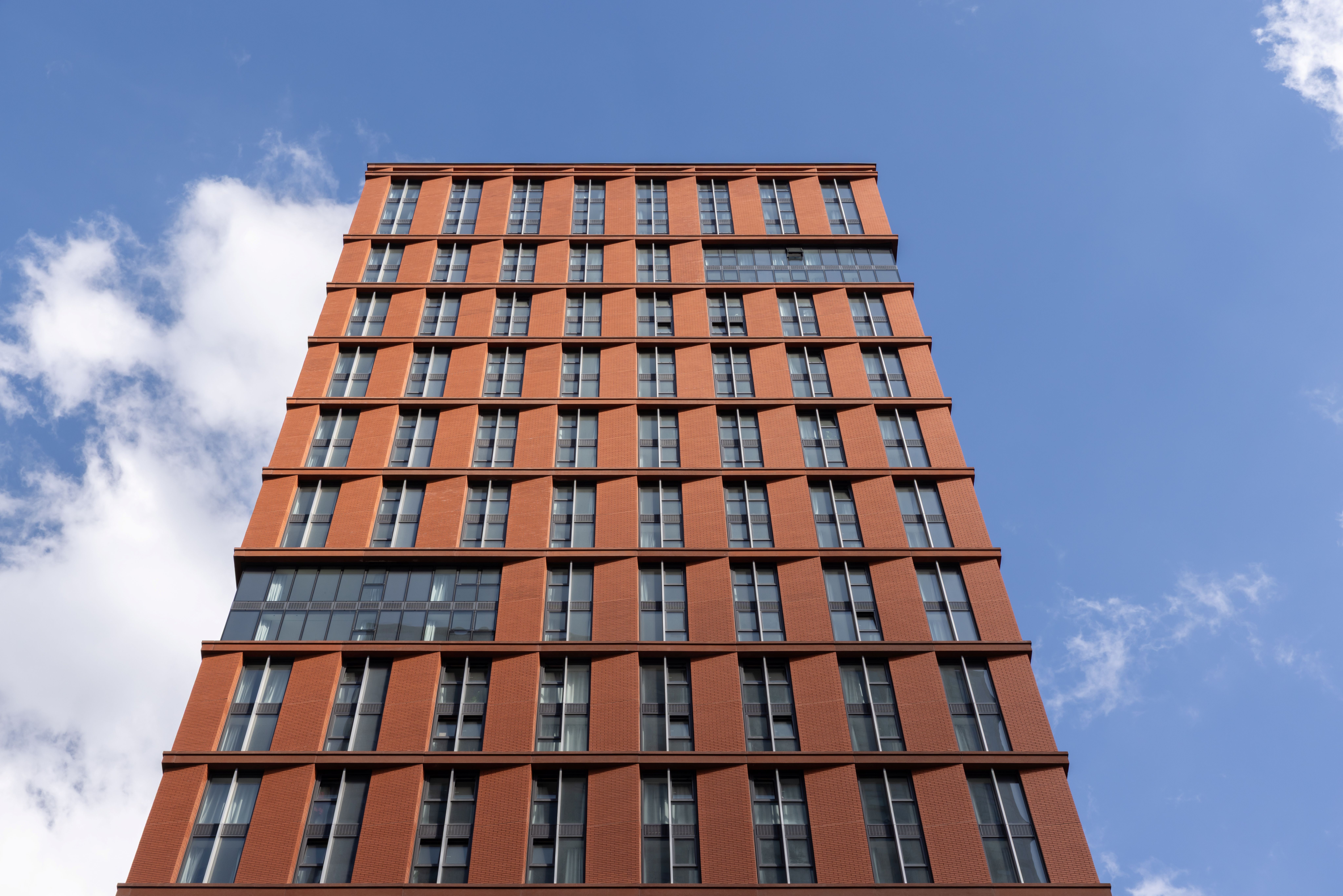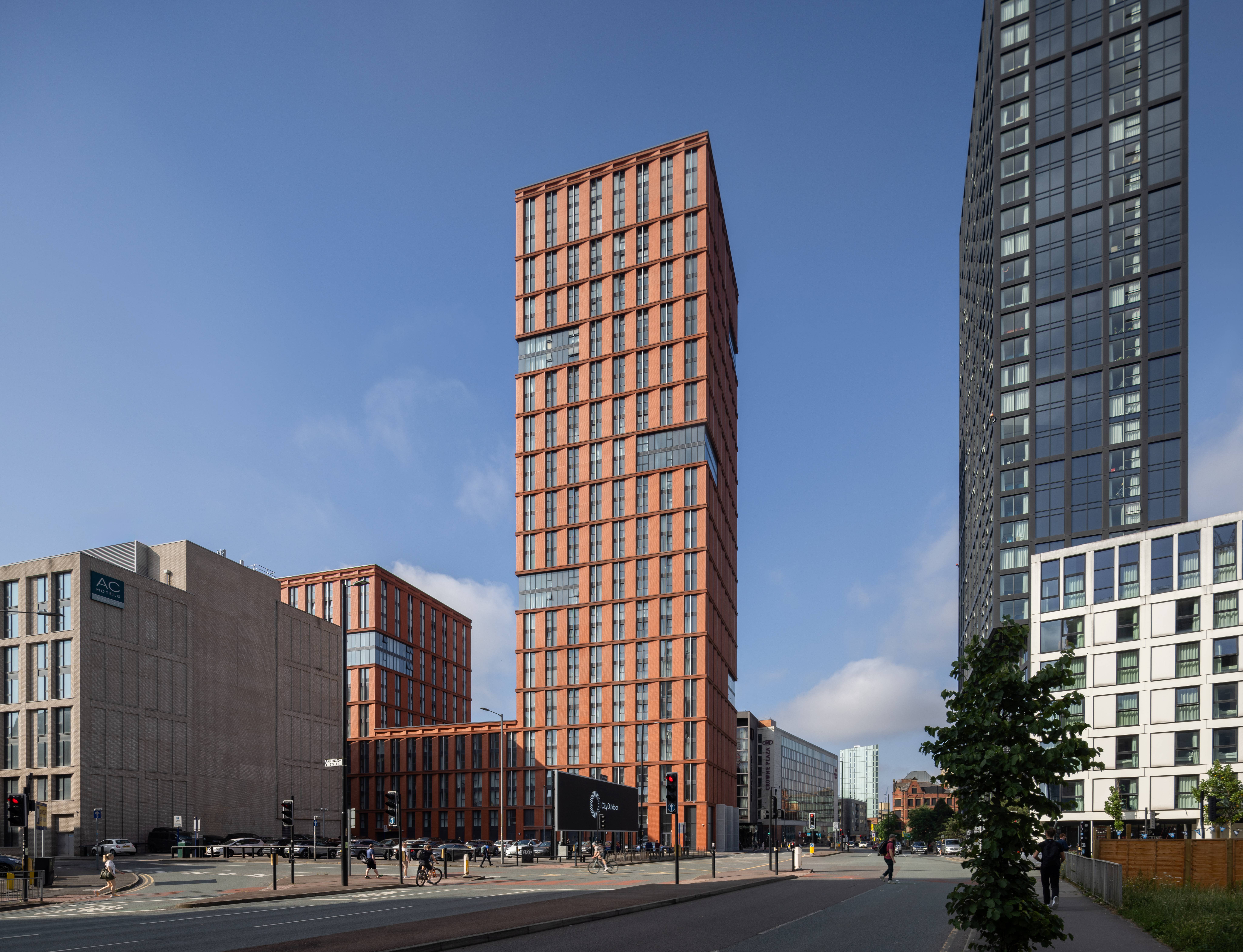 The development is set across a single building containing two towers – 32 and 14 storeys - connected by a 6 storey plinth. The glazed and red brick façade is organised in a grid following the vertical height of two storeys. The materiality was selected for its deliverability, buildability and future maintenance while also keeping in line with the emerging vernacular at New Cross of solid and robust elevations, often featuring brick, as can be seen with our adjacent AC Hotel and Mason Street Aparthotel projects. The angle of the façade’s vertical brick element provides visual interest as the sun moves around the building and shadows are cast on the façade.
