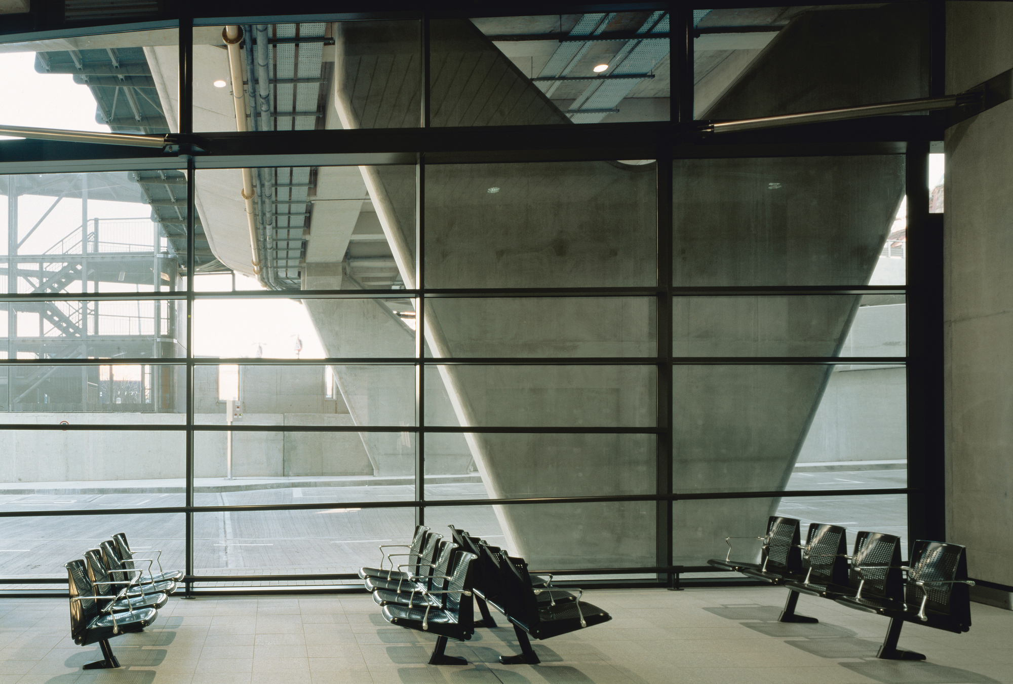 The concourse follows the 3m slope across the site and this change in level prompts the highly efficient tilting floor plates of the parking levels above. At ground level, a steel and glass ‘aerofoil’ canopy provides shelter to the tram stop and defines the primary pedestrian circulation. Clear glazed waiting areas are aligned with the bus stands and there are two metal and glass pod structures enclosing offices, shops, a travel centre and a café.