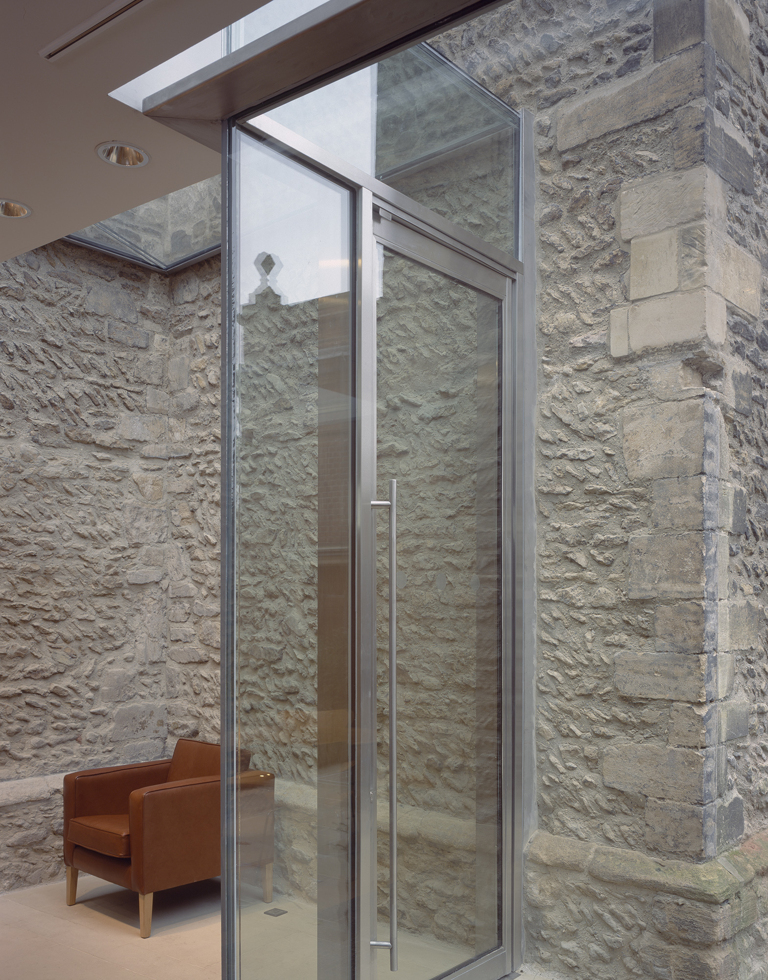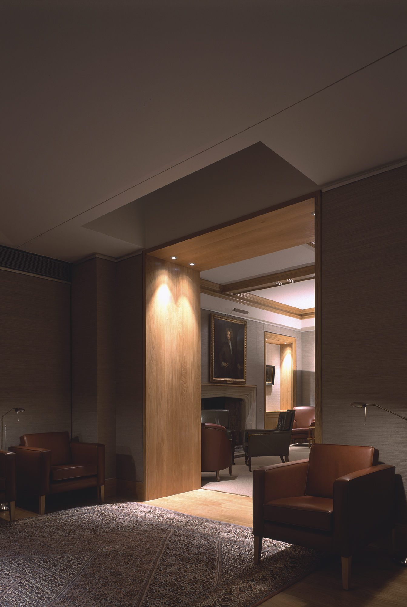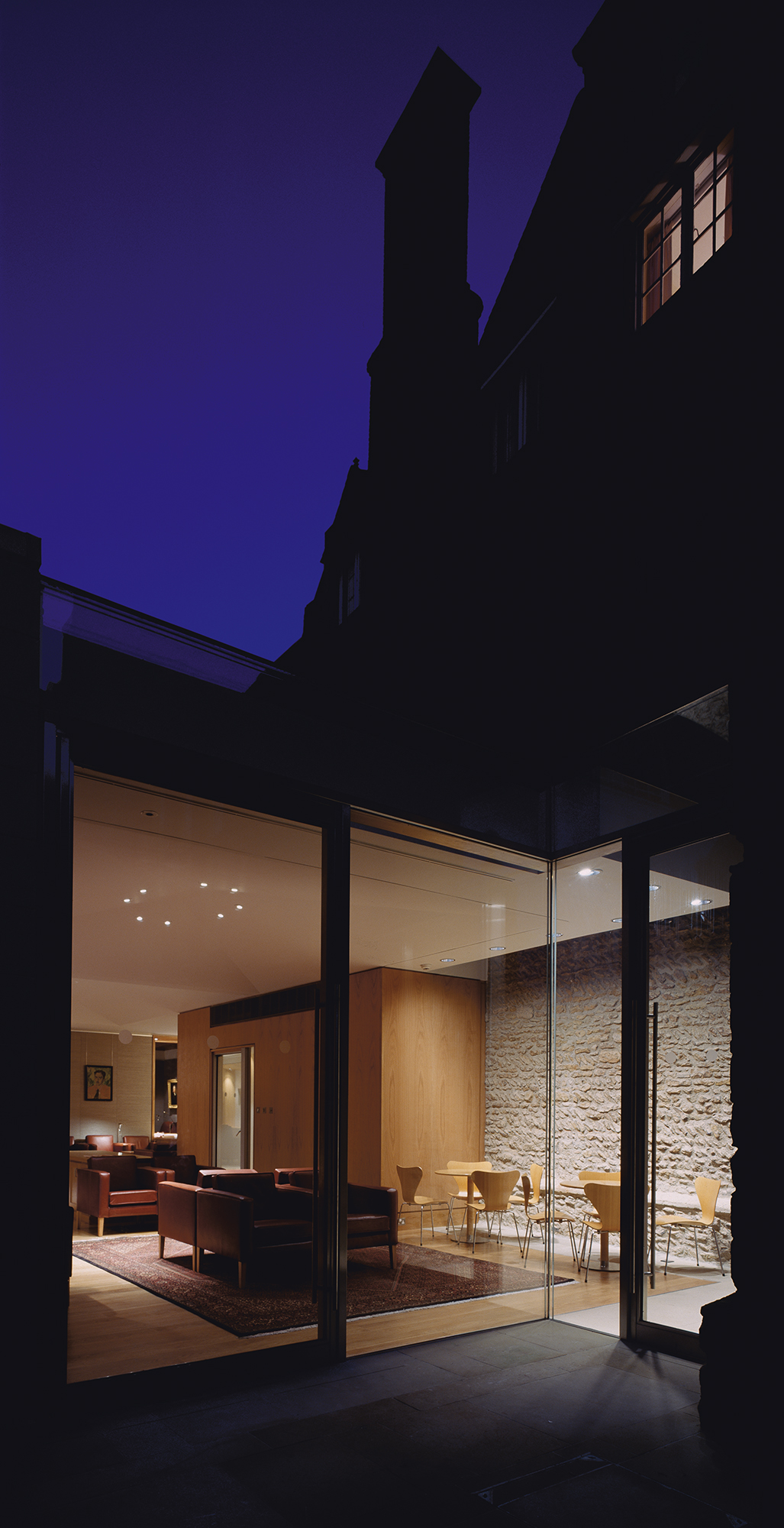 Common rooms are arranged over two levels, allowing the reinstatement of the double-height windows at the ends of the building and interlocking volumes separate graduate and under-graduate students. The contemporary expression of the new interiors is distinguished by the timelessness of natural materials. While traditional techniques were employed to restore original features, the latest insertions whose finishes comprise stone, leather and oak, are detailed with simplicity and clarity.