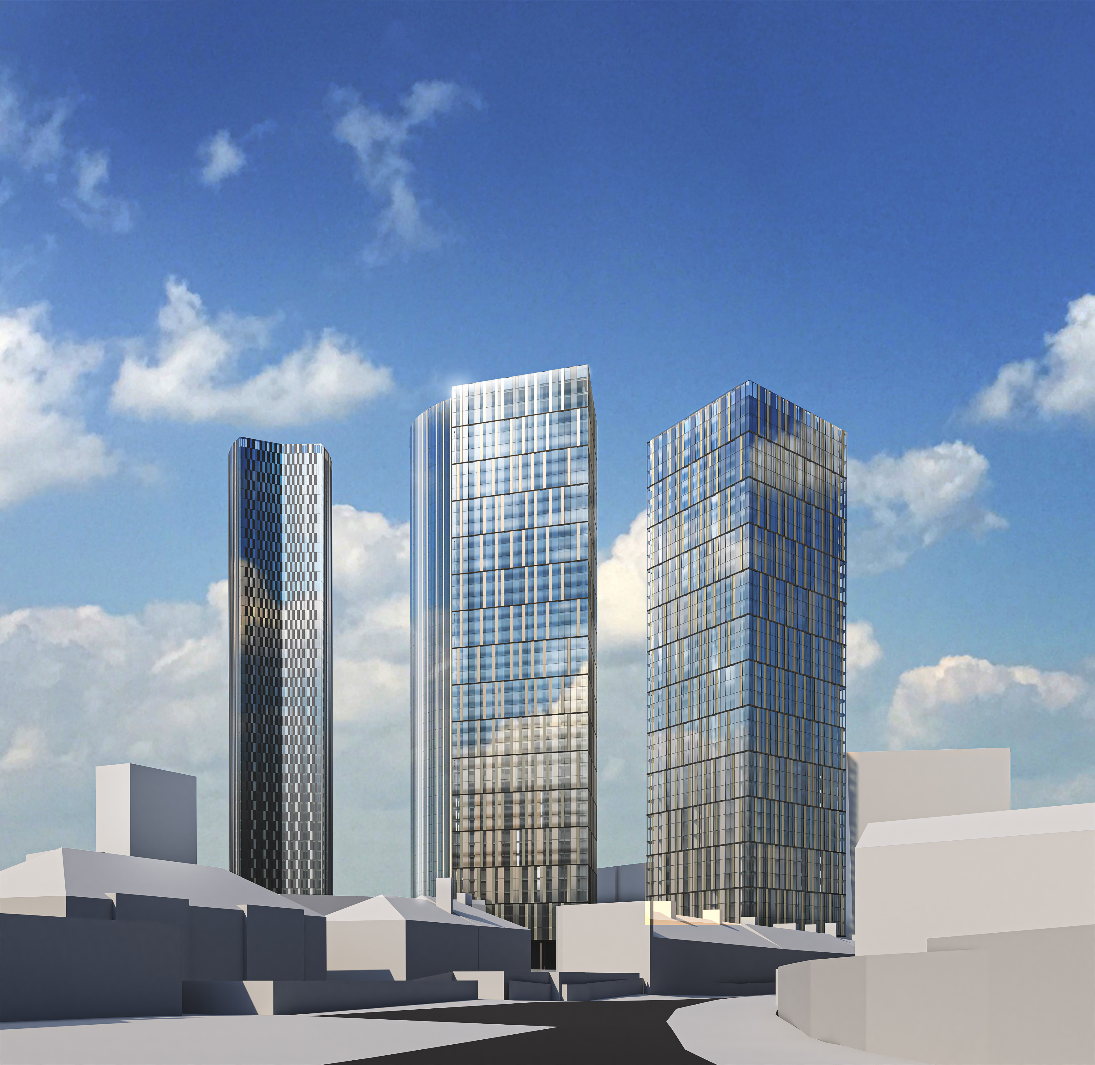 The Trinity Islands proposal will deliver 1,950 new, high-quality homes across four residential towers of heights varying from 39 to 60 storeys, transforming the former car park which is currently established on the sites. The proposed development uses pairs of different and unique building forms to provide identity to each site within a cohesive whole.