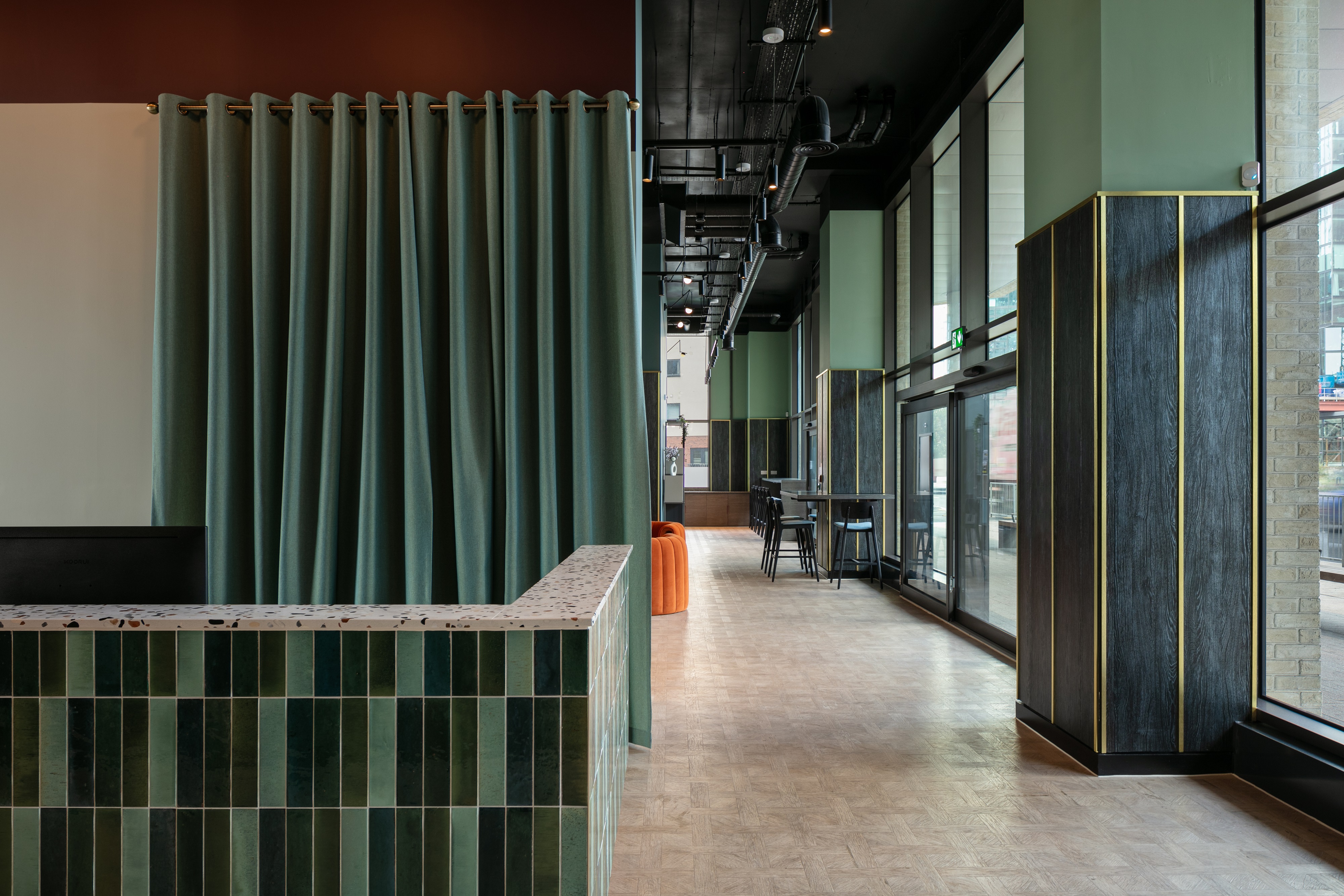 The façade design developed from an exploration of the surrounding historical context. Visual and material references were taken from nearby historic mill buildings to create an orthogonal and ordered fenestration pattern contained within an expressed regular brickwork grid, and emphasised through the use of reveals to create modelling and depth. Different brick bonds are used to further emphasise the planes within the façade, and further layering is provided by the use of anodised aluminium perforated ventilation panels, the perforation patterns of which are generated from other brick bond patterns typical in the area.