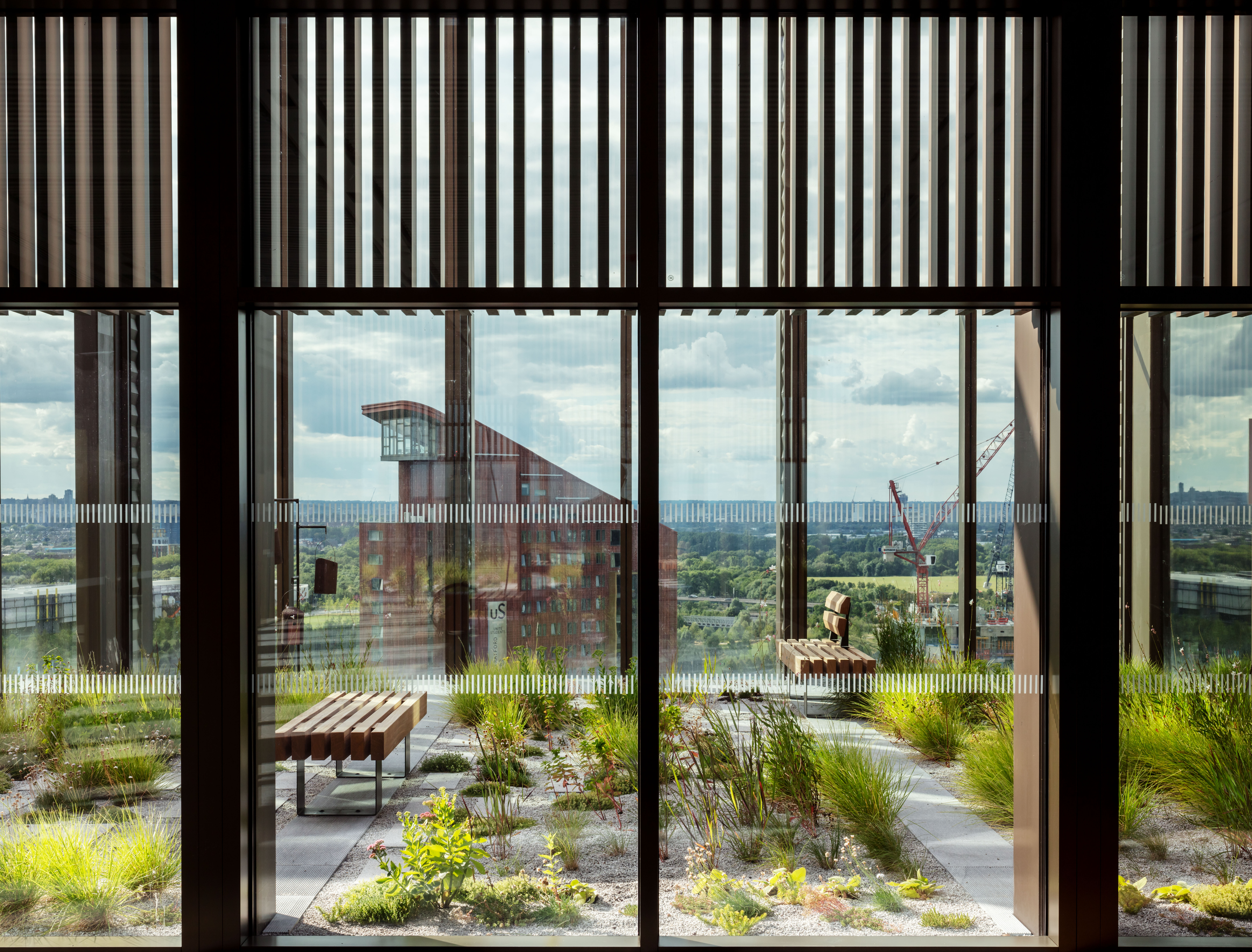 The building is crowned with a screened landscaped roof garden that enjoys outstanding views to the Queen Elizabeth Olympic Park and the London skyline beyond.