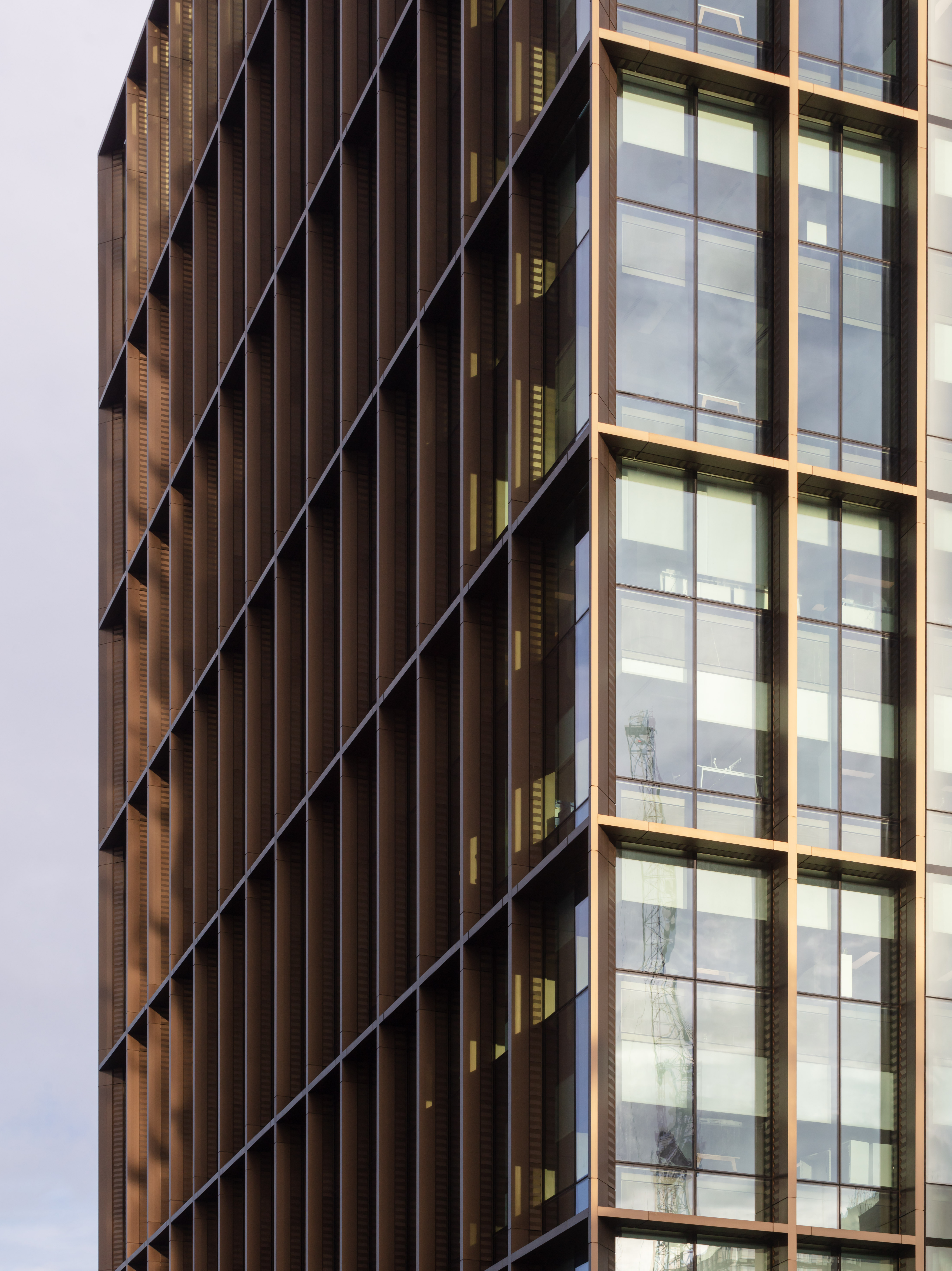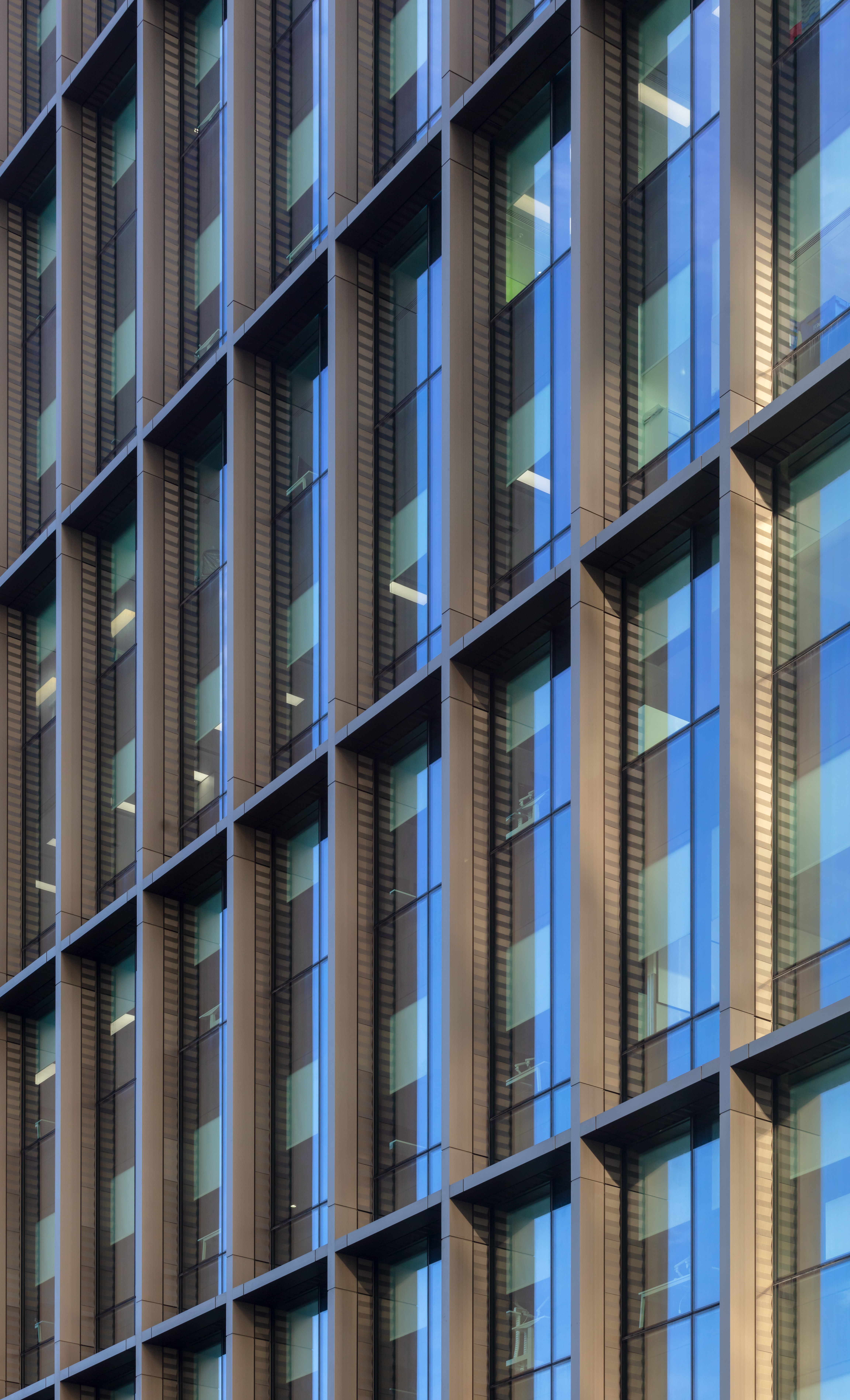 A high performance unitised glazed façade encloses the accommodation, maximising natural daylight and utilises solar coatings and ceramic fritting to mitigate solar gain. The principal façade fronting Westfield Ave comprises a deep profile bronze anodised aluminium super-grid which elegantly defines scale, proportion, and articulation. Close to the glazing, the reveals of the grid are decorated with bronze anodised concertinaed bands which animate the façade with their play of light.