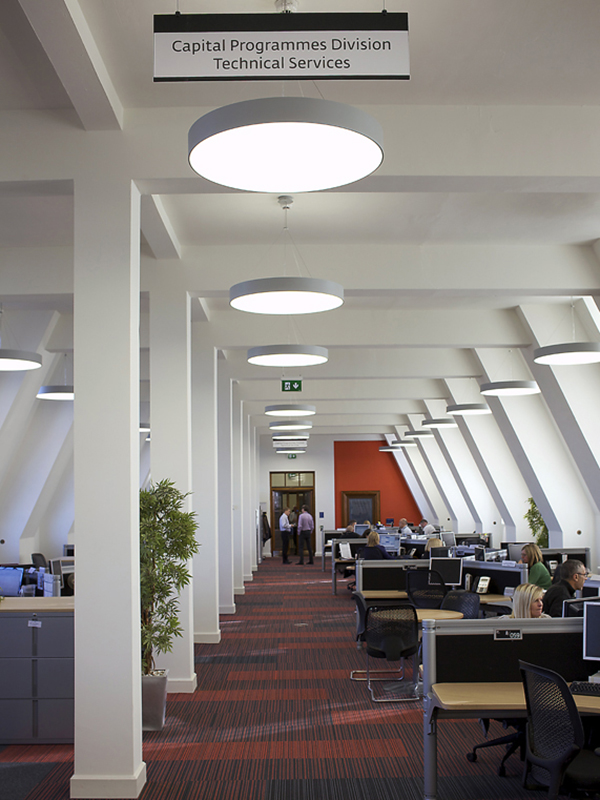Town Hall Extension: Refurbished office corridor with new interventions, such as the service rafts in the office areas, are clearly contemporary but combine effectively with the listed fabric