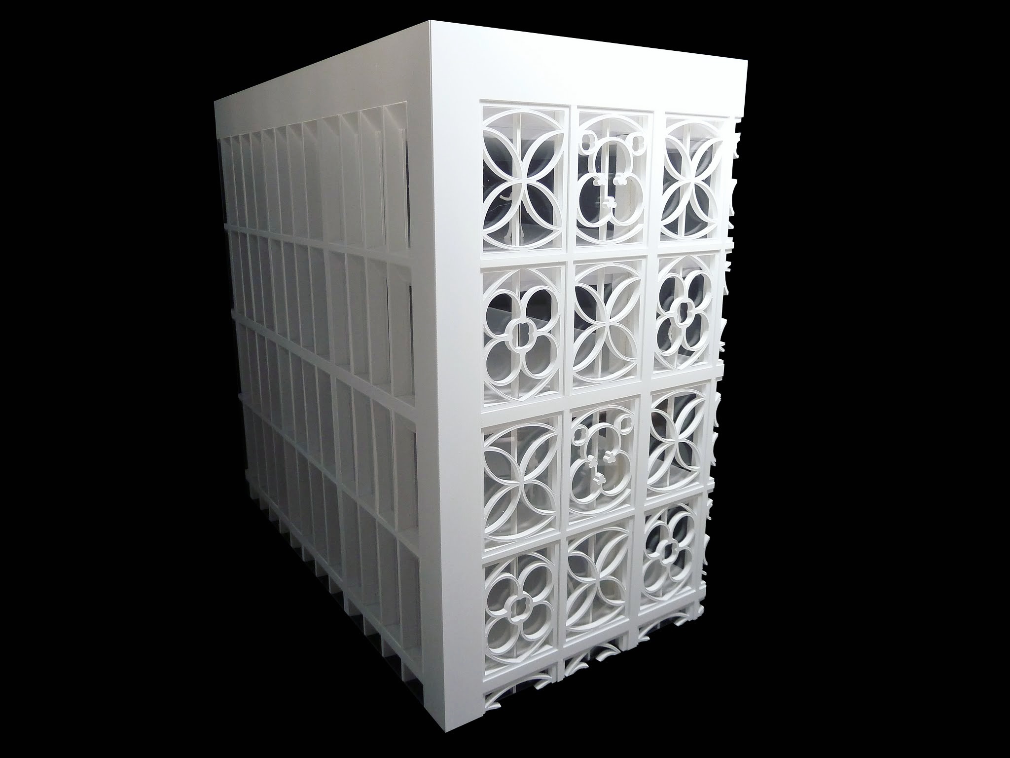 Created at a larger scale than the context model, the detail model focuses on specific building aspects, such as internal spaces, materiality, construction or circulation around the building. This helps us to develop the design, breaking it down into its different components, revealing what works well and what requires resolution. A model showing a section of the Two St Peter's Square elevation was built at 1:50 scale to give a sense of the scale and proportions of the building’s tracery panels.