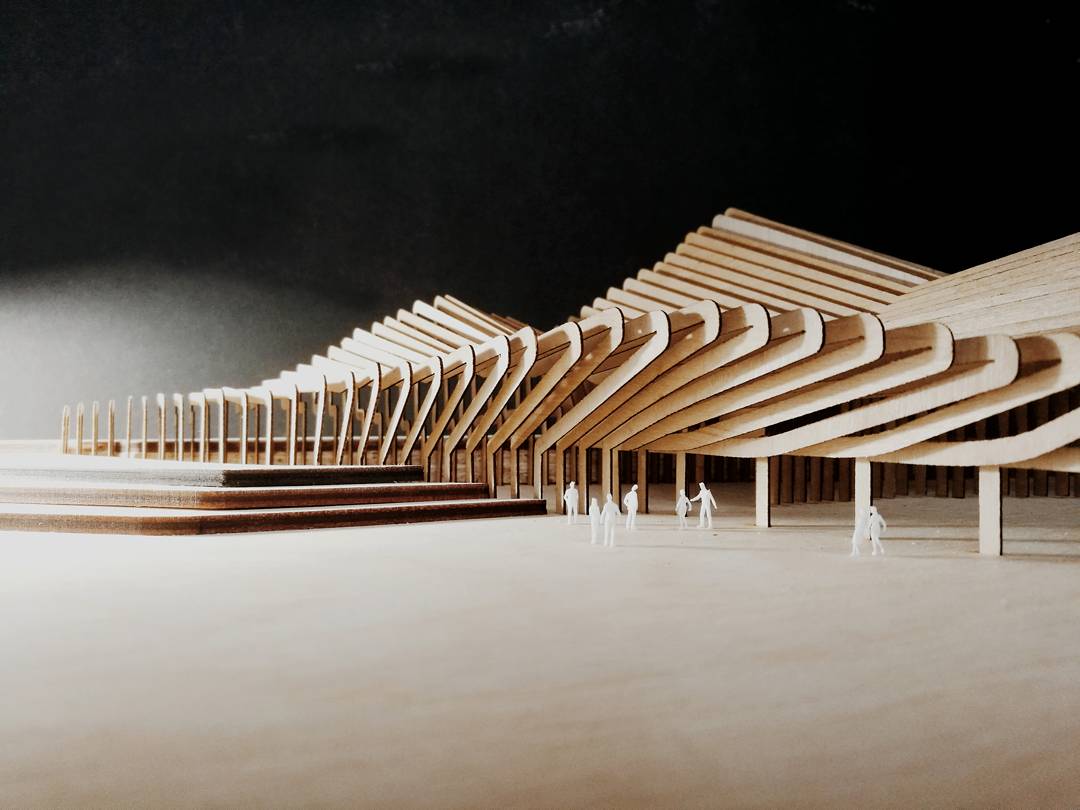 Models are used to communicate aspects of a development. At first, we use a model as a reference to explain our design. Model materials and construction techniques can also communicate our ideas. For our shortlisted competition entry for the Science and Innovation Centre in Kaunas, Lithuania, a simple layering of laser cut plywood profiles replicated the building’s sinuous, wave-like form, which is proposed as a series of undulating structural timber 'ribs'. The model revealed both the external form and internal spaces.