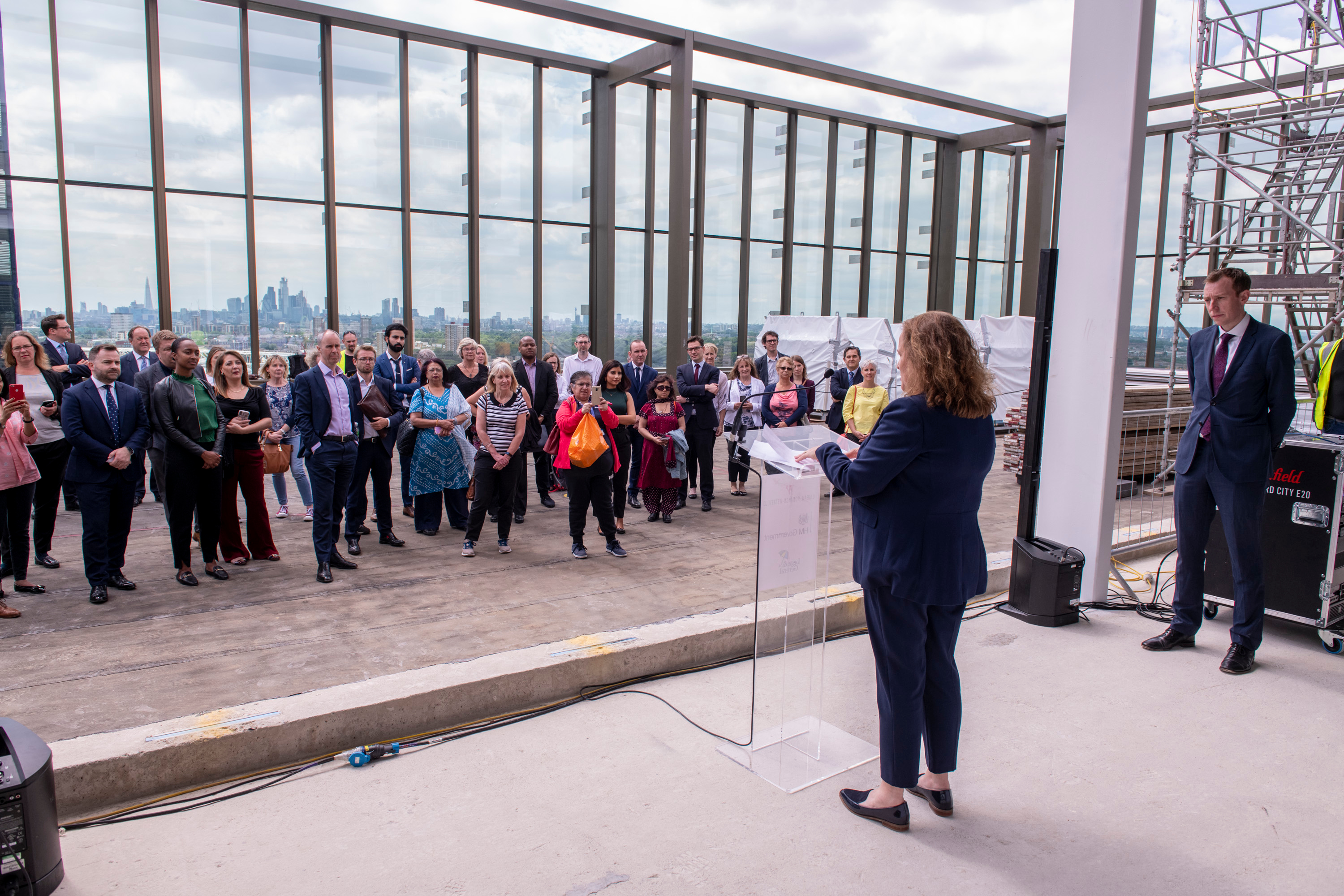 I followed a group of senior executives from Unibail-Rodamco-Westfield, Her Majesty’s Revenue and Customs (HMRC), Legal & General, contractors, and other guests through the dedicated walkway that ultimately lead us to, what will soon be the rooftop garden of the Westfield M7 building. Once on the roof, we received speeches while overlooking spectacular views of the London Skyline - the Olympic stadium front and centre. After the speeches a chrome spanner was wielded to tighten the last bolt and commemorate the topping out of the HMRC’s newest regional hub.