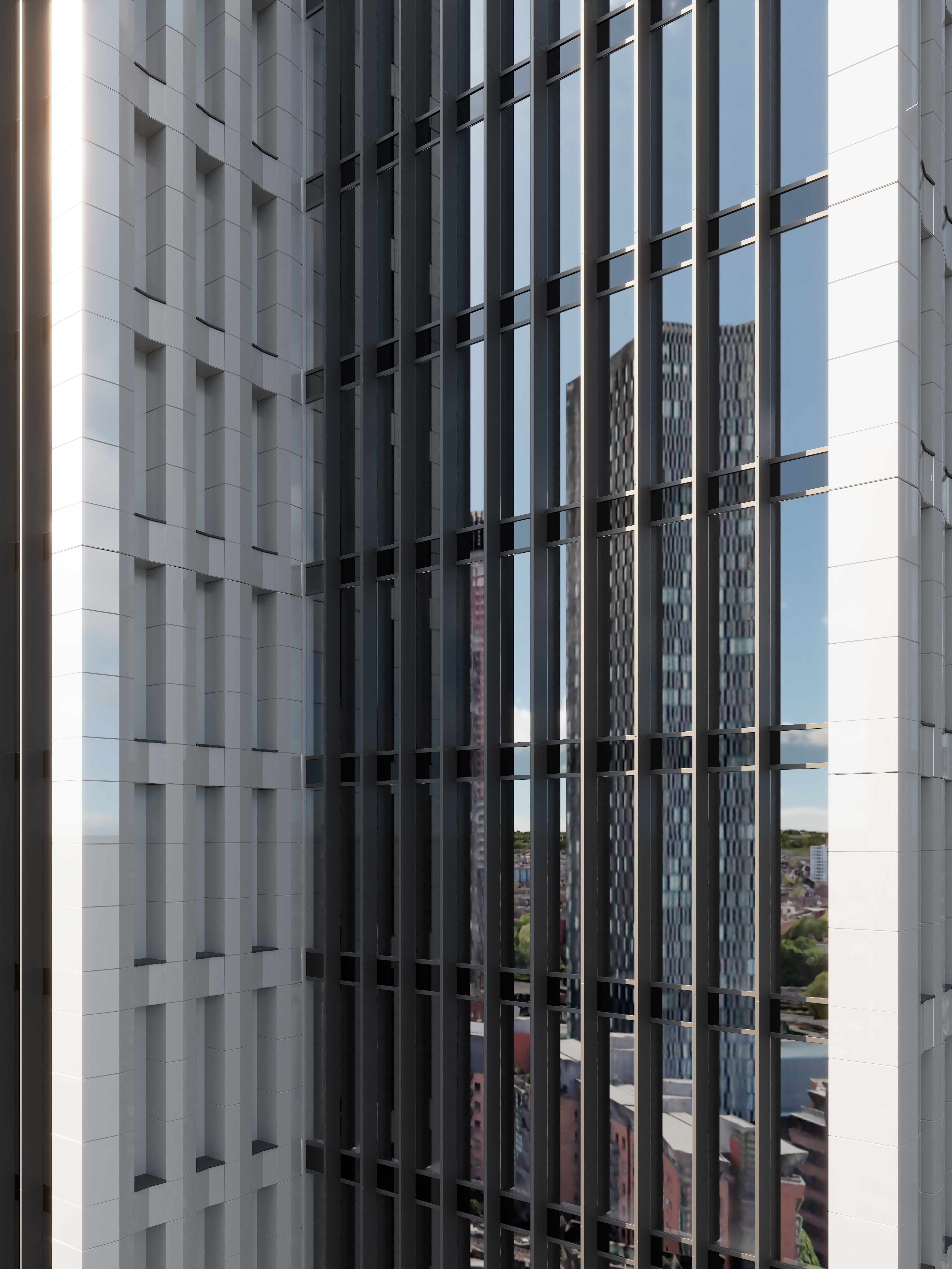 Prominently visible along the Deansgate vista from the city centre, the north facing façade has been designed with a textured and animated aesthetic. Vertical extruded strips have been developed with a unique zig-zag form that alternate in extrusion and inversion, and which accentuate and emphasises shadow and tone. This concept was derived from the historic lattice ironwork prevalent in the Castlefield area, and this feature, rendered in a dark grey tone, echoes the podium of the nearby Beetham Tower it faces.