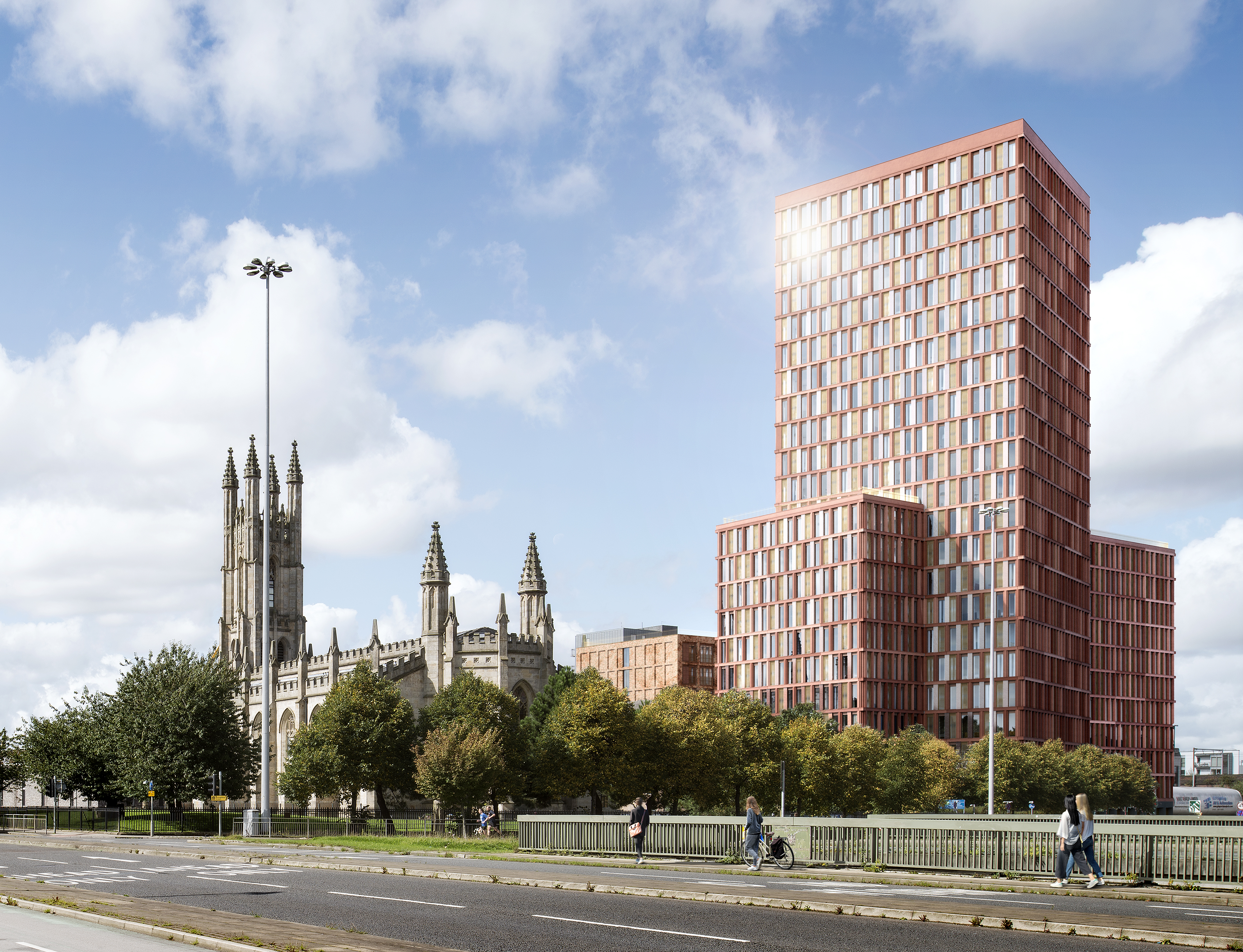 Building 2 is an 11 storey linear block with a 23 storey element set within the linear block. The tall element is shifted on grid to address the Mancunian Way and the city beyond. It features large scale full height façade components, with deep reveals to create a dynamic and animated impression that changes throughout the day. Its materiality is based on a simple palette comprising reconstituted stone mullions referencing the deep red and purple sandstone tones, textures and varying façade depths prevalent in many of the historic facades in Manchester. Recessed between the tight vertical grid are full height glazing and full height bronze coloured metal screens. At the lower levels facing the Mancunian Way, the screens conceal the acoustic attenuations to the opening rapid vents. Elsewhere, they guard the glazed opening doors and conceal duct work above the windows.