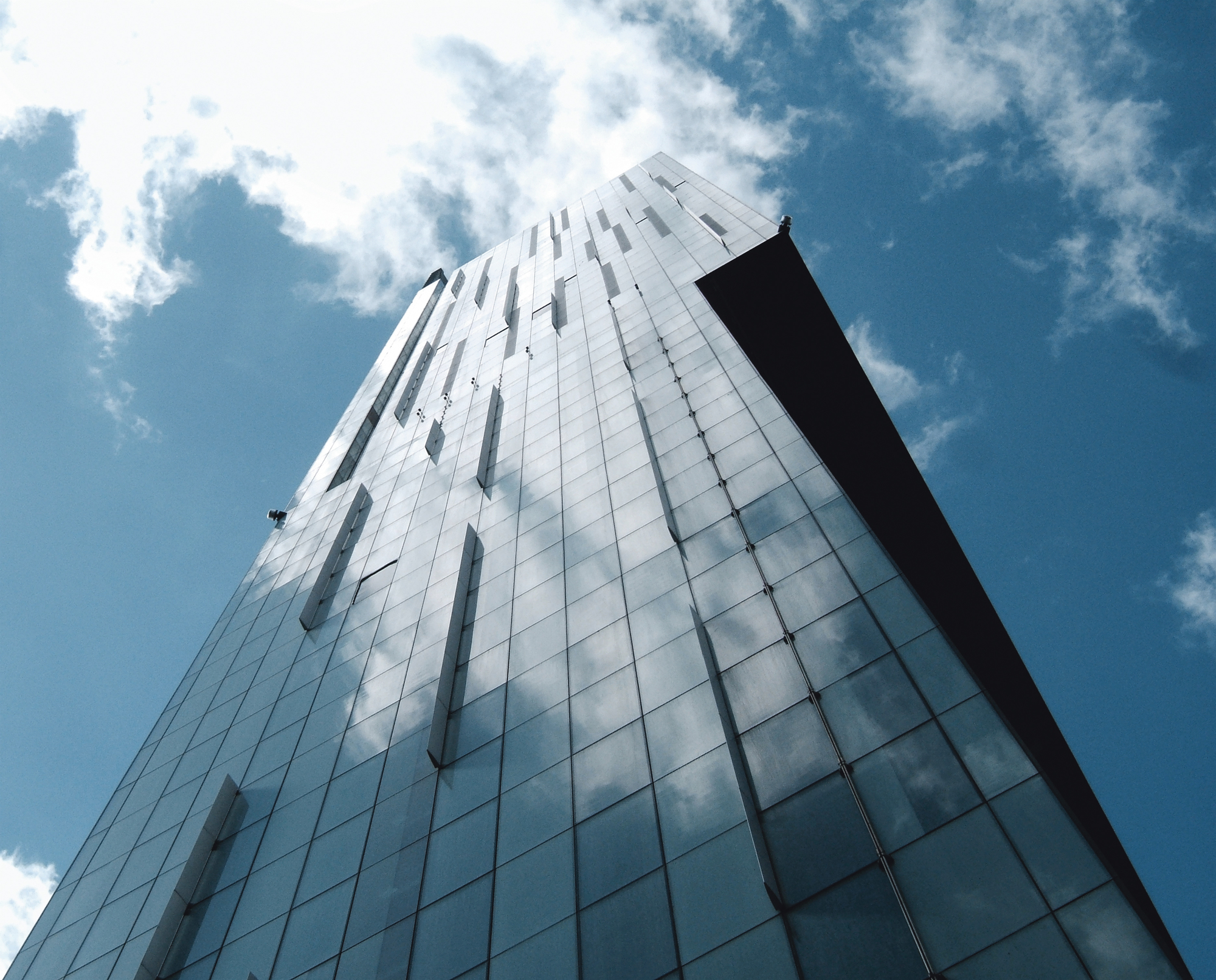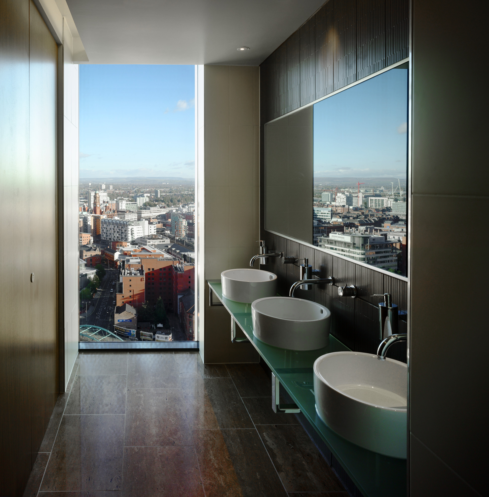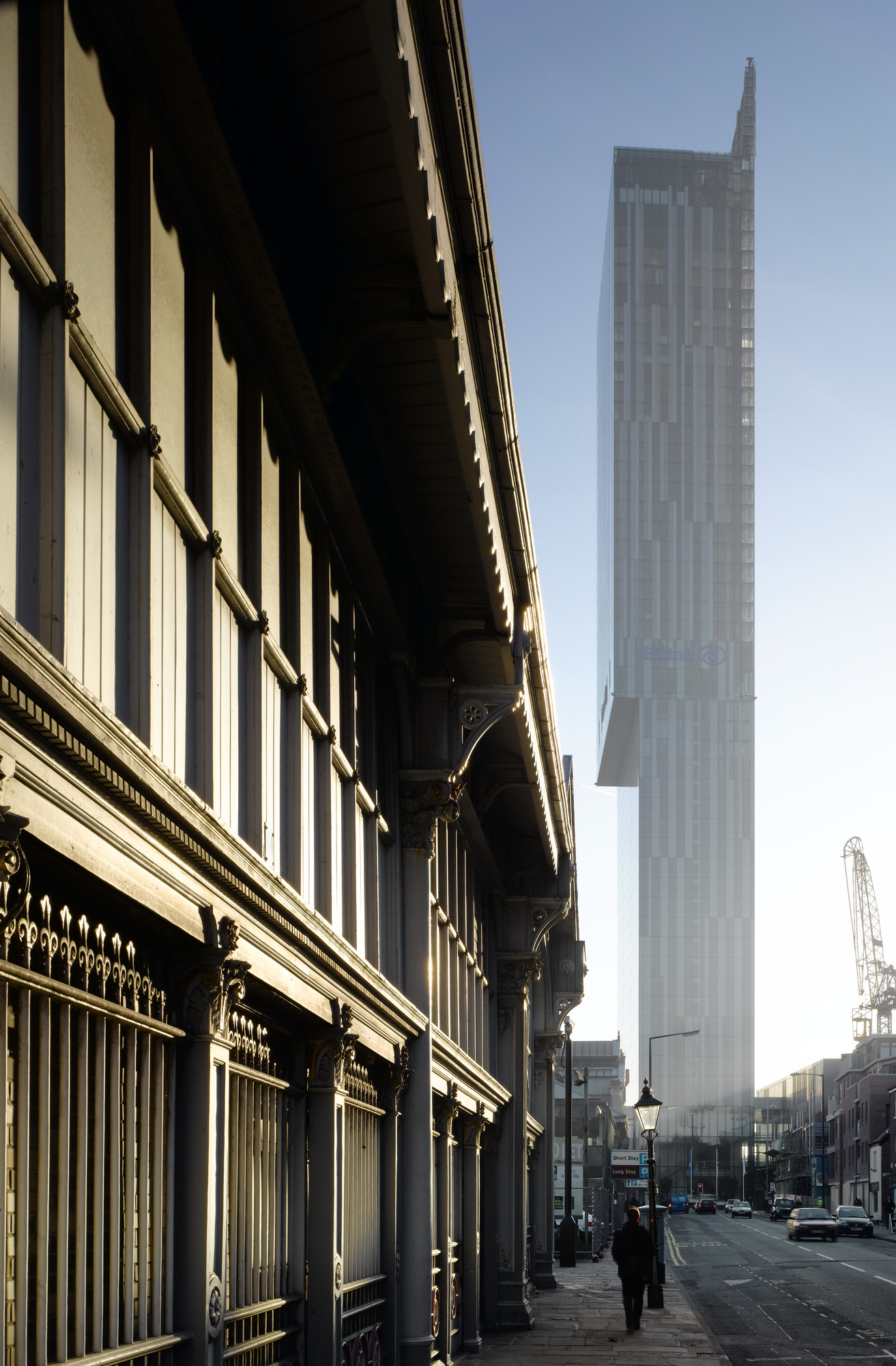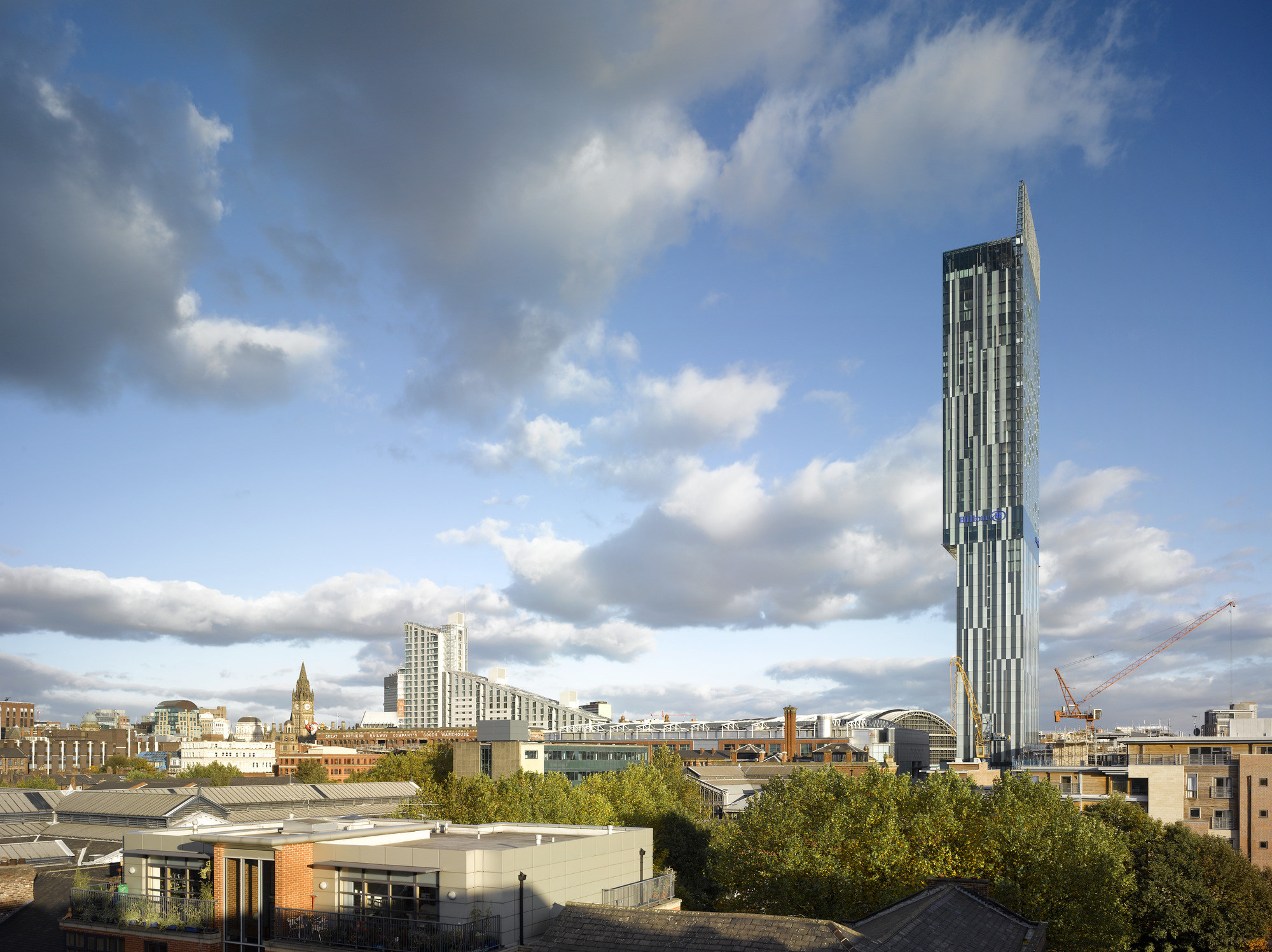 The tower is orientated on the major urban axes of Deansgate and Liverpool Road that link its site visually to the city-centre and beyond the city to the West. The silhouette of the crystalline elegance of the tower is completed by a slender glazed ‘blade’ that stretches skywards.